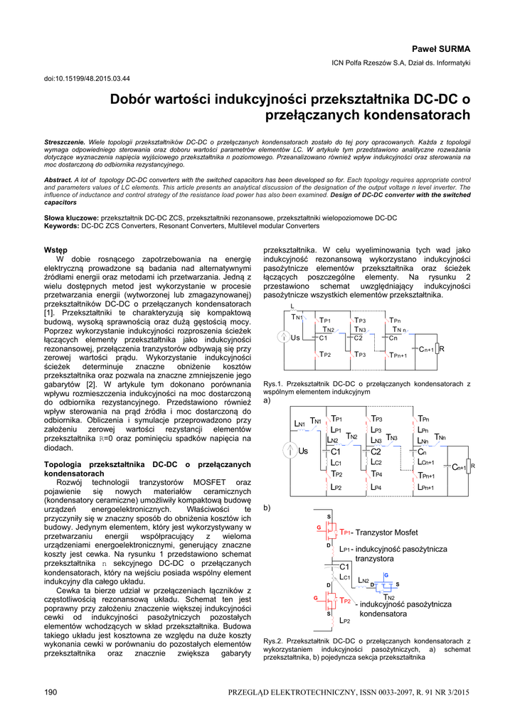 Paweł SURMA ICN Polfa Rzeszów S.A, Dział ds. Informatyki doi:10.15199/48.2015.03.44 Dobór wartości indukcyjności przekształtnika DC-DC o przełączanych kondensatorach Streszczenie. Wiele topologii przekształtników DC-DC o przełączanych kondensatorach zostało do tej pory opracowanych. Każda z topologii wymaga odpowiedniego sterowania oraz doboru wartości parametrów elementów LC. W artykule tym przedstawiono analityczne rozważania dotyczące wyznaczenia napięcia wyjściowego przekształtnika n poziomowego. Przeanalizowano również wpływ indukcyjności oraz sterowania na moc dostarczoną do odbiornika rezystancyjnego. Abstract. A lot of topology DC-DC converters with the switched capacitors has been developed so for. Each topology requires appropriate control and parameters values of LC elements. This article presents an analytical discussion of the designation of the output voltage n level inverter. The influence of inductance and control strategy of the resistance load power has also been examined. Design of DC-DC converter with the switched capacitors Słowa kluczowe: przekształtnik DC-DC ZCS, przekształtniki rezonansowe, przekształtniki wielopoziomowe DC-DC Keywords: DC-DC ZCS Converters, Resonant Converters, Multilevel modular Converters Wstęp W dobie rosnącego zapotrzebowania na energię elektryczną prowadzone są badania nad alternatywnymi źródłami energii oraz metodami ich przetwarzania. Jedną z wielu dostępnych metod jest wykorzystanie w procesie przetwarzania energii (wytworzonej lub zmagazynowanej) przekształtników DC-DC o przełączanych kondensatorach [1]. Przekształtniki te charakteryzują się kompaktową budową, wysoką sprawnością oraz dużą gęstością mocy. Poprzez wykorzystanie indukcyjności rozproszenia ścieżek łączących elementy przekształtnika jako indukcyjności rezonansowej, przełączenia tranzystorów odbywają się przy zerowej wartości prądu. Wykorzystanie indukcyjności ścieżek determinuje znaczne obniżenie kosztów przekształtnika oraz pozwala na znaczne zmniejszenie jego gabarytów [2]. W artykule tym dokonano porównania wpływu rozmieszczenia indukcyjności na moc dostarczoną do odbiornika rezystancyjnego. Przedstawiono również wpływ sterowania na prąd źródła i moc dostarczoną do odbiornika. Obliczenia i symulacje przeprowadzono przy założeniu zerowej wartości rezystancji elementów przekształtnika R=0 oraz pominięciu spadków napięcia na diodach. Topologia przekształtnika DC-DC o przełączanych kondensatorach Rozwój technologii tranzystorów MOSFET oraz pojawienie się nowych materiałów ceramicznych (kondensatory ceramiczne) umożliwiły kompaktową budowę urządzeń energoelektronicznych. Właściwości te przyczyniły się w znaczny sposób do obniżenia kosztów ich budowy. Jedynym elementem, który jest wykorzystywany w przetwarzaniu energii współpracujący z wieloma urządzeniami energoelektronicznymi, generujący znaczne koszty jest cewka. Na rysunku 1 przedstawiono schemat przekształtnika n sekcyjnego DC-DC o przełączanych kondensatorach, który na wejściu posiada wspólny element indukcyjny dla całego układu. Cewka ta bierze udział w przełączeniach łączników z częstotliwością rezonansową układu. Schemat ten jest poprawny przy założeniu znaczenie większej indukcyjności cewki od indukcyjności pasożytniczych pozostałych elementów wchodzących w skład przekształtnika. Budowa takiego układu jest kosztowna ze względu na duże koszty wykonania cewki w porównaniu do pozostałych elementów przekształtnika oraz znacznie zwiększa gabaryty przekształtnika. W celu wyeliminowania tych wad jako indukcyjność rezonansową wykorzystano indukcyjności pasożytnicze elementów przekształtnika oraz ścieżek łączących poszczególne elementy. Na rysunku 2 przestawiono schemat uwzględniający indukcyjności pasożytnicze wszystkich elementów przekształtnika. L T N1 Us T P1 T N2 T P3 T N3 T Pn TN n C1 C2 Cn T P2 T P3 T Pn+1 C n+1 R Rys.1. Przekształtnik DC-DC o przełączanych kondensatorach z wspólnym elementem indukcyjnym a) LN1 TN1 Us TP1 LP1 LN2 TN2 C1 LC1 TP2 LP2 b) TP3 LP3 LN3 TN3 C2 LC2 TP4 LP4 TPn LPn LNn TNn Cn LCn+1 TPn+1 LPn+1 Cn+1 R S G TP1- Tranzystor Mosfet D D G S LP1 - indukcyjność pasożytnicza tranzystora C1 G LC1 LN2 D S TN2 TP2 - indukcyjność pasożytnicza kondensatora LP2 Rys.2. Przekształtnik DC-DC o przełączanych kondensatorach z wykorzystaniem indukcyjności pasożytniczych, a) schemat przekształtnika, b) pojedyncza sekcja przekształtnika 190 PRZEGLĄD ELEKTROTECHNICZNY, ISSN 0033-2097, R. 91 NR 3/2015 W układzie tym dominującą indukcyjnością jest indukcyjność kondensatora, która we współczesnych kondensatorach zawiera się w granicach 10÷100 nH. W celu zwiększenia wartości indukcyjności można wyprofilować odpowiednio doprowadzenia kondensatora, jak również odpowiednio zaprojektować ścieżki na płycie PCB. Uwarunkowania te podczas projektowania z góry determinują wartość indukcyjności. Wykorzystanie indukcyjności pasożytniczych elementów wchodzących w skład przekształtnika oraz ścieżek łączących te elementy powoduje zmniejszenie strat, które ograniczają się przede wszystkim do strat przewodzenia łączników, kondensatorów oraz ścieżek łączących te elementy. Jako elementy przełączające można wykorzystać tranzystory MOSFET, jak to przedstawiono na rysunku 2. Napięcie wyjściowe przekształtnika DC-DC o przełączanych kondensatorach Podczas projektowania przekształtnika jednym z podstawowych parametrów jest wartość napięcia wyjściowego U d. Przekształtniki DC-DC ZCS wykorzystywane są do podwyższania, jak i do obniżania napięcia wejściowego [3]. W celu wyznaczenia napięcia wyjściowego przekształtnika n poziomowego należy rozważyć proces ładowania i rozładowania kondensatorów. Cykl pracy przekształtnika polega na naprzemiennym ładowaniu i rozładowan