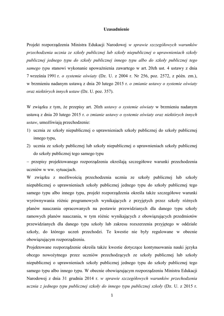 Uzasadnienie Projekt rozporządzenia Ministra Edukacji Narodowej w sprawie szczegółowych warunków przechodzenia ucznia ze szkoły publicznej lub szkoły niepublicznej o uprawnieniach szkoły publicznej jednego typu do szkoły publicznej innego typu albo do szkoły publicznej tego samego typu stanowi wykonanie upoważnienia zawartego w art. 20zh ust. 4 ustawy z dnia 7 września 1991 r. o systemie oświaty (Dz. U. z 2004 r. Nr 256, poz. 2572, z późn. zm.), w brzmieniu nadanym ustawą z dnia 20 lutego 2015 r. o zmianie ustawy o systemie oświaty oraz niektórych innych ustaw (Dz. U. poz. 357). W związku z tym, że przepisy art. 20zh ustawy o systemie oświaty w brzmieniu nadanym ustawą z dnia 20 lutego 2015 r. o zmianie ustawy o systemie oświaty oraz niektórych innych ustaw, umożliwiają przechodzenie: 1) ucznia ze szkoły niepublicznej o uprawnieniach szkoły publicznej do szkoły publicznej innego typu, 2) ucznia ze szkoły publicznej lub szkoły niepublicznej o uprawnieniach szkoły publicznej do szkoły publicznej tego samego typu przepisy projektowanego rozporządzenia określają szczegółowe warunki przechodzenia uczniów w ww. sytuacjach. W związku z możliwością przechodzenia ucznia ze szkoły publicznej lub szkoły niepublicznej o uprawnieniach szkoły publicznej jednego typu do szkoły publicznej tego samego typu albo innego typu, projekt rozporządzenia określa także szczegółowe warunki wyrównywania różnic programowych wynikających z przyjętych przez szkoły różnych planów nauczania opracowanych na postawie przewidzianych dla danego typu szkoły ramowych planów nauczania, w tym różnic wynikających z obowiązujących przedmiotów przewidzianych dla danego typu szkoły lub zakresu rozszerzenia przyjętego w oddziale szkoły, do którego uczeń przechodzi. Te kwestie nie były regulowane w obecnie obowiązującym rozporządzeniu. Projektowane rozporządzenie określa także kwestie dotyczące kontynuowania nauki języka obcego nowożytnego przez uczniów przechodzących ze szkoły publicznej lub szkoły niepublicznej o uprawnieniach szkoły publicznej jednego typu do szkoły publicznej tego samego typu albo innego typu. W obecnie obowiązującym rozporządzeniu Ministra Edukacji Narodowej z dnia 31 grudnia 2014 r. w sprawie szczegółowych warunków przechodzenia ucznia z jednego typu publicznej szkoły do innego typu publicznej szkoły (Dz. U. z 2015 r. 1 poz. 24), ta kwestia była uregulowana jedynie w stosunku do uczniów zmieniających typ szkoły publicznej. W przypadku przechodzenia ucznia z jednej publicznej szkoły artystycznej do innej publicznej szkoły artystycznej – podstawowe warunki zostały określone w art. 20n ust. 9 ustawy o systemie oświaty, natomiast szczegółowe warunki przechodzenia do publicznej szkoły artystycznej reguluje wydane na podstawie art. 20n ust. 10 ustawy o systemie oświaty rozporządzenie Ministra Kultury i Dziedzictwa Narodowego z dnia 15 maja 2014 r. w sprawie warunków i trybu przyjmowania uczniów do publicznych szkół i publicznych placówek artystycznych oraz przechodzenia z jednych typów szkół do innych (Dz. U. poz. 686). Podstawowe warunki przechodzenia ucznia ze: 1) szkoły publicznej lub szkoły niepublicznej o uprawnieniach szkoły publicznej jednego typu albo 2) szkoły niepublicznej nieposiadającej uprawnień szkoły publicznej do szkoły publicznej innego typu albo do szkoły publicznej tego samego typu określa art. 20zh ust. 13a ustawy o systemie oświaty. W przypadku zasadniczej szkoły zawodowej, publicznej lub niepublicznej o uprawnieniach szkoły publicznej, projekt w § 2 ust. 1 pkt 1 i 2 zakłada, że uczeń każdej klasy tej szkoły będzie mógł być przyjęty do klasy I publicznego liceum ogólnokształcącego lub klasy I publicznego technikum, ponieważ podstawa programowa kształcenia ogólnego w zasadniczej szkole zawodowej odpowiada podstawie programowej kształcenia ogólnego w klasie I publicznego liceum ogólnokształcącego i klasie I publicznego technikum. Ponadto, § 2 ust. 1 pkt 3 przewiduje możliwość przejścia ucznia klasy III zasadniczej szkoły zawodowej, publicznej lub niepublicznej o uprawnieniach szkoły publicznej, do klasy II publicznego technikum w zawodzie, w którym wyodrębniono kwalifikację wspólną z zawodem, w którym kształcenie realizowane było w zasadniczej szkole zawodowej. Zgodnie z rozporządzeniem Ministra Edukacji Narodowej z dnia 23 grudnia 2011 r. w sprawie klasyfikacji zawodów szkolnictwa zawodowego (Dz. U. z 2012 r. poz. 7, z późn. zm.), w zawodach nauczanych w technikum pierwszą kwalifikacją jest na ogół kwalifikacja ustalona dla zawodu nauczanego w zasadniczej szkole zawodowej, a stanowiąca merytoryczną i programową podbudowę do nabywania kolejnych – wyższych – kwalifikacji w zawodzie w ramach tego samego obszaru 2 kształcenia. Natomiast w przypadku zawodów dwukwalifikacyjnych w zasadniczej szkole zawodowej, publicznej lub niepublicznej o uprawnieniach szkoły publicznej, uczeń klasy III tej szkoły w wielu przypadkach będzie miał już potwierdzoną pierwszą kwalifikację. W przypadku technikum publicznego lub niepublicznego o uprawnieniach szkoły publicznej, projekt w § 2 ust. 1 pkt 4–8 zakłada, że uczeń: 1) klasy I tego technikum będzie mógł być przyjęty do klasy I publicznej zasadniczej szkoły zawodowej, 2) klasy I albo II tego technikum będzie mógł być przyjęty do klasy I publicznego liceum ogólnokształcącego, 3) klasy II tego technikum może być przyjęty do klasy II publicznej zasadniczej szkoły zawodowej w zawodzie, w którym wyodrębniono kwalifikację wspólną z zawodem, w którym kształcenie realizowane było w technikum, 4) klasy III tego technikum będzie mógł być przyjęty do klasy II publicznego liceum ogólnokształcącego albo do klasy III publicznej zasadniczej szkoły zawodowej w zawodzie, w którym wyodrębniono kwalifikację wspólną z zawodem, w którym kształce
