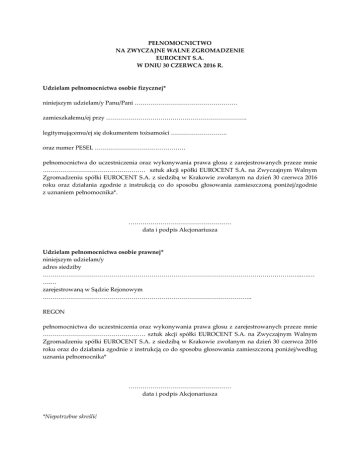 PEŁNOMOCNICTWO NA ZWYCZAJNE WALNE ZGROMADZENIE EUROCENT S.A. W DNIU 30 CZERWCA 2016 R. Udzielam pełnomocnictwa osobie fizycznej* niniejszym udzielam/y Panu/Pani …………………………………………… zamieszkałemu/ej przy ……………………………………………………………. legitymującemu/ej się dokumentem tożsamości ………………………. oraz numer PESEL ……………………………………… pełnomocnictwa do uczestniczenia oraz wykonywania prawa głosu z zarejestrowanych przeze mnie …………………………………………… sztuk akcji spółki EUROCENT S.A. na Zwyczajnym Walnym Zgromadzeniu spółki EUROCENT S.A. z siedzibą w Krakowie zwołanym na dzień 30 czerwca 2016 roku oraz działania zgodnie z instrukcją co do sposobu głosowania zamieszczoną poniżej/zgodnie z uznaniem pełnomocnika*. …………………………………………… data i podpis Akcjonariusza Udzielam pełnomocnictwa osobie prawnej* niniejszym udzielam/y adres siedziby …………………………………………………………………………………………………………….…..….… ….… zarejestrowaną w Sądzie Rejonowym ………………………………………………………………………………………….. REGON pełnomocnictwa do uczestniczenia oraz wykonywania prawa głosu z zarejestrowanych przeze mnie …………………………………………… sztuk akcji spółki EUROCENT S.A. na Zwyczajnym Walnym Zgromadzeniu spółki EUROCENT S.A. z siedzibą w Krakowie zwołanym na dzień 30 czerwca 2016 roku oraz do działania zgodnie z instrukcją co do sposobu głosowania zamieszczoną poniżej/według uznania pełnomocnika* …………………………………………… data i podpis Akcjonariusza *Niepotrzebne skreślić Akcjonariusz upoważnia niniejszym Pełnomocnika do uczestniczenia w Zwyczajnym Walnym Zgromadzeniu EUROCENT S.A. zwołanym na dzień 30 czerwca 2016 na godzinę 12:00 (dalej: „ZWZ”) i wykonywania prawa głosu na ZWZ z akcji przysługujących Akcjonariuszowi, zgodnie z poniższą instrukcją: INSTRUKCJA DOTYCZĄCA SPOSOBU GŁOSOWANIA NA ZWYCZAJNYM WALNYM ZGROMADZENIU W DNIU 30 CZERWCA 2016 R. Określenie sposobu głosowania następuje poprzez zakreślenie znakiem „X” odpowiedniego pola obok każdej z uchwał. W przypadku wyboru głosu „przeciw” należy określić poprzez zakreślenie odpowiedniego pola, czy Pełnomocnik ma zgłosić sprzeciw wobec danej uchwały. W razie nie określenia sposobu głosowania Pełnomocnik uprawniony będzie do głosowania według własnego uznania. Pełna treść projektów uchwał Zgromadzenia zamieszczona jest na stronie internetowej www.eurocent.pl (z uwagi na obszerność części z powyższych uchwał przytoczona treść ogranicza się do najistotniejszych zapisów). NUMER UCHWAŁY 1 2 3 4 5 6 7 8 9 10 11 12 13 14 15 TREŚĆ UCHWAŁY w sprawie wyboru Przewodniczącego Walnego Zgromadzenia w sprawie wyboru komisji skrutacyjnej ZA Zwyczajnego w sprawie przyjęcia porządku obrad Zwyczajnego Walnego Zgromadzenia w sprawie zatwierdzenia skonsolidowanego sprawozdania finansowego za okres od dnia 1 stycznia 2014 roku do dnia 31 grudnia 2014 roku w sprawie zatwierdzenia sprawozdania Zarządu z działalności grupy kapitałowej Spółki za okres od dnia 1 stycznia 2014 roku do dnia 31 grudnia 2014 roku w sprawie zatwierdzenia skonsolidowanego sprawozdania finansowego za okres od dnia 1 stycznia 2015 roku do dnia 31 grudnia 2015 roku w sprawie zatwierdzenia sprawozdania Zarządu z działalności grupy kapitałowej Spółki za okres od dnia 1 stycznia 2015 roku do dnia 31 grudnia 2015 roku w sprawie zatwierdzenia sprawozdania Zarządu z działalności za okres od dnia 1 stycznia 2015 roku do dnia 31 grudnia 2015 roku w sprawie zatwierdzenia sprawozdania finansowego za okres od dnia 1 stycznia 2015 do dnia 31 grudnia 2015 roku W sprawie pokrycia starty netto Spółki za rok 2015 w sprawie udzielenia absolutorium Prezesowi Zarządu Spółki Grzegorzowi Kolawie z wykonania obowiązków w roku 2015 w sprawie udzielenia absolutorium Członkowi Zarządu Spółki Celinie Kolawie z wykonania obowiązków w roku 2015 w sprawie udzielenia absolutorium Członkowi Zarządu Spółki Weronice Wituszyńskiej z wykonania obowiązków w roku 2015 w sprawie udzielenia absolutorium Członkowi Zarządu Spółki Pawłowi Przybyle z wykonania obowiązków w roku 2015 w sprawie udzielenia absolutorium Przewodniczącemu Rady Nadzorczej Spółki Rafałowi Paluchowi z wykonania obowiązków w roku 2015 PRZECIW Z WPISEM BEZ WPISU SPRZECIWU SPRZECIWU WSTRZYMUJĘ SIĘ 16 17 18 19 20 21 22 23 w sprawie udzielenia absolutorium Przewodniczącemu Rady Nadzorczej Spółki Marcinowi Tokarkowi z wykonania obowiązków w roku 2015 w sprawie udzielenia absolutorium Wiceprzewodniczącemu Rady Nadzorczej Spółki Pawłowi Bębenkowi z wykonania obowiązków w roku 2015 w sprawie udzielenia absolutorium Wiceprzewodniczącej Rady Nadzorczej Spółki Celinie Kolawie z wykonania obowiązków w roku 2015 w sprawie udzielenia absolutorium Sekretarzowi Rady Nadzorczej Spółki Michałowi Kolawie z wykonania obowiązków w roku 2015 w sprawie udzielenia absolutorium Członkowi Rady Nadzorczej Spółki Tomaszowi Musiałowi z wykonania obowiązków w roku 2015 w sprawie udzielenia absolutorium Członkowi Rady Nadzorczej Spółki Wojciechowi Moskale z wykonania obowiązków w roku 2015 w sprawie powołania Członka Rady Nadzorczej 27 w sprawie powołania Członka Rady Marcina Tokarka na kolejną kadencję w sprawie powołania Członka Rady Celiny Kolawy na kolejną kadencję w sprawie powołania Członka Rady Michała Kolawy na kolejną kadencję w sprawie powołania Członka Rady Wojciecha Moskały na kolejną kadencję w sprawie zmiany § 14 Statutu Spółki 28 w sprawie ustalenia tekstu jednolitego Statutu Spółki 24 25 26 Nadzorczej Spółki Nadzorczej Spółki Nadzorczej Spół