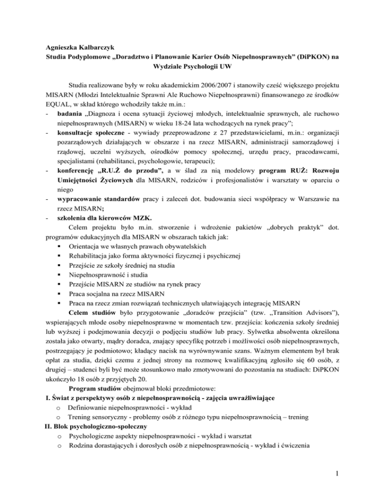 Agnieszka Kalbarczyk Studia Podyplomowe „Doradztwo i Planowanie Karier Osób Niepełnosprawnych” (DiPKON) na Wydziale Psychologii UW Studia realizowane były w roku akademickim 2006/2007 i stanowiły cześć większego projektu MISARN (Młodzi Intelektualnie Sprawni Ale Ruchowo Niepełnosprawni) finansowanego ze środków EQUAL, w skład którego wchodziły takŜe m.in.: - badania „Diagnoza i ocena sytuacji Ŝyciowej młodych, intelektualnie sprawnych, ale ruchowo niepełnosprawnych (MISARN) w wieku 18-24 lata wchodzących na rynek pracy”; - konsultacje społeczne - wywiady przeprowadzone z 27 przedstawicielami, m.in.: organizacji pozarządowych działających w obszarze i na rzecz MISARN, administracji samorządowej i rządowej, uczelni wyŜszych, ośrodków pomocy społecznej, urzędu pracy, pracodawcami, specjalistami (rehabilitanci, psychologowie, terapeuci); - konferencję „R.U.ś do przodu”, a w ślad za nią modelowy program RUś: Rozwoju Umiejętności śyciowych dla MISARN, rodziców i profesjonalistów i warsztaty w oparciu o niego - wypracowanie standardów pracy i zaleceń dot. budowania sieci współpracy w Warszawie na rzecz MISARN; - szkolenia dla kierowców MZK. Celem projektu było m.in. stworzenie i wdroŜenie pakietów „dobrych praktyk” dot. programów edukacyjnych dla MISARN w obszarach takich jak: Orientacja we własnych prawach obywatelskich Rehabilitacja jako forma aktywności fizycznej i psychicznej Przejście ze szkoły średniej na studia Niepełnosprawność i studia Przejście MISARN ze studiów na rynek pracy Praca socjalna na rzecz MISARN Praca na rzecz zmian rozwiązań technicznych ułatwiających integrację MISARN Celem studiów było przygotowanie „doradców przejścia” (tzw. „Transition Advisors”), wspierających młode osoby niepełnosprawne w momentach tzw. przejścia: kończenia szkoły średniej lub wyŜszej i podejmowania decyzji o podjęciu studiów lub pracy. Sylwetka absolwenta określona została jako otwarty, mądry doradca, znający specyfikę potrzeb i moŜliwości osób niepełnosprawnych, postrzegający je podmiotowo; kładący nacisk na wyrównywanie szans. WaŜnym elementem był brak opłat za studia, dzięki czemu z jednej strony na rozmowę kwalifikacyjną zgłosiło się 60 osób, z drugiej – studenci byli być moŜe stosunkowo mało zmotywowani do pozostania na studiach: DiPKON ukończyło 18 osób z przyjętych 20. Program studiów obejmował bloki przedmiotowe: I. Świat z perspektywy osób z niepełnosprawnością - zajęcia uwraŜliwiające o Definiowanie niepełnosprawności - wykład o Trening sensoryczny - problemy osób z róŜnego typu niepełnosprawnością – trening II. Blok psychologiczno-społeczny o Psychologiczne aspekty niepełnosprawności - wykład i warsztat o Rodzina dorastających i dorosłych osób z niepełnosprawnością - wykład i ćwiczenia 1 UtoŜsamianie się z grupą, wpływ toŜsamości społecznej na funkcjonowanie wśród ludzi seminarium o Psychologia stereotypów i uprzedzeń - wykład i ćwiczenia III. Poradnictwo zawodowe i planowanie kariery o Planowanie kariery i rozwoju zawodowego - wykład i ćwiczenia o Z punktu widzenia praktyka... - zajęcia z doradcami zawodowymi pracującymi z osobami niepełnosprawnymi o Nowoczesne technologie wspomagające osoby niepełnosprawne - warsztat IV. Umiejętności potrzebne w pracy doradcy o Warsztat ogólny dotyczący postrzegania doradcy o Motywacja i motywowanie - wykład i seminarium o Współpraca, rozwiązywanie konfliktów, mediacje oraz umiejętności negocjacyjne - wykład o Wywieranie wpływu społecznego – warsztat i ćwiczenia o Wywiad psychologiczny - warsztat o Rozwijanie samowiedzy i samoświadomości, autopercepcja - seminarium o Umiejętność autoprezentacji, świadomość siebie osoby niepełnosprawnej - ćwiczenia o Radzenie sobie w sytuacji trudnej – warsztat V. Blok prawno-etyczny o Rozwiązania prawne dotyczące osób niepełnosprawnych - wykład o Etyczne problemy doradztwa zawodowego - wykład Wraz z warsztatem ewaluacji zajęć studia objęły łącznie 411 godzin. VI. StaŜe Do programu studiów naleŜało indywidualne odbycie staŜu w dwóch ze wskazanych organizacji w łącznym wymiarze 15 (!) godzin: 1. Biuro ds. Osób Niepełnosprawnych UW; 2. Centrum karier osób niepełnosprawnych Fundacji na rzecz transportowych usług specjalistycznych dla niepełnosprawnych – TUS; 3. Centrum promocji i kariery zawodowej osób z dysfunkcją wzroku; 4. Polski związek niewidomych Ośrodek Doradztwa Zawodowego; 5. Fundacja pomocy matematykom i informatykom niepełnosprawnym ruchowo - biuro CUD przy FPMIINR; 6. Stowarzyszenie „Otwarte drzwi”; 7. Stowarzyszenie Przyjaciół Integracji. Na indywidualne prośby zostały teŜ zorganizowane staŜe w: - „Caritas” Diecezji ŁomŜyńskiej w ramach Warsztatów Aktywizacji Zawodowej „Indywidualne ŚcieŜki Kariery Zawodowej Szansą dla Osób Niepełnosprawnych”, - Warszawskim „Domu pod Fontanną” Zespołu Regionalnego Koalicji na rzecz Zdrowia Psychicznego - powiatowym urzędzie pracy w miejscu zamieszkania. Ocena studiów Ogólnie lepiej oceniane były zajęcia praktyczne (ćwiczenia, warsztaty) niŜ teoretyczne (wykłady, seminaria). Słuchacze wyraźnie byli nastawieni na zdobywanie umiejętności praktycznych, a nie wiedzy teoretycznej, często sugerowali zamienienie np. seminarium na warsztat. NajwyŜsze o 2 oceny uzyskał warsztat „Wywieranie wpływu społecznego” oraz ćwiczenia „Rodzina osób niepełnosprawnych”, które to przedmioty niektórzy słuchacze oceniali na 6 czy 10, czyli poza skalą odpowiedzi od 1 do 5. Wybrane uwagi krytyczne słuchaczy: a) niejasne, czym się róŜni doradca planowania kariery od doradcy zawodowego; b) na zajęciach została przekazana minimalna wiedza w zakresie doradztwa, pracy z klientem (brak informacji/wiedzy co konkretnie mam robić, jak mam zdiagnozować predyspozycje czy preferencje klienta, na tema