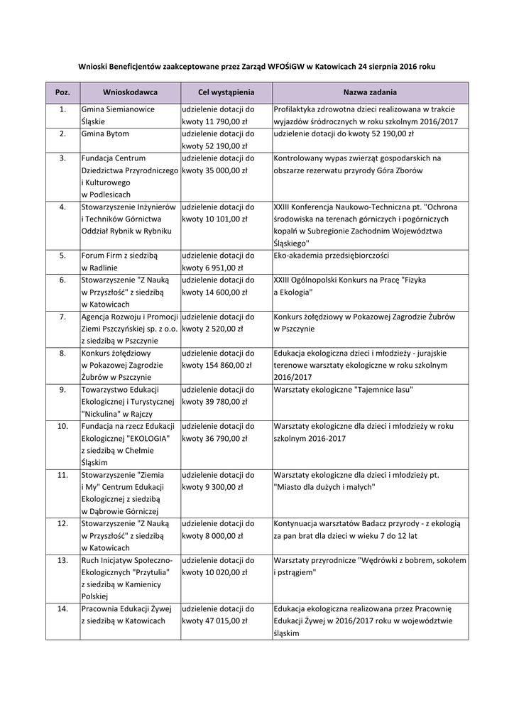 Wnioski Beneficjentów zaakceptowane przez Zarząd WFOŚiGW w Katowicach 24 sierpnia 2016 roku Poz. 1. 2. 3. 4. 5. 6. 7. 8. 9. 10. 11. 12. 13. 14. Wnioskodawca Cel wystąpienia Gmina Siemianowice Śląskie Gmina Bytom udzielenie dotacji do kwoty 11 790,00 zł udzielenie dotacji do kwoty 52 190,00 zł Fundacja Centrum udzielenie dotacji do Dziedzictwa Przyrodniczego kwoty 35 000,00 zł i Kulturowego w Podlesicach Stowarzyszenie Inżynierów udzielenie dotacji do i Techników Górnictwa kwoty 10 101,00 zł Oddział Rybnik w Rybniku Forum Firm z siedzibą w Radlinie Stowarzyszenie "Z Nauką w Przyszłość" z siedzibą w Katowicach Agencja Rozwoju i Promocji Ziemi Pszczyńskiej sp. z o.o. z siedzibą w Pszczynie Konkurs żołędziowy w Pokazowej Zagrodzie Żubrów w Pszczynie Towarzystwo Edukacji Ekologicznej i Turystycznej "Nickulina" w Rajczy Fundacja na rzecz Edukacji Ekologicznej "EKOLOGIA" z siedzibą w Chełmie Śląskim Stowarzyszenie "Ziemia i My" Centrum Edukacji Ekologicznej z siedzibą w Dąbrowie Górniczej Stowarzyszenie "Z Nauką w Przyszłość" z siedzibą w Katowicach Ruch Inicjatyw SpołecznoEkologicznych "Przytulia" z siedzibą w Kamienicy Polskiej Pracownia Edukacji Żywej z siedzibą w Katowicach udzielenie dotacji do kwoty 6 951,00 zł udzielenie dotacji do kwoty 14 600,00 zł Nazwa zadania Profilaktyka zdrowotna dzieci realizowana w trakcie wyjazdów śródrocznych w roku szkolnym 2016/2017 udzielenie dotacji do kwoty 52 190,00 zł Kontrolowany wypas zwierząt gospodarskich na obszarze rezerwatu przyrody Góra Zborów XXIII Konferencja Naukowo-Techniczna pt. "Ochrona środowiska na terenach górniczych i pogórniczych kopalń w Subregionie Zachodnim Województwa Śląskiego" Eko-akademia przedsiębiorczości XXIII Ogólnopolski Konkurs na Pracę "Fizyka a Ekologia" udzielenie dotacji do kwoty 2 520,00 zł Konkurs żołędziowy w Pokazowej Zagrodzie Żubrów w Pszczynie udzielenie dotacji do kwoty 154 860,00 zł Edukacja ekologiczna dzieci i młodzieży - jurajskie terenowe warsztaty ekologiczne w roku szkolnym 2016/2017 Warsztaty ekologiczne "Tajemnice lasu" udzielenie dotacji do kwoty 39 780,00 zł udzielenie dotacji do kwoty 36 790,00 zł Warsztaty ekologiczne dla dzieci i młodzieży w roku szkolnym 2016-2017 udzielenie dotacji do kwoty 9 300,00 zł Warsztaty ekologiczne dla dzieci i młodzieży pt. "Miasto dla dużych i małych" udzielenie dotacji do kwoty 8 000,00 zł Kontynuacja warsztatów Badacz przyrody - z ekologią za pan brat dla dzieci w wieku 7 do 12 lat udzielenie dotacji do kwoty 10 020,00 zł Warsztaty przyrodnicze "Wędrówki z bobrem, sokołem i pstrągiem" udzielenie dotacji do kwoty 47 015,00 zł Edukacja ekologiczna realizowana przez Pracownię Edukacji Żywej w 2016/2017 roku w województwie śląskim Poz. Wnioskodawca 15. 17. Agencja Rozwoju i Promocji Ziemi Pszczyńskiej sp. z o.o. z siedzibą w Pszczynie Ośrodek Działań Ekologicznych "Źródła" z siedzibą w Łodzi Gmina Herby 18. Gmina Koszęcin 19. Gmina Lubomia 20. Gmina Marklowice 21. Gmina Węgierska Górka 22. Gmina Ciasna 16. Cel wystąpienia Nazwa zadania udzielenie dotacji do kwoty 22 279,04 zł Warsztaty edukacyjne "Tropem Żubra", "Sekrety Pszczół" i "Magia ziół" udzielenie dotacji do kwoty 9 120,00 zł Lekcje w naturze, czyli edukacja przyrodniczoekologiczna w terenie udzielenie dofinansowania w formie pożyczki do kwoty 40.317 zł. udzielenie dofinansowania w formie pożyczki do kwoty 148.500 zł. udzielenie dofinansowania w formie pożyczki do kwoty 245.000 zł udzielenie dofinansowania w formie pożyczki do kwoty 211.613 zł udzielenie dofinansowania w formie dotacji w kwocie do 22.233,15 zł udzielenie dofinansowania w formie dotacji w kwocie do 79.881,60 zł Termomodernizacja budynku komunalnego mieszkalnego zlokalizowanego w Hadrze przy ul. Koszęcińskiej 9a Modernizacja źródeł ciepła budynków indywidualnych realizowana w ramach Programu ograniczenia emisji dla Gminy Koszęcin - IX etap Program Ograniczenia Niskiej Emisji na terenie Gminy Lubomia w 2016 roku Program Ograniczenia Emisji w Gminie Marklowice Odbiór, transport oraz unieszkodliwienie odpadów niebezpiecznych zawierających azbest w postaci płyt azbestowo - cementowych płaskich i falistych z terenu gminy Węgierska Górka Usuwanie wyrobów zawierających azbest w gminie Ciasna etap I