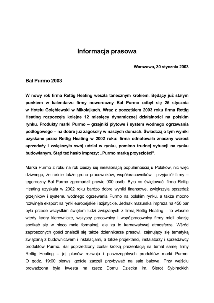 Informacja prasowa Warszawa, 30 stycznia 2003 Bal Purmo 2003 W nowy rok firma Rettig Heating weszła tanecznym krokiem. Będący już stałym punktem w kalendarzu firmy noworoczny Bal Purmo odbył się 25 stycznia w Hotelu Gołębiewski w Mikołajkach. Wraz z początkiem 2003 roku firma Rettig Heating rozpoczęła kolejne 12 miesięcy dynamicznej działalności na polskim rynku. Produkty marki Purmo – grzejniki płytowe i system wodnego ogrzewania podłogowego – na dobre już zagościły w naszych domach. Świadczą o tym wyniki uzyskane przez Rettig Heating w 2002 roku: firma odnotowała znaczny wzrost sprzedaży i zwiększyła swój udział w rynku, pomimo trudnej sytuacji na rynku budowlanym. Stąd też hasło imprezy: „Purmo marką przyszłości”. Marka Purmo z roku na rok cieszy się niesłabnącą popularnością u Polaków, nic więc dziwnego, że rośnie także grono pracowników, współpracowników i przyjaciół firmy – tegoroczny Bal Purmo zgromadził prawie 900 osób. Było co świętować: firma Rettig Heating uzyskała w 2002 roku bardzo dobre wyniki finansowe, zwiększyła sprzedaż grzejników i systemu wodnego ogrzewania Purmo na polskim rynku, a także mocno rozwinęła eksport na rynki europejskie i azjatyckie. Jednak mazurska impreza na 450 par była przede wszystkim świętem ludzi związanych z firmą Rettig Heating – to właśnie wtedy kadry kierownicze, wszyscy pracownicy i współpracownicy firmy mieli okazję spotkać się w nieco mnie formalnej, ale za to karnawałowej atmosferze. Wśród zaproszonych gości znaleźli się także dziennikarze prasowi, zajmujący się tematyką związaną z budownictwem i instalacjami, a także projektanci, instalatorzy i sprzedawcy produktów Purmo. Bal poprzedzony został krótką prezentacją na temat samej firmy Rettig Heating – jej planów rozwoju i poszczególnych produktów marki Purmo. O godz. 19:00 pierwsi goście zaczęli przybywać na salę balową. Przy wejściu prowadzona była kwesta na rzecz Domu Dziecka im. Sierot Sybirackich w Szymonowie koło Małdyt. Podobnie jak i w zeszłym roku, kiedy to zbierano pieniądze na rzecz tego ośrodka, nie trzeba było długo czekać na odzew zaproszonych gości. Na prośbę o pomoc potrzebującym dzieciom odpowiedzieli oni z otwartymi sercami, i co najważniejsze, z takimi też portfelami... Uczestników Balu przywitał Dyrektor Generalny firmy Rettig Heating – Pan Franciszek Plaskura. Podziękował on wszystkim tym, którzy przyczynili się do rynkowego sukcesu produktów Purmo: pracownikom i współpracownikom firmy, projektantom, sprzedawcom, dystrybutorom, a także dziennikarzom. Kilka minut po godz. 20:00 na scenie pojawiła się gwiazda wieczoru – Kayah. Wokalistka znana ze swego talentu do wprowadzania publiczności w atmosferę wspólnej zabawy nie zawiodła i tym razem. Pomogli jej w tym chętnie sami goście, których dwa razy prosić na parkiet nie było trzeba. Całości karnawałowej atmosfery dopełnił widowiskowy pokaz laserów. Przed północą Dyrektor ds. Sprzedaży i Marketingu firmy Rettig Heating – Pan Wojciech Makowski rozdał dyplomy najlepszym instalatorom, sprzedawcom i projektantom – efekt akcji Purmo Expert. Pracownicy zaskoczyli zaś Dyrekcję firmy miłą niespodzianką: był to ogromny tort wręczony za imponujące jak na ciężkie czasy wyniki sprzedaży. Tort miał znaczenie symboliczne – według odważnych życzeń załogi wszystkie jego kawałki, stanowiące udziały w rynku, mają przypaść w przyszłym roku firmie Rettig Heating Sp. z o.o... A tymczasem kawałki balowego tortu przypadły wszystkim uczestnikom imprezy, jako środek energetyzujący do dalszej zabawy. O północy ogłoszono wyniki sprzedaży losów w loterii charytatywnej. Wszystkie zebrane pieniądze zostały przekazane osieroconym dzieciom. W imieniu swoich podopiecznych symboliczny czek odebrała Pani Zofia Bagińska - dyrektor Domu Dziecka im. Sierot Sybirackich w Szymonowie k/ Małdyt. Loteria ta nie jest wydarzeniem przypadkowym – stanowi element stałej działalności charytatywnej i sponsoringowej firmy Rettig Heating. W trakcie ubiegłorocznego Balu Purmo również prowadzona była podobna loteria, a zebrane wtedy pieniądze pomogły wychowankom tego Domu Dziecka. Koncern Rettig Heating stale przeznacza ze swego budżetu znaczne środki na wsparcie m.in. ochrony zdrowia, nauki, kultury i fundacji działających na rzecz najbardziej potrzebujących. Przed północą Dyrektor ds. Sprzedaży i Marketingu firmy Rettig Heating – Pan Wojciech Makowski rozdał dyplomy najlepszym instalatorom, sprzedawcom i projektantom – efekt akcji Purmo Expert. O północy ogłoszono wyniki sprzedaży losów w loterii charytatywnej. Wszystkie zebrane pieniądze zostały przekazane osieroconym dzieciom. W imieniu swoich podopiecznych symboliczny czek odebrała Pani Zofia Bagińska - dyrektor Domu Dziecka im. Sierot Sybirackich w Szymonowie k/ Małdyt. Pokaz laserów Przy wejściu na salę balową prowadzona była kwesta na rzecz mazurskiego Domu Dziecka