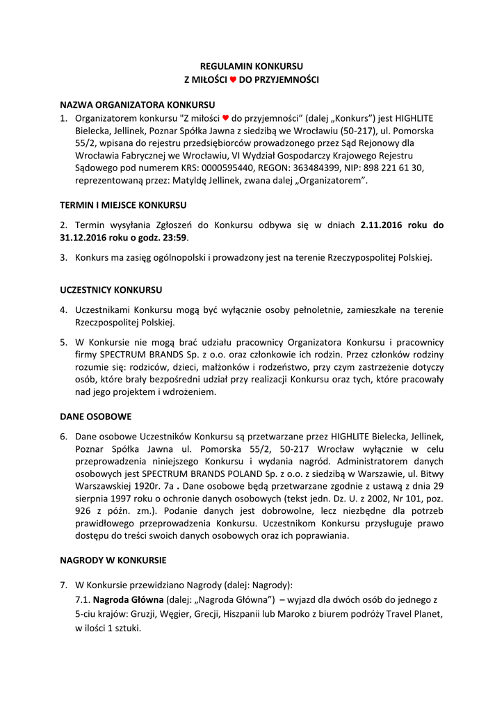 REGULAMIN KONKURSU Z MIŁOŚCI ♥ DO PRZYJEMNOŚCI NAZWA ORGANIZATORA KONKURSU 1. Organizatorem konkursu "Z miłości ♥ do przyjemności” (dalej „Konkurs”) jest HIGHLITE Bielecka, Jellinek, Poznar Spółka Jawna z siedzibą we Wrocławiu (50-217), ul. Pomorska 55/2, wpisana do rejestru przedsiębiorców prowadzonego przez Sąd Rejonowy dla Wrocławia Fabrycznej we Wrocławiu, VI Wydział Gospodarczy Krajowego Rejestru Sądowego pod numerem KRS: 0000595440, REGON: 363484399, NIP: 898 221 61 30, reprezentowaną przez: Matyldę Jellinek, zwana dalej „Organizatorem”. TERMIN I MIEJSCE KONKURSU 2. Termin wysyłania Zgłoszeo do Konkursu odbywa się w dniach 2.11.2016 roku do 31.12.2016 roku o godz. 23:59. 3. Konkurs ma zasięg ogólnopolski i prowadzony jest na terenie Rzeczypospolitej Polskiej. UCZESTNICY KONKURSU 4. Uczestnikami Konkursu mogą byd wyłącznie osoby pełnoletnie, zamieszkałe na terenie Rzeczpospolitej Polskiej. 5. W Konkursie nie mogą brad udziału pracownicy Organizatora Konkursu i pracownicy firmy SPECTRUM BRANDS Sp. z o.o. oraz członkowie ich rodzin. Przez członków rodziny rozumie się: rodziców, dzieci, małżonków i rodzeostwo, przy czym zastrzeżenie dotyczy osób, które brały bezpośredni udział przy realizacji Konkursu oraz tych, które pracowały nad jego projektem i wdrożeniem. DANE OSOBOWE 6. Dane osobowe Uczestników Konkursu są przetwarzane przez HIGHLITE Bielecka, Jellinek, Poznar Spółka Jawna ul. Pomorska 55/2, 50-217 Wrocław wyłącznie w celu przeprowadzenia niniejszego Konkursu i wydania nagród. Administratorem danych osobowych jest SPECTRUM BRANDS POLAND Sp. z o.o. z siedzibą w Warszawie, ul. Bitwy Warszawskiej 1920r. 7a . Dane osobowe będą przetwarzane zgodnie z ustawą z dnia 29 sierpnia 1997 roku o ochronie danych osobowych (tekst jedn. Dz. U. z 2002, Nr 101, poz. 926 z późn. zm.). Podanie danych jest dobrowolne, lecz niezbędne dla potrzeb prawidłowego przeprowadzenia Konkursu. Uczestnikom Konkursu przysługuje prawo dostępu do treści swoich danych osobowych oraz ich poprawiania. NAGRODY W KONKURSIE 7. W Konkursie przewidziano Nagrody (dalej: Nagrody): 7.1. Nagroda Główna (dalej: „Nagroda Główna”) – wyjazd dla dwóch osób do jednego z 5-ciu krajów: Gruzji, Węgier, Grecji, Hiszpanii lub Maroko z biurem podróży Travel Planet, w ilości 1 sztuki. a.) Na miejscu na zwycięzcę czekad będą warsztaty kulinarne z kuchni danego regionu, degustacja lokalnych przysmaków oraz win, a także zwiedzanie najpopularniejszych atrakcji. b.) Kierunek i termin wyjazdu zostaną ustalone bezpośrednio ze Zwycięzcą. c.) Nagroda Główna wystawiona jest na dane Uczestnika podane podczas rejestracji oraz wskazanej przez Uczestnika osoby towarzyszącej. Nie ma możliwości zamiany lub przeniesienia wygranej na osoby trzecie. 7.2. Nagrody Dodatkowe Ekspres do kawy RETRO Ribbon Red, o wartości 369 zł, w ilości 3 sztuk Ekspres do kawy RETRO Classic Noir, o wartości 369 zł, w ilości 3 sztuk Ekspres do kawy RETRO Vintage Cream, o wartości 369 zł, w ilości 3 sztuk Czajnik RETRO Classic Noir, o wartości 319 zł, w ilości 3 sztuk Czajnik RETRO Ribbon Red, o wartości 319 zł, w ilości 3 sztuk Czajnik RETRO Vintage Cream, o wartości 319 zł, w ilości 3 sztuk Toster RETRO Classic Noir, o wartości 319 zł, w ilości 3 sztuk Toster RETRO Ribbon Red, o wartości 319 zł, w ilości 3 sztuk Toster RETRO Vintage Cream, o wartości 319 zł, w ilości 3 sztuk 7.2.1. Nagrody Dodatkowe przyznawane będą co tydzieo, po jednej dla 3 najlepszych prac, według harmonogramu: 9 listopada 2016 – 3 Ekspresy RETRO Ribbon Red 16 listopada 2016 – 3 Czajniki RETRO Ribbon Red 23 listopada 2016 – 3 Tostery RETRO Ribbon Red 30 listopada 2016 – 3 Ekspresy RETRO Classic Noir 7 grudnia 2016 – 3 Czajniki RETRO Classic Noir 14 grudnia 2016 – 3 Tostery RETRO Classic Noir 21 grudnia 2016 – 3 Ekspresy RETRO Vintage Cream 27 grudnia 2016 – 3 Czajniki RETRO Vintage Cream 4 stycznia 2017 – 3 Tostery RETRO Vintage Cream 8. Do każdej z Nagród dołączona jest Nagroda Pieniężna stanowiąca równowartośd zryczałtowanego podatku dochodowego od wygranej. Nagroda Pieniężna nie zostanie wydana do rąk Uczestnika, lecz zostanie potrącona przez Organizatora i przeznaczona na pokrycie należnego podatku dochodowego od osób fizycznych od wygranej, na co Uczestnik biorąc udział w Konkursie wyraża zgodę. 9. Nagród nie można wymienid na gotówkę lub inne produkty marki Russell Hobbs. Nagrody nie można się też zrzec na rzecz innej osoby. WARUNKI UCZESTNICTWA W KONKURSIE 10. Aby wziąd udział w Konkursie Uczestnik zobowiązany jest spełnid łącznie poniższe warunki: a.) Nie później niż do 31.12.2016 r. do godz. 23:59 (włącznie) zarejestrowad się na stronie pl.russellhobbs.com/kocham-dom/, wypełniając elektroniczny formularz. b.) Podzielid się swoją codzienną drobną przyjemnością, która wywołuje uśmiech na twarzy. Zgłoszenie do Konkursu ma formę tekstu i zdjęcia. 11. Zwycięzca Konkursu zostanie wyłoniony przez Jury, w skład którego wchodzą przedstawiciele Organizatora i firmy Spectrum Brands Poland sp. z o.o. Jury dokonuje wyboru zwycięzców spośród wszystkich zgłoszeo do Konkursu w terminie 4 dni od zakooczenia Konkursu. 12. Laureaci Nagród Dodatkowych ogłaszani będą co tydzieo w trakcie Konkursu, w terminach: 9.11, 16.11, 23.11, 30.11, 7.12, 14.12, 21.12, 28.12, 4.01. 13. Kryterium oceny to: zgodnośd zgłoszenia z tematem Konkursu, ciekawy pomysł oraz estetyka. 14. Organizator zastrzega sobie prawo do usunięcia ze strony konkursowej zgłoszeo niezwiązanych z tematem Konkursu, zawierające treści obraźliwe lub obelżywe, naruszające czyjeś prawa autorskie; zawierające treści erotyczne, niecenzuralne, ośmieszające, nieprzyzwoite, naruszające powszechnie akceptowane zasady moralności, naruszające godnośd osobistą, nawiązania do symboli religijnych, etnicznych lub rasowych. 15. Na