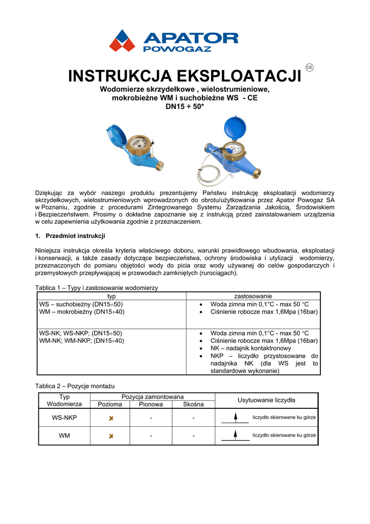 INSTRUKCJA EKSPLOATACJI CE Wodomierze skrzydełkowe , wielostrumieniowe, mokrobieżne WM i suchobieżne WS - CE DN15 ÷ 50* Dziękując za wybór naszego produktu prezentujemy Państwu instrukcję eksploatacji wodomierzy skrzydełkowych, wielostrumieniowych wprowadzonych do obrotu/użytkowania przez Apator Powogaz SA w Poznaniu, zgodnie z procedurami Zintegrowanego Systemu Zarządzania Jakością, Środowiskiem i Bezpieczeństwem. Prosimy o dokładne zapoznanie się z instrukcją przed zainstalowaniem urządzenia w celu zapewnienia użytkowania zgodnie z przeznaczeniem. 1. Przedmiot instrukcji Niniejsza instrukcja określa kryteria właściwego doboru, warunki prawidłowego wbudowania, eksploatacji i konserwacji, a także zasady dotyczące bezpieczeństwa, ochrony środowiska i utylizacji wodomierzy, przeznaczonych do pomiaru objętości wody do picia oraz wody używanej do celów gospodarczych i przemysłowych przepływającej w przewodach zamkniętych (rurociągach). Tablica 1 – Typy i zastosowanie wodomierzy typ WS – suchobieżny (DN1550) WM – mokrobieżny (DN1540) WS-NK; WS-NKP; (DN1550) WM-NK; WM-NKP; (DN1540) zastosowanie Woda zimna min 0,1°C - max 50 C Ciśnienie robocze max 1,6Mpa (16bar) Woda zimna min 0,1°C - max 50 C Ciśnienie robocze max 1,6Mpa (16bar) NK – nadajnik kontaktronowy NKP – liczydło przystosowane do nadajnika NK (dla WS jest to standardowe wykonanie) Tablica 2 – Pozycje montażu Typ Wodomierza Pozycja zamontowana Pozioma Pionowa Skośna WS-NKP - - liczydło skierowane ku górze WM - - liczydło skierowane ku górze Usytuowanie liczydła Przykładowe oznaczenie wodomierza WS, WM: typ ciągły strumień objętości (Q3) nadajnik impulsów; przystosowany do nadajnika impulsów -NKP (dla WS jako wersja standard) WM 6,3 -NK WS 6,3 -NKP Tablica 3 Wartości ciągłego strumienia objętości Q3 Typ WSwodomierza NKP WM Parametr Wielkość [mm] Q3 [dm3] Długość - Gwint [mm]-[‘’] 15 20 20 25 32 40 50* 2,5 2,5 4 6,3 10 16 165 i 190 - G¾“ 165 i 190 - G1” 190 - G1” 260 - G1¼“ 260 - G1½“ 300 - G2“ 300 - G2½“ 25 - 2. Dane techniczne - normy i przepisy Dane techniczne zawarte są w kartach katalogowych na poszczególne typy wodomierzy. Wodomierze spełniają wymagania norm i przepisów: 1. MID – Dyrektywa MID 2004/22/WE z 31.03.2004r. w sprawie przyrządów pomiarowych. 2. PN-EN-14154 normy zharmonizowane z dyrektywą 2004/22/EC Parlamentu Europejskiego i Rady Europy z dnia 31 marca 2004r. „MID” (Measuring Instruments Directive) 3. PN-ISO 4064 – Pomiar objętości wody w przewodach. Wodomierze do wody pitnej zimnej. 4. Rozporządzenie Ministra Gospodarki z 18.12.2006 w sprawie zasadniczych wymagań dla przyrządów pomiarowych z późniejszymi zmianami. 5. Rozporządzenie Ministra Gospodarki z 7.01.2008r. w sprawie prawnej kontroli metrologicznej przyrządów pomiarowych. 6. Rozporządzenie Ministra Gospodarki z 21.12.2007 w sprawie wymagań, którym powinny odpowiadać ciepłomierze i ich podzespoły dla szczegółowego zakresu sprawdzeń wykonanych podczas prawnej kontroli metrologicznej tych przyrządów pomiarowych. 7. Rozporządzenie Ministra Gospodarki z 13.02.2004 w sprawie wymagań metrologicznych, którym powinny odpowiadać ciepłomierze do wody i ich elementy. Produkowane wodomierze mogą posiadać inne długości wbudowania niż to przewiduje norma PN-ISO14154. Wynika to z określonych potrzeb użytkowników. Podstawowe wymagania dotyczące zabudowy wodomierzy zawarte są w normach: PN-B- 10720 - Wodociągi . Zabudowa zestawów wodomierzowych w instalacjach wodociągowych. Wymagania i badania przy odbiorze. PN-EN-14154 – 2 : Instalacja i warunki użytkowania. 3. Opis właściwego działania wodomierza Wodomierz wielostrumieniowy suchobieżny Wirnik wodomierza wielostrumieniowego napędzany jest kilkoma (wieloma) strumieniami wody równomiernie nacierającymi na skrzydełka wirnika po obwodzie i jest jedyną częścią ruchomą zanurzoną w wodzie. Obroty wirnika są przekazywane za pośrednictwem czołowego sprzęgła magnetycznego poprzez płytę uszczelniającą. Suche, hermetyzowane w osobnym module liczydło sumuje objętość mierzonej wody i wskazuje wynik w postaci cyfrowej - łatwej do odczytu. Liczydło jest wyposażone we wskaźnik ruchu umożliwiający automatyzację regulacji i legalizacji. Urządzenie regulacyjne zabezpieczone jest przed ingerencją osób niepowołanych plombą. Dzięki specjalnej konstrukcji łożysk wirnika oraz doborowi materiałów odpornych na korozję i ścieranie, wodomierz charakteryzuje się wysoką trwałością. Wodomierz wielostrumieniowy mokrobieżny Wirnik wodomierza wielostrumieniowego napędzany jest kilkoma (wieloma) strumieniami wody równomiernie nacierającymi na skrzydełka wirnika po obwodzie. Częściami zanurzonymi w wodzie są zarówno wirnik oraz mechanizm zliczający wraz z bębenkami lub w wersji z oddzieloną przestrzenią bębenków umieszczonych w glicerynie. Obroty wirnika są przekazywane za pośrednictwem przełożenia zębatego poprzez otwór w płycie dolnej mechanizmu zliczającego. Moduł liczydła sumuje objętość mierzonej wody i wskazuje wynik w postaci cyfrowej - łatwej do odczytu. Liczydło jest wyposażone we wskaźnik ruchu umożliwiający automatyzację regulacji i legalizacji. Urządzenie regulacyjne zabezpieczone jest przed ingerencją osób niepowołanych plombą. Dzięki specjalnej konstrukcji łożysk wirnika oraz doborowi materiałów odpornych na korozję i ścieranie, wodomierz charakteryzuje się wysoką trwałością. 4. Dobór właściwej wielkości wodomierza Za kryterium doboru właściwej wielkości (średnicy nominalnej) wodomierza powinny służyć zawsze warunki pracy wodomierza, tj. przeciętna oraz maksymalna wartość roboczego strumienia objętości przepływającej wody. Zbyt duży wodomierz nie tylko zwiększy koszt inwestycji, ale wykazuje mniejszą dokładność wskazań w okresach małego przepływu wody. Dobór zby