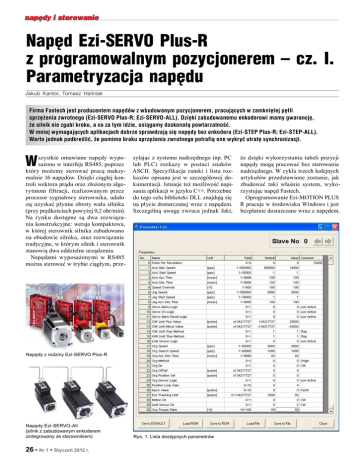 Napęd Ezi-SERVO Plus-R z programowalnym pozycjonerem – cz. I. Parametryzacja napędu Jakub Kantor, Tomasz Haliniak Firma Fastech jest producentem napędów z wbudowanym pozycjonerem, pracujących w zamkniętej pętli sprzężenia zwrotnego (Ezi-SERVO Plus-R; Ezi-SERVO-ALL). Dzięki zabudowanemu enkoderowi mamy gwarancję, że silnik nie zgubi kroku, a co za tym idzie, osiągamy doskonałą powtarzalność. W mniej wymagających aplikacjach dobrze sprawdzają się napędy bez enkodera (Ezi-STEP Plus-R; Ezi-STEP-ALL). Warto jednak podkreślić, że pomimo braku sprzężenia zwrotnego potrafią one wykryć utratę synchronizacji. W szystkie omawiane napędy wyposażono w interfejs RS485, poprzez który możemy sterować pracą maksymalnie 16 napędów. Dzięki ciągłej kontroli wektora prądu oraz złożonym algorytmom filtracji, realizowanym przez procesor sygnałowy sterownika, udało się uzyskać płynne obroty wału silnika (przy prędkościach powyżej 0,2 obr/min). Na rynku dostępne są dwa rozwiązania konstrukcyjne: wersja kompaktowa, w której sterownik silnika zabudowano na obudowie silnika, oraz rozwiązanie tradycyjne, w którym silnik i sterownik stanowią dwa oddzielne urządzenia. Napędami wyposażonymi w RS485 można sterować w trybie ciągłym, prze- syłając z systemu nadrzędnego (np. PC lub PLC) rozkazy w postaci znaków ASCII. Specyfikacja ramki i lista rozkazów opisana jest w szczegółowej dokumentacji. Istnieje też możliwość napisania aplikacji w języku C++. Potrzebne do tego celu biblioteki DLL znajdują się na płycie dostarczanej wraz z napędem. Szczególną uwagę zwraca jednak fakt, Napędy z rodziny Ezi-SERVO Plus-R Napędy Ezi-SERVO-All (silnik z zabudowanym enkoderem zintegrowany ze sterownikiem) 26 l Nr 1 l Styczeń 2012 r. Rys. 1. Lista dostępnych parametrów że dzięki wykorzystaniu tabeli pozycji napędy mogą pracować bez sterowania nadrzędnego. W cyklu trzech kolejnych artykułów przedstawione zostanie, jak zbudować taki właśnie system, wykorzystując napęd Fastech. Oprogramowanie Ezi-MOTION PLUS R pracuje w środowisku Windows i jest bezpłatnie dostarczane wraz z napędem. reklama Rys. 2. Bazowanie z wykorzystaniem czujnika bazy Za jego pomocą możliwa jest parametryzacja napędu, przypisanie odpowiednich funkcji wejściom i wyjściom cyfrowym oraz oczywiście stworzenie tabeli pozycji, w której zapisujemy swoją sekwencję najazdów. Tabela pozycji zapisywana jest w pamięci FLASH-ROM sterownika. Możemy ją uruchomić za pomocą interfejsu szeregowego lub za pomocą wejścia cyfrowego. Uzyskujemy w ten sposób pozycjoner, który może pracować bez potrzeby stosowania sterownika nadrzędnego. Po uruchomieniu aplikacji Ezi-MOTION PLUS R użytkownik jest proszony o podanie numeru portu oraz prędkości transmisji (domyślna prędkość to 115 200 bps) celem nawiązania połączenia z napędem. Po wskazaniu odpowiedniego portu i kliknięciu przycisku Connect (tzn. Połącz) łączymy się ze sterownikiem, przechodząc w tryb on line. Od tego momentu dostępne stają się wszystkie przyciski u góry ekranu. Pierwszym etapem jest parametryzacja. Po naciśnięciu przycisku Parameter List (lista parametrów) wyświetla się okno, w którym widoczne są wszystkie parametry napędu (rys. 1). Poszczególne kolumny oznaczają: numer parametru (No), jego nazwę (Name), jednostkę, w jakiej jest zapisany (Unit), zakres wartości (Field), wartość domyślną (Default), wartość ustawioną przez użytkownika (Value) oraz komentarz (Comment), w którym umieszczane są automatycznie informacje dodatkowe. Na początek zajmiemy się grupą parametrów związaną z bazowaniem napędu (od 17 do 24 oraz 30). Należą do nich: zz Org Speed (prędkość bazowania) – prędkość, z jaką napęd porusza się w kierunku punktu bazowego (oznaczonego czujnikiem); zz Org Search Speed (prędkość poszukiwania punktu bazowego) – prędkość, z jaką napęd dojeżdża precyzyjnie do punktu bazowego, tzw. prędkość dojazdowa; zz Org Acc Dec Time (czas przyspieszenia/hamowania do prędkości bazowania) – czas, po którym silnik osiąga prędkość bazowania lub zwalnia do prędkości dojazdowej po wykryciu punktu bazowego; zz Org Dir (kierunek poszukiwania punktu bazowego) – kierunek, w którym ma się rozpocząć poszukiwanie punktu bazowego; zz Org Offset (przesunięcie punktu bazowego) – wartość przesunięcia względem punktu bazowego; zz Org Position Set (wartość pozycji bazowej) – wartość, która po osiągnięciu punktu bazowego zapisywana jest jako początkowa; zz Org Sensor Logic (logika czujnika bazy) – określenie logiki zastosowanego czujnika bazy; zz Org Torque Ratio (wartość momentu bazowego) – moment obrotowy potrzebny do zatrzymania silnika; zz Org Method (metoda bazowania) – wybór metody bazowania. W zależności od tego, jakie wartości nadamy przedstawionym parametrom, poszukiwanie punktu bazowego może odbywać się wg 5 różnych algorytmów. 1. Bazowanie z wykorzystaniem czujnika bazy (rys. 2) Po podaniu rozkazu: Poszukiwanie punktu bazowego napęd rozpędza się do osiągnięcia prędkości bazowania w czasie ustawionym przez użytkownika. W momencie wykrycia czujnika bazy napęd zwalnia do prędkości poszukiwania punktu bazowego (prędkość dojazdowa) i wraca, aby precyzyjnie najechać na czujnik. Jeśli wprowadzono korekcję punktu bazowania, napęd najeżdża na skorygowaną pozycję z prędkością dojazdową i zatrzymuje się, wystawiając sygnał zakończenia bazowania. Nr 1 l Styczeń 2012 r. l 27 2. Bazowanie z wykorzystaniem impulsu zerowego z enkodera po wcześniejszym osiągnięciu punktu bazowego (rys. 3) Napęd poszukuje punktu bazowego w sposób podobny, jak opisano w poprzednim punkcie. Po osiągnięciu punktu bazowego napęd zwalnia do prędkości dojazdowej i kontynuuje najazd do momentu natrafienia na impuls zerowy z enkodera nabudowanego na silniku. 3. Bazowanie z wykorzystaniem wył