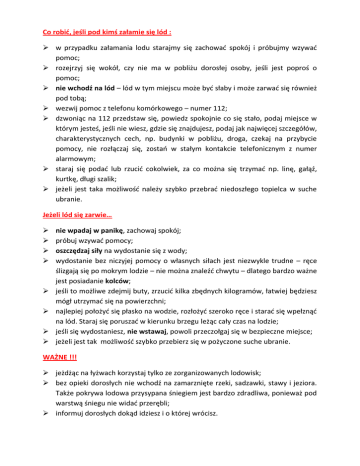 Co robić, jeśli pod kimś załamie się lód : w przypadku załamania lodu starajmy się zachować spokój i próbujmy wzywać pomoc; rozejrzyj się wokół, czy nie ma w pobliżu dorosłej osoby, jeśli jest poproś o pomoc; nie wchodź na lód – lód w tym miejscu może być słaby i może zarwać się również pod tobą; wezwij pomoc z telefonu komórkowego – numer 112; dzwoniąc na 112 przedstaw się, powiedz spokojnie co się stało, podaj miejsce w którym jesteś, jeśli nie wiesz, gdzie się znajdujesz, podaj jak najwięcej szczegółów, charakterystycznych cech, np. budynki w pobliżu, droga, czekaj na przybycie pomocy, nie rozłączaj się, zostań w stałym kontakcie telefonicznym z numer alarmowym; staraj się podać lub rzucić cokolwiek, za co można się trzymać np. linę, gałąź, kurtkę, długi szalik; jeżeli jest taka możliwość należy szybko przebrać niedoszłego topielca w suche ubranie. Jeżeli lód się zarwie… nie wpadaj w panikę, zachowaj spokój; próbuj wzywać pomocy; oszczędzaj siły na wydostanie się z wody; wydostanie bez niczyjej pomocy o własnych siłach jest niezwykle trudne – ręce ślizgają się po mokrym lodzie – nie można znaleźć chwytu – dlatego bardzo ważne jest posiadanie kolców; jeśli to możliwe zdejmij buty, zrzucić kilka zbędnych kilogramów, łatwiej będziesz mógł utrzymać się na powierzchni; najlepiej położyć się płasko na wodzie, rozłożyć szeroko ręce i starać się wpełznąć na lód. Staraj się poruszać w kierunku brzegu leżąc cały czas na lodzie; jeśli się wydostaniesz, nie wstawaj, powoli przeczołgaj się w bezpieczne miejsce; jeżeli jest tak możliwość szybko przebierz się w pożyczone suche ubranie. WAŻNE !!! jeżdżąc na łyżwach korzystaj tylko ze zorganizowanych lodowisk; bez opieki dorosłych nie wchodź na zamarznięte rzeki, sadzawki, stawy i jeziora. Także pokrywa lodowa przysypana śniegiem jest bardzo zdradliwa, ponieważ pod warstwą śniegu nie widać przerębli; informuj dorosłych dokąd idziesz i o której wrócisz.