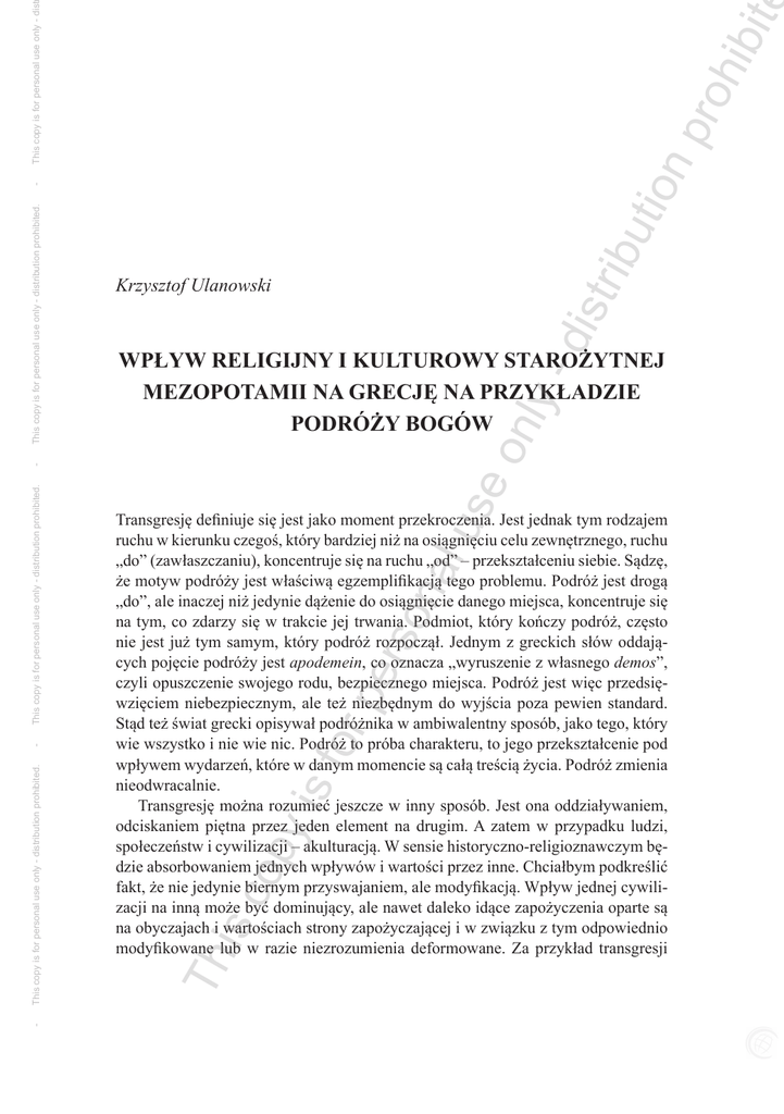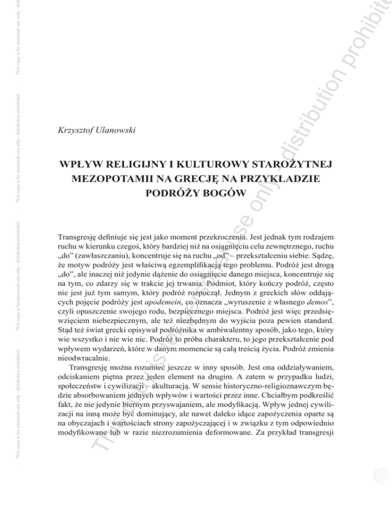 ibu tio np roh ibit This copy is for personal use only - dist - dis tr on ly - Wpływ religijny i kulturowy starożytnej Mezopotamii na Grecję na przykładzie podróży bogów - se is c op y is for pe rso na lu Transgresję definiuje się jest jako moment przekroczenia. Jest jednak tym rodzajem ruchu w kierunku czegoś, który bardziej niż na osiągnięciu celu zewnętrznego, ruchu „do” (zawłaszczaniu), koncentruje się na ruchu „od” – przekształceniu siebie. Sądzę, że motyw podróży jest właściwą egzemplifikacją tego problemu. Podróż jest drogą „do”, ale inaczej niż jedynie dążenie do osiągnięcie danego miejsca, koncentruje się na tym, co zdarzy się w trakcie jej trwania. Podmiot, który kończy podróż, często nie jest już tym samym, który podróż rozpoczął. Jednym z greckich słów oddających pojęcie podróży jest apodemein, co oznacza „wyruszenie z własnego demos”, czyli opuszczenie swojego rodu, bezpiecznego miejsca. Podróż jest więc przedsięwzięciem niebezpiecznym, ale też niezbędnym do wyjścia poza pewien standard. Stąd też świat grecki opisywał podróżnika w ambiwalentny sposób, jako tego, który wie wszystko i nie wie nic. Podróż to próba charakteru, to jego przekształcenie pod wpływem wydarzeń, które w danym momencie są całą treścią życia. Podróż zmienia nieodwracalnie. Transgresję można rozumieć jeszcze w inny sposób. Jest ona oddziaływaniem, odciskaniem piętna przez jeden element na drugim. A zatem w przypadku ludzi, społeczeństw i cywilizacji – akulturacją. W sensie historyczno-religioznawczym będzie absorbowaniem jednych wpływów i wartości przez inne. Chciałbym podkreślić fakt, że nie jedynie biernym przyswajaniem, ale modyfikacją. Wpływ jednej cywilizacji na inną może być dominujący, ale nawet daleko idące zapożyczenia oparte są na obyczajach i wartościach strony zapożyczającej i w związku z tym odpowiednio modyfikowane lub w razie niezrozumienia deformowane. Za przykład transgresji Th This copy is for personal use only - distribution prohibited. - This copy is for personal use only - distribution prohibited. - This copy is for personal use only - distribution prohibited. Krzysztof Ulanowski ibu tio np roh ibit dis tr posłuży mi w tym konkretnym przypadku przepływ tematów i wartości z mitologii mezopotamskiej do greckiej. Konkludując – interesuje mnie motyw podróży jako element determinujący zmianę jakościową bogów, którzy taką podróż odbywali. Szczególną uwagę zwracam na absorpcję motywów mezopotamskich w religii i kulturze antycznej Grecji. To temat delikatny, gdyż brak bezpośrednich dowodów pisanych poświadczających zapożyczenia, a źródła archeologiczne i spisane mity pozostawiają szerokie pole interpretacyjne. Moim zdaniem, temat warty jest przedstawienia, gdyż w znacznie szerszym i głębszym aspekcie pokazuje motyw transgresji. W tym wypadku, to aspekt bardzo istotny dla kształtowania się wczesnej cywilizacji greckiej, a pośrednio cywilizacji europejskiej. ly - Podróż jako substytut mocy for pe rso na lu se on Dlaczego motyw podróży bogów jest tak istotnym elementem religijności starożytnego Bliskiego Wschodu? Bóg, który wyrusza w podróż i wraca z niej – nie jest już tym samym bogiem. To znaczy – literalnie nic się nie zmienia, Marduk pozostaje Mardukiem, Ninurta Ninurtą a Apollo Apollem1. Następuje natomiast zmiana jakości i prestiżu bóstwa. Bóg wyruszający jako bóstwo trzeciorzędne staje się głównym podmiotem panteonu, bóg wyruszający jako niedojrzały młodzieniec powraca jako w pełni ukształtowane bóstwo zdolne do podejmowania najważniejszych decyzji, reprezentując innych bogów i ludzi. Główną ideą występującą w wybranych przeze mnie mezopotamskich i greckich mitach jest motyw podróży. A jeszcze ściślej – nabycie i demonstracja mocy w trakcie podróży: „podróż po moc i władzę”. Zaprezentuję kilka mitów mezopotamskich i porównam je do treści wyselekcjonowanych z Hymnów Homeryckich (konkretnie Hymnu do Apolla i Hymnu do Demeter)2. Nie mniej ważne są źródła mezopotamskie, bo to przecież do nich odnoszę materiał grecki i to one stanowiły źródło do naśladowania przez następne tysiąclecia3. is c op y is 1 Przy czym każdy z nich zyskuje nowe imiona, w wypadku Marduka będzie ich nawet pięćdziesiąt. 2 Hymn do Apollona został stworzony pod koniec Okresu Orientalizującego (750–650 p.n.e.); część Delijska – około 660 roku, część Pytyjska – około 585 roku. Zob. Hymny Homeryckie, przeł. W. Appel, Toruń 2001, s. 19. 3 Istotne dla sekcji Delijskiej Hymnu do Apollona są następujące materiały: Zejście Inanny do podziemi, mity o Damu: edin-na ú-sag-gá i TRS [Henri de Genouillac, Textes religieux sumeriens du Louvre, Paris 1930] 8 (=TCL [Textes Cuneiformes de Louvre, Paris 1910] 15). Edin-na ú-sag-gá powszechnie występował w nowoasyryjskich zbiorach, podczas gdy Zejście Inanny do podziemi i TRS 8 znane są tylko z wersji starobabilońskiej. Gilgamesza odnajdujemy na tabliczkach z epoki starobabilońskiej, ale upowszechnił się dzięki wersjom późniejszym, nowoasyryjskiej i nowobabilońskiej. Najważniejsze dla sekcji Pytyjskiej są teksty mitów zawarte w Aniu, ptaku, który ukradł Tablice Przeznaczenia (mniejsze teksty Lugale, Agim) i Enuma Elish. Wszystkie z nich znamy z czasów nowoasyryjskich. Nie tak istotne są Powrót Ninurty do Eridu i UET 6/1 2. Oba to mity sumeryjskie, a i ich kopie pochodzą z okresu starobabilońskiego. Th This copy is for personal use only - dist This copy is for personal use only - distribution prohibited. This copy is for personal use only - distribution prohibited. This copy is for personal use only - distribution prohibited. - Wpływ religijny i kulturowy... 49 ibu tio np roh ibit Krzysztof Ulanowski y is for pe rso na lu se on ly - dis tr Rozpocznę od cyklu mitów o Ninurcie – bogu