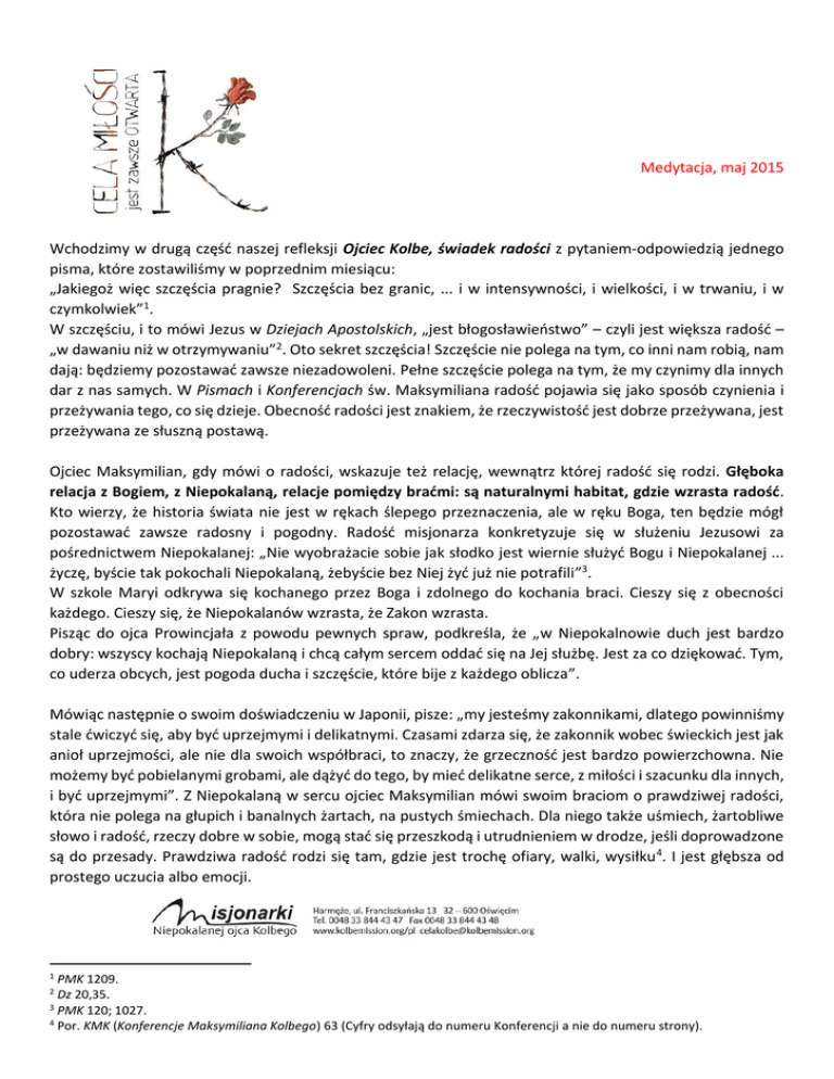Medytacja, maj 2015 Wchodzimy w drugą część naszej refleksji Ojciec Kolbe, świadek radości z pytaniem-odpowiedzią jednego pisma, które zostawiliśmy w poprzednim miesiącu: „Jakiegoż więc szczęścia pragnie? Szczęścia bez granic, ... i w intensywności, i wielkości, i w trwaniu, i w czymkolwiek”1. W szczęściu, i to mówi Jezus w Dziejach Apostolskich, „jest błogosławieństwo” – czyli jest większa radość – „w dawaniu niż w otrzymywaniu”2. Oto sekret szczęścia! Szczęście nie polega na tym, co inni nam robią, nam dają: będziemy pozostawać zawsze niezadowoleni. Pełne szczęście polega na tym, że my czynimy dla innych dar z nas samych. W Pismach i Konferencjach św. Maksymiliana radość pojawia się jako sposób czynienia i przeżywania tego, co się dzieje. Obecność radości jest znakiem, że rzeczywistość jest dobrze przeżywana, jest przeżywana ze słuszną postawą. Ojciec Maksymilian, gdy mówi o radości, wskazuje też relację, wewnątrz której radość się rodzi. Głęboka relacja z Bogiem, z Niepokalaną, relacje pomiędzy braćmi: są naturalnymi habitat, gdzie wzrasta radość. Kto wierzy, że historia świata nie jest w rękach ślepego przeznaczenia, ale w ręku Boga, ten będzie mógł pozostawać zawsze radosny i pogodny. Radość misjonarza konkretyzuje się w służeniu Jezusowi za pośrednictwem Niepokalanej: „Nie wyobrażacie sobie jak słodko jest wiernie służyć Bogu i Niepokalanej ... życzę, byście tak pokochali Niepokalaną, żebyście bez Niej żyć już nie potrafili”3. W szkole Maryi odkrywa się kochanego przez Boga i zdolnego do kochania braci. Cieszy się z obecności każdego. Cieszy się, że Niepokalanów wzrasta, że Zakon wzrasta. Pisząc do ojca Prowincjała z powodu pewnych spraw, podkreśla, że „w Niepokalnowie duch jest bardzo dobry: wszyscy kochają Niepokalaną i chcą całym sercem oddać się na Jej służbę. Jest za co dziękować. Tym, co uderza obcych, jest pogoda ducha i szczęście, które bije z każdego oblicza”. Mówiąc następnie o swoim doświadczeniu w Japonii, pisze: „my jesteśmy zakonnikami, dlatego powinniśmy stale ćwiczyć się, aby być uprzejmymi i delikatnymi. Czasami zdarza się, że zakonnik wobec świeckich jest jak anioł uprzejmości, ale nie dla swoich współbraci, to znaczy, że grzeczność jest bardzo powierzchowna. Nie możemy być pobielanymi grobami, ale dążyć do tego, by mieć delikatne serce, z miłości i szacunku dla innych, i być uprzejmymi”. Z Niepokalaną w sercu ojciec Maksymilian mówi swoim braciom o prawdziwej radości, która nie polega na głupich i banalnych żartach, na pustych śmiechach. Dla niego także uśmiech, żartobliwe słowo i radość, rzeczy dobre w sobie, mogą stać się przeszkodą i utrudnieniem w drodze, jeśli doprowadzone są do przesady. Prawdziwa radość rodzi się tam, gdzie jest trochę ofiary, walki, wysiłku 4. I jest głębsza od prostego uczucia albo emocji. 1 PMK 1209. Dz 20,35. 3 PMK 120; 1027. 4 Por. KMK (Konferencje Maksymiliana Kolbego) 63 (Cyfry odsyłają do numeru Konferencji a nie do numeru strony). 2 Władysław Dubaniowski, jego kolega z Seminarium, wspomina, że „także w próbach i w trudnościach nigdy nie załamywał się i nie upadał w zniechęcenie; przeciwnie, mówił z radością: <Następnym razem wszystko pójdzie lepiej>”5. Ojciec Maksymilian, opowiadając o misyjnych przygodach w Japonii, świadczy, jak Bóg daje jemu i jego współbraciom radość pośród prób, bo „tylko ta dusza, która się modli, wszystko przezwycięży. Mimo jednak tych trudności Pan Bóg daje dużo pociech – większych niż te trudności”6. Świadomy, że w relacji z Bogiem – jak w każdej relacji – jest czas na radość i także na próbę i wątpliwość, twierdzi z przekonaniem: „Z radością – to nie znaczy, by nie odczuwał bólu, owszem, odczuwa go, ale z poddaniem się woli Bożej ... I ten stan jest bez porównania cięższy. To jest wielkie cierpienie dla duszy kochającej Boga, kiedy jej się zdaje, że Pan Bóg ją opuszcza. Jeżeli dusza i te cierpienia znosi z radością, przy całej pełni ich odczucia, wtedy może z Panem Jezusem powiedzieć: <Wykonało się> [J 19,30]”7. Dla ojca Maksymiliana zatem radość powinna być w sercu człowieka także w trudnościach i w próbach życia. Wzywa, aby nie tracić pokoju, radości w upadkach. „W razie upadku – nigdy się nie smucić, bo to cuchnąca pycha; przeciwnie – z wielką miłością i weselem ducha powstać zaraz i iść naprzód! Ten upadek wynagrodzić aktem miłości doskonałej”8. Przeżywać, w radosnym i pogodnym stylu, własne pomyłki: „Przed upadkiem szatan podsuwa myśli lekceważące: <a co to takiego wielkiego...> a po upadku wyolbrzymia grzech, krzyczy, że plama ta już na zawsze pozostanie. Gdybyśmy po upadku zastanowili się i pomyśleli, że upadek może być na chwałę Niepokalanej, to czulibyśmy się zupełnie inaczej ... Weselę się ze swej nędzy umocniony w Jezusie, jak powiada św. Paweł [por. 2 Kor 12,9]”9. Angela Esposito Harmęże - Polska 5 Patrizia Treece, Massimiliano Kolbe, il Santo di Auschwitz (Maksymilian Kolbe, Święty Oświęcimia), 20-21. Por. KMK 138. 7 KMK 221. 8 KMK 34. 9 KMK 44. 6