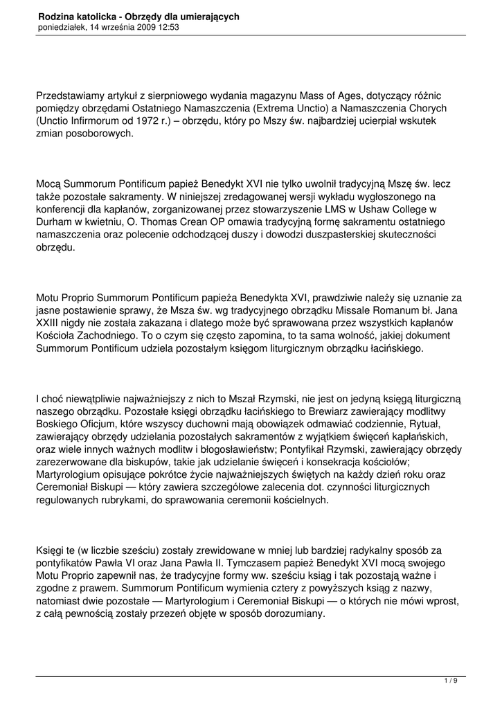 Rodzina katolicka - Obrzędy dla umierających poniedziałek, 14 września 2009 12:53 Przedstawiamy artykuł z sierpniowego wydania magazynu Mass of Ages, dotyczący różnic pomiędzy obrzędami Ostatniego Namaszczenia (Extrema Unctio) a Namaszczenia Chorych (Unctio Infirmorum od 1972 r.) – obrzędu, który po Mszy św. najbardziej ucierpiał wskutek zmian posoborowych. Mocą Summorum Pontificum papież Benedykt XVI nie tylko uwolnił tradycyjną Mszę św. lecz także pozostałe sakramenty. W niniejszej zredagowanej wersji wykładu wygłoszonego na konferencji dla kapłanów, zorganizowanej przez stowarzyszenie LMS w Ushaw College w Durham w kwietniu, O. Thomas Crean OP omawia tradycyjną formę sakramentu ostatniego namaszczenia oraz polecenie odchodzącej duszy i dowodzi duszpasterskiej skuteczności obrzędu. Motu Proprio Summorum Pontificum papieża Benedykta XVI, prawdziwie należy się uznanie za jasne postawienie sprawy, że Msza św. wg tradycyjnego obrządku Missale Romanum bł. Jana XXIII nigdy nie została zakazana i dlatego może być sprawowana przez wszystkich kapłanów Kościoła Zachodniego. To o czym się często zapomina, to ta sama wolność, jakiej dokument Summorum Pontificum udziela pozostałym księgom liturgicznym obrządku łacińskiego. I choć niewątpliwie najważniejszy z nich to Mszał Rzymski, nie jest on jedyną księgą liturgiczną naszego obrządku. Pozostałe księgi obrządku łacińskiego to Brewiarz zawierający modlitwy Boskiego Oficjum, które wszyscy duchowni mają obowiązek odmawiać codziennie, Rytuał, zawierający obrzędy udzielania pozostałych sakramentów z wyjątkiem święceń kapłańskich, oraz wiele innych ważnych modlitw i błogosławieństw; Pontyfikał Rzymski, zawierający obrzędy zarezerwowane dla biskupów, takie jak udzielanie święceń i konsekracja kościołów; Martyrologium opisujące pokrótce życie najważniejszych świętych na każdy dzień roku oraz Ceremoniał Biskupi — który zawiera szczegółowe zalecenia dot. czynności liturgicznych regulowanych rubrykami, do sprawowania ceremonii kościelnych. Księgi te (w liczbie sześciu) zostały zrewidowane w mniej lub bardziej radykalny sposób za pontyfikatów Pawła VI oraz Jana Pawła II. Tymczasem papież Benedykt XVI mocą swojego Motu Proprio zapewnił nas, że tradycyjne formy ww. sześciu ksiąg i tak pozostają ważne i zgodne z prawem. Summorum Pontificum wymienia cztery z powyższych ksiąg z nazwy, natomiast dwie pozostałe — Martyrologium i Ceremoniał Biskupi — o których nie mówi wprost, z całą pewnością zostały przezeń objęte w sposób dorozumiany. 1/9 Rodzina katolicka - Obrzędy dla umierających poniedziałek, 14 września 2009 12:53 Pragnę poczynić kilka uwag dotyczących jednej z ww. ksiąg liturgicznych, mianowicie Rituale Romanum — Rytuału Rzymskiego. Rytuał to kolejna księga po Mszale dotycząca wprost wszystkich katolików, zarówno duchownych jak i świeckich. A ponieważ moja obecna służba w Leicester wiąże się z obowiązkami kapelana szpitalnego, pragnę przyjrzeć się bliżej obrzędom liturgicznym dla osób chorych i umierających i porównać formę tradycyjną z nowszymi. Może zacznę najpierw od tradycyjnego Rituale Romanum. Rytuał Rzymski to ostatnia z sześciu ksiąg liturgicznych skodyfikowanych przez Stolicę Apostolską. Pierwsza wzorcowa edycja została wydana w roku 1614 przez papieża Pawła V, czyli ok. 40 lat od wydania przez św. Piusa V bulli Quo Primum ujednolicającej formę Mszy św. Nie trzeba chyba dodawać, że Rytuał, tak jak Mszał Piusa V, nie był nowym tworem ex nihilo — z niczego. Jak podaje sam Ojciec Święty w swojej Konstytucji Apostolskiej Apostolicæ Sedi, została ona stworzona z Rytuałów będących wówczas w użyciu, a w szczególności z najstarszych. I choć prawdą jest, że pewne drobne różnice w niektórych ceremoniach, np. nawiedzanie chorych, pozostały między różnymi diecezjami Kościoła Zachodniego aż do Soboru Watykańskiego II, to w większości polegały one po prostu na włączaniu do zwyczajowych miejscowych modlitw dodatków do wzorcowego tekstu ogłoszonego przez Pawła V. Art. 9 § 1 Summorum Pontificum stanowi: „Proboszcz, po dokładnym rozważeniu wszystkich okoliczności może wyrazić zgodę na użycie starego rytuału przy sprawowaniu sakramentów: Chrztu, Małżeństwa, Pokuty, Namaszczenia Chorych, jeśli dobro dusz tego wymaga”. Innymi słowy proboszcz może korzystać zeń sam i mogą także jego pomocniczy księża, za jego pozwoleniem. Stosując więc zasadę, w myśl której „kto przyzwala na rzeczy większe, ten też przyzwala na mniejsze”, możemy śmiało wywnioskować z tekstu Motu Proprio, że duszpasterze mają również prawo do sprawowania pozostałych, niesakramentalnych obrzędów zawartych w tradycyjnym Rytuale, np. tradycyjnym obrzędzie polecenia duszy umierającego. Dlatego też w powyższym artykule zajmę się głównie sakramentem Ostatniego Namaszczenia (Extrema Unctio) lub Namaszczenia Chorych (Unctio Infirmorum) [od 1972r. – przyp. red.] sensu stricte, nie stroniąc przy tym od obrzędu polecenia odchodzącej duszy: są to dwa obrzędy, które doskonale egzystują osobno, lecz w praktyce kapłan jest często zobowiązany do udzielenia ich razem. Różnice w formach Zacznijmy może od tego, czym różni się obrzęd tradycyjny namaszczenia od obrzędu Pawła VI 2/9 Rodzina katolicka - Obrzędy dla umierających poniedziałek, 14 września 2009 12:53 ogłoszonego w listopadzie 1972r. Otóż, pod wieloma względami. Można by nawet rzec, że spośród wszystkich siedmiu obrzędów sakramentalnych, to właśnie obrzęd Ostatniego Namaszczenia ucierpiał najbardziej z powodu zmian posoborowych. Jest tak dlatego, że pośród siedmiu sakramentów wprowadzone zmiany odnoszą się nie tylko modlitw dotyczących esencji sakramentalnego aktu, lecz także samej formy sakramentalnej oraz materii bliższej. Nim 