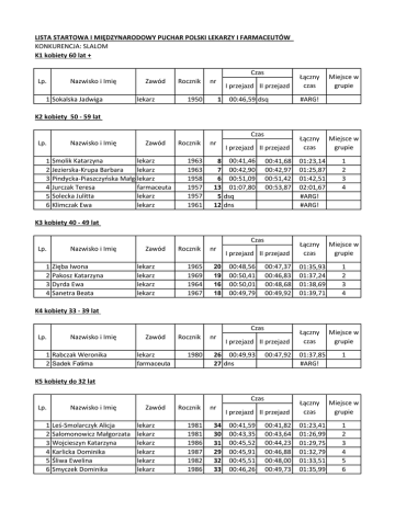 LISTA STARTOWA I MIĘDZYNARODOWY PUCHAR POLSKI LEKARZY I FARMACEUTÓW KONKURENCJA: SLALOM K1 kobiety 60 lat + Czas Lp. Nazwisko i Imię 1 Sokalska Jadwiga Zawód lekarz Rocznik nr 1950 I przejazd II przejazd 1 00:46,59 dsq Łączny czas Miejsce w grupie #ARG! K2 kobiety 50 - 59 lat Czas Lp. 1 2 3 4 5 6 Nazwisko i Imię Zawód Smolik Katarzyna lekarz Jezierska-Krupa Barbara lekarz Pindycka-Piaszczyńska Małgorzata lekarz Jurczak Teresa farmaceuta Solecka Julitta lekarz Klimczak Ewa lekarz Rocznik 1963 1963 1958 1957 1957 1961 nr I przejazd II przejazd 8 00:41,46 7 00:42,90 6 00:51,09 13 01:07,80 5 dsq 12 dns 00:41,68 00:42,97 00:51,42 00:53,87 Łączny czas 01:23,14 01:25,87 01:42,51 02:01,67 #ARG! #ARG! Miejsce w grupie 1 2 3 4 K3 kobiety 40 - 49 lat Czas Lp. 1 2 3 4 Nazwisko i Imię Zięba Iwona Pakosz Katarzyna Dyrda Ewa Sanetra Beata Zawód lekarz lekarz lekarz lekarz Rocznik 1965 1969 1964 1967 nr 20 19 16 18 I przejazd II przejazd 00:48,56 00:50,41 00:50,01 00:49,79 00:47,37 00:46,83 00:48,68 00:49,92 Łączny czas 01:35,93 01:37,24 01:38,69 01:39,71 Miejsce w grupie 1 2 3 4 K4 kobiety 33 - 39 lat Czas Lp. Nazwisko i Imię 1 Rabczak Weronika 2 Sadek Fatima Zawód lekarz Rocznik 1980 farmaceuta nr I przejazd II przejazd 26 00:49,93 27 dns 00:47,92 Łączny czas 01:37,85 #ARG! Miejsce w grupie 1 K5 kobiety do 32 lat Czas Lp. 1 2 3 4 5 6 Nazwisko i Imię Leś-Smolarczyk Alicja Salomonowicz Małgorzata Wojcieszyn Katarzyna Karlicka Dominika Śliwa Ewelina Smyczek Dominika Zawód lekarz lekarz lekarz lekarz lekarz lekarz Rocznik 1981 1981 1986 1987 1982 1986 nr 34 30 31 29 32 33 I przejazd II przejazd 00:41,59 00:43,35 00:45,52 00:45,91 00:45,51 00:46,26 00:41,82 00:43,64 00:44,23 00:46,88 00:48,00 00:49,73 Łączny czas 01:23,41 01:26,99 01:29,75 01:32,79 01:33,51 01:35,99 Miejsce w grupie 1 2 3 4 5 6 M1 mężczyźni 60 lat + Czas Lp. 1 2 3 4 5 6 Nazwisko i Imię Golec Andrzej Pawlas Roman Nytra Tomasz Wójcikiewicz Tadeusz Madej Stefan Skobel Grzegorz Zawód lekarz lekarz lekarz lekarz lekarz lekarz Rocznik 1953 1951 1955 1948 1949 1949 nr I przejazd II przejazd 39 00:37,51 00:38,94 40 00:41,75 00:43,17 44 00:52,51 00:49,49 38 00:48,84 00:57,07 43 00:57,92 00:57,66 61 00:58,95 dsq Łączny czas Miejsce w grupie 01:16,45 01:24,92 01:42,00 01:45,91 01:55,58 #ARG! 1 2 3 4 5 Łączny czas Miejsce w grupie M2 mężczyźni 50 - 59 lat Czas Lp. 1 2 3 4 5 6 7 8 9 10 11 12 13 Nazwisko i Imię Klimczak Leszek Lewandowski Janusz Kryj Mariusz Warzecha Wacław Sroczyński Jacek Lipka Mariusz Drotlef Bogusław Dyrda Adam Gałaszek Michał Paja Jarosław Bursig Henryk Wojcieszyn Michał Piaszczyński Włodzimierz Zawód lekarz lekarz lekarz lekarz lekarz lekarz lekarz lekarz lekarz lekarz lekarz lekarz lekarz Rocznik 1963 1956 1961 1962 1963 1961 1958 1961 1956 1956 1963 1960 1956 nr I przejazd II przejazd 46 00:37,15 59 00:37,71 60 00:37,94 53 00:39,80 49 00:40,71 50 00:42,33 48 00:43,59 55 00:45,14 58 00:45,38 47 00:47,07 57 00:50,43 54 dsq 52 dns 00:38,96 00:39,14 00:39,05 00:40,35 00:40,19 00:42,61 00:44,64 00:44,47 00:44,95 00:45,88 00:54,89 01:16,11 01:16,85 01:16,99 01:20,15 01:20,90 01:24,94 01:28,23 01:29,61 01:30,33 01:32,95 01:45,32 #ARG! #ARG! M3 mężczyźni 40 - 49 lat Czas Lp. 1 2 3 5 6 7 8 9 10 12 13 14 15 Nazwisko i Imię Stefanik Przemysław Nowak Przemysław Smolik Mariusz Prośniak Krzysztof Dziarkowski Grzegorz Siteń Grzegorz Omernik Marcin Wacław Andrzej Mioduszewski Andrzej Zawadziński Marcin Mildner Krzysztof Wylężek Dariusz Wójcikiewicz Tomasz Zawód lekarz lekarz lekarz lekarz lekarz lekarz lekarz lekarz lekarz lekarz lekarz lekarz lekarz Rocznik 1970 1964 1965 1967 1970 1966 1969 1968 1967 1971 1970 1964 1973 nr 77 78 70 72 79 62 66 68 71 67 82 74 76 I przejazd II przejazd 00:37,40 00:37,88 00:38,77 00:38,53 00:41,63 00:41,45 00:41,64 00:42,55 00:41,95 00:46,38 00:42,56 00:44,05 00:45,87 00:38,14 00:38,28 00:38,84 00:39,10 00:40,83 00:41,27 00:41,23 00:40,82 00:41,44 00:39,05 00:43,70 00:43,06 00:45,84 Łączny czas 01:15,54 01:16,16 01:17,61 01:17,63 01:22,46 01:22,72 01:22,87 01:23,37 01:23,39 01:25,43 01:26,26 01:27,11 01:31,71 Miejsce w grupie 1 2 3 4 5 6 7 8 9 10 11 12 13 16 Olszewski Paweł 17 Koźbiał Piotr 17 Drozd Paweł lekarz lekarz lekarz 1964 1970 1967 63 00:47,26 64 dsq 80 dsq 00:48,46 00:39,12 01:35,72 #ARG! #ARG! 14 M4 mężczyźni 33 - 39 lat Czas Lp. 1 2 3 4 Nazwisko i Imię Skoczyński Szymon Galik Rafał Nagórski Marcin Rabczak Wojciech Zawód lekarz lekarz lekarz lekarz Rocznik 1979 1980 1978 1980 nr 86 89 88 84 I przejazd II przejazd 00:42,43 00:41,37 00:44,81 00:42,51 00:41,24 dsq Łączny czas 01:23,80 01:27,32 #ARG! 00:00,00 Miejsce w grupie 1 2 M5 mężczyźni do 32 lat Czas Lp. 1 2 3 4 5 Nazwisko i Imię Gałaszek Jakub Piaszczyński Michał Gwóźdź Wojciech Zagórski Piotr Stopa Marcin Zawód lekarz lekarz lekarz lekarz lekarz Rocznik 1982 1984 1985 1983 1984 nr 95 98 96 93 97 I przejazd II przejazd 00:35,53 00:37,94 00:37,90 00:38,96 01:03,63 00:35,67 00:38,10 00:38,17 00:37,90 00:37,93 Łączny czas 01:11,20 01:16,04 01:16,07 01:16,86 01:41,56 Miejsce w grupie 1 2 3 4 5 Os. Tow. K Czas Lp. Nazwisko i Imię Zawód Rocznik nr I przejazd II przejazd 1 2 3 4 5 Orlikowska Hanna Rak Małgorzata Mioduszewska Aleksandra Orlikowska Ewa Górska Katarzyna osoba towarzysząca 1980 osoba towarzysząca 1992 osoba towarzysząca 1982 wykładowca 103 00:43,39 00:44,07 106 00:44,56 00:45,19 104 00:44,59 00:47,85 102 00:42,76 dsq 105 dnf Łączny czas 01:27,46 01:29,75 01:32,44 #ARG! #ARG! Miejsce w grupie 1 2 3 Os. Tow. M 31 lat + Czas Lp. 1 2 3 4 Nazwisko i Imię Salamon Jacek Staszkiewicz Adam Chrapek Waldemar Deka Przemysław Zawód Rocznik osoba towarzysząca 1957 wykładowca wykładowca osoba towarzysząca 1980 nr 107 110 111 109 I przejazd II przejazd 00:44,08 00:36,50 00:36,79 00:41,03 00:41,41 00:40,39 dsq Łączny czas 00:44,08 01:13,29 01:22,44 #ARG! Miejsce w grupie 1 2 3 Os. Tow. M do 30 lat Czas Lp. Nazwisko i Imię Zawód Rocznik nr Łą