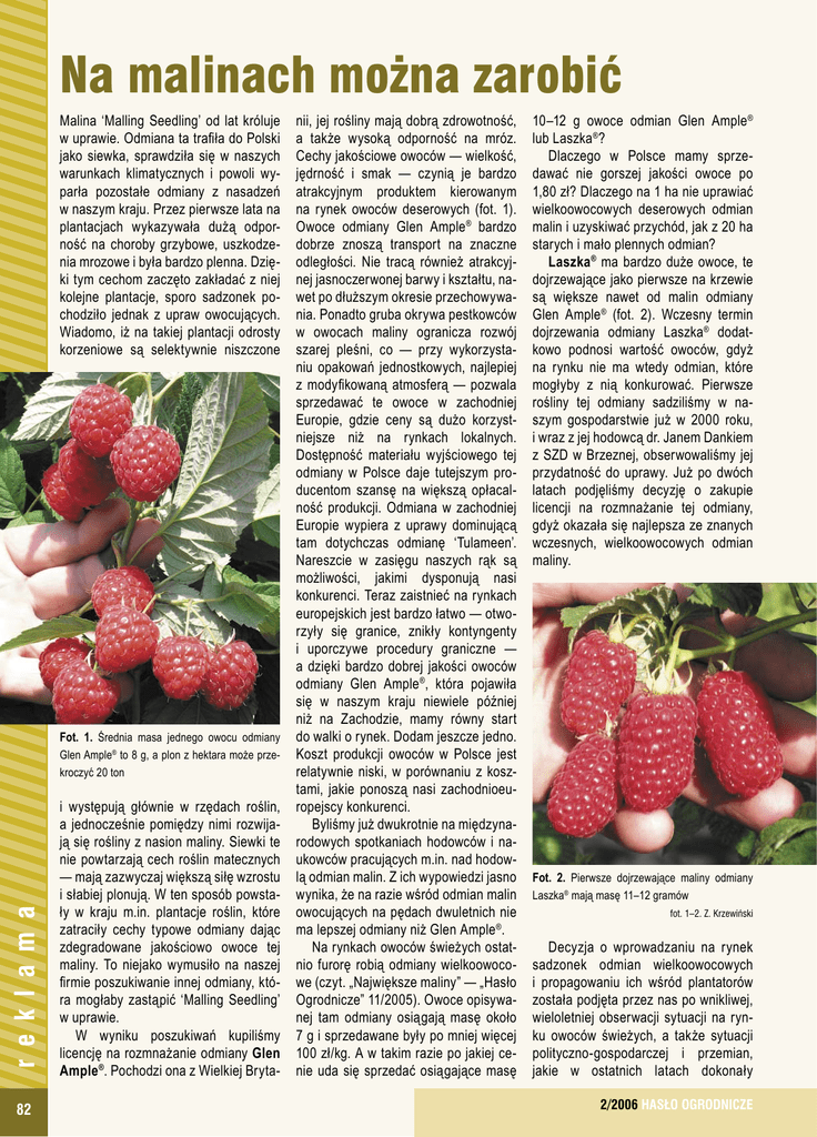 Na malinach można zarobić Malina ‘Malling Seedling’ od lat króluje w uprawie. Odmiana ta trafiła do Polski jako siewka, sprawdziła się w naszych warunkach klimatycznych i powoli wyparła pozostałe odmiany z nasadzeń w naszym kraju. Przez pierwsze lata na plantacjach wykazywała dużą odporność na choroby grzybowe, uszkodzenia mrozowe i była bardzo plenna. Dzięki tym cechom zaczęto zakładać z niej kolejne plantacje, sporo sadzonek pochodziło jednak z upraw owocujących. Wiadomo, iż na takiej plantacji odrosty korzeniowe są selektywnie niszczone Fot. 1. Średnia masa jednego owocu odmiany r e k l a m a Glen Ample® to 8 g, a plon z hektara może przekroczyć 20 ton 82 i występują głównie w rzędach roślin, a jednocześnie pomiędzy nimi rozwijają się rośliny z nasion maliny. Siewki te nie powtarzają cech roślin matecznych — mają zazwyczaj większą siłę wzrostu i słabiej plonują. W ten sposób powstały w kraju m.in. plantacje roślin, które zatraciły cechy typowe odmiany dając zdegradowane jakościowo owoce tej maliny. To niejako wymusiło na naszej firmie poszukiwanie innej odmiany, która mogłaby zastąpić ‘Malling Seedling’ w uprawie. W wyniku poszukiwań kupiliśmy licencję na rozmnażanie odmiany Glen Ample ®. Pochodzi ona z Wielkiej Bryta- nii, jej rośliny mają dobrą zdrowotność, a także wysoką odporność na mróz. Cechy jakościowe owoców — wielkość, jędrność i smak — czynią je bardzo atrakcyjnym produktem kierowanym na rynek owoców deserowych (fot. 1). Owoce odmiany Glen Ample ® bardzo dobrze znoszą transport na znaczne odległości. Nie tracą również atrakcyjnej jasnoczerwonej barwy i kształtu, nawet po dłuższym okresie przechowywania. Ponadto gruba okrywa pestkowców w owocach maliny ogranicza rozwój szarej pleśni, co — przy wykorzystaniu opakowań jednostkowych, najlepiej z modyfikowaną atmosferą — pozwala sprzedawać te owoce w zachodniej Europie, gdzie ceny są dużo korzystniejsze niż na rynkach lokalnych. Dostępność materiału wyjściowego tej odmiany w Polsce daje tutejszym producentom szansę na większą opłacalność produkcji. Odmiana w zachodniej Europie wypiera z uprawy dominującą tam dotychczas odmianę ‘Tulameen’. Nareszcie w zasięgu naszych rąk są możliwości, jakimi dysponują nasi konkurenci. Teraz zaistnieć na rynkach europejskich jest bardzo łatwo — otworzyły się granice, znikły kontyngenty i uporczywe procedury graniczne — a dzięki bardzo dobrej jakości owoców odmiany Glen Ample ®, która pojawiła się w naszym kraju niewiele później niż na Zachodzie, mamy równy start do walki o rynek. Dodam jeszcze jedno. Koszt produkcji owoców w Polsce jest relatywnie niski, w porównaniu z kosztami, jakie ponoszą nasi zachodnioeuropejscy konkurenci. Byliśmy już dwukrotnie na międzynarodowych spotkaniach hodowców i naukowców pracujących m.in. nad hodowlą odmian malin. Z ich wypowiedzi jasno wynika, że na razie wśród odmian malin owocujących na pędach dwuletnich nie ma lepszej odmiany niż Glen Ample ®. Na rynkach owoców świeżych ostatnio furorę robią odmiany wielkoowocowe (czyt. „Największe maliny” — „Hasło Ogrodnicze” 11/2005). Owoce opisywanej tam odmiany osiągają masę około 7 g i sprzedawane były po mniej więcej 100 zł/kg. A w takim razie po jakiej cenie uda się sprzedać osiągające masę 10–12 g owoce odmian Glen Ample ® lub Laszka®? Dlaczego w Polsce mamy sprzedawać nie gorszej jakości owoce po 1,80 zł? Dlaczego na 1 ha nie uprawiać wielkoowocowych deserowych odmian malin i uzyskiwać przychód, jak z 20 ha starych i mało plennych odmian? Laszka ® ma bardzo duże owoce, te dojrzewające jako pierwsze na krzewie są większe nawet od malin odmiany Glen Ample ® (fot. 2). Wczesny termin dojrzewania odmiany Laszka® dodatkowo podnosi wartość owoców, gdyż na rynku nie ma wtedy odmian, które mogłyby z nią konkurować. Pierwsze rośliny tej odmiany sadziliśmy w naszym gospodarstwie już w 2000 roku, i wraz z jej hodowcą dr. Janem Dankiem z SZD w Brzeznej, obserwowaliśmy jej przydatność do uprawy. Już po dwóch latach podjęliśmy decyzję o zakupie licencji na rozmnażanie tej odmiany, gdyż okazała się najlepsza ze znanych wczesnych, wielkoowocowych odmian maliny. Fot. 2. Pierwsze dojrzewające maliny odmiany Laszka® mają masę 11–12 gramów fot. 1–2. Z. Krzewiński Decyzja o wprowadzaniu na rynek sadzonek odmian wielkoowocowych i propagowaniu ich wśród plantatorów została podjęta przez nas po wnikliwej, wieloletniej obserwacji sytuacji na rynku owoców świeżych, a także sytuacji polityczno-gospodarczej i przemian, jakie w ostatnich latach dokonały 2/2006 HASŁO OGRODNICZE chętne do pracy przy zbiorze i coraz więcej potrzeba na to funduszy. Stąd, aby uniknąć takich kłopotów, warto zainwestować w maksymalną mechanizację produkcji. Odmianą polecaną do mechanicznego zbioru owoców jest ‘Canby’. Charakteryzuje się dużą odpornością na mróz, choroby grzybowe i odglebowe. Jest niezawodna w uprawie i przy nawadnianiu plantacji bardzo plenna. Dodatkowym jej atutem jest wyrównane dojrzewanie owoców, co zmniejsza liczbę przejazdów kombajnem po plantacji i pozwala ograniczyć uszkodzenia mechaniczne roślin. Dzięki temu nie jest obniżana naturalna odporność roślin na choroby i mróz, a także na szkodniki pędów. Wniosek jest prosty: Róbmy dobrze i dużo. Zbigniew Krzewiński ul. Krężnicka 100 20-515 Lublin fax: +48 81 750 98 12 tel./fax: 48 81 750 02 79 mob.: +48 608 572 872 www.krzewinski.com www.krzewinski,pl [email protected] r e k l a m a się na świecie. Dotychczas Polska w przypadku owoców malin była dla Europy, w tym dla państw bloku wschodniego, ważnym producentem taniego półproduktu do przerobu. Sytuacja ekonomiczno-polityczna Polski i państw ościennych doprowadziła do zwiększenia kosztów produkcji w Polsce, przez co przemysł prze