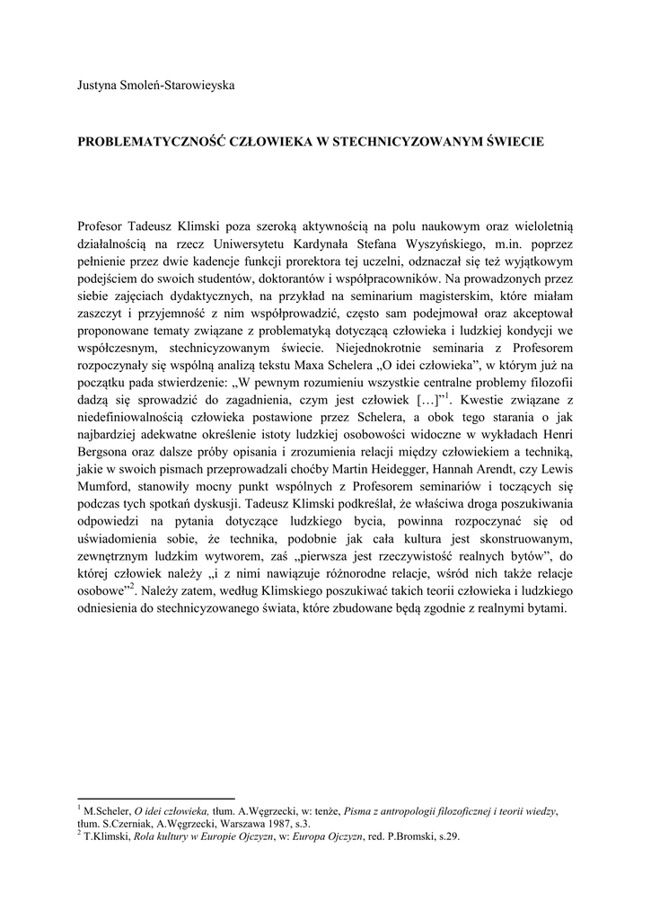 Justyna Smoleń-Starowieyska PROBLEMATYCZNOŚĆ CZŁOWIEKA W STECHNICYZOWANYM ŚWIECIE Profesor Tadeusz Klimski poza szeroką aktywnością na polu naukowym oraz wieloletnią działalnością na rzecz Uniwersytetu Kardynała Stefana Wyszyńskiego, m.in. poprzez pełnienie przez dwie kadencje funkcji prorektora tej uczelni, odznaczał się też wyjątkowym podejściem do swoich studentów, doktorantów i współpracowników. Na prowadzonych przez siebie zajęciach dydaktycznych, na przykład na seminarium magisterskim, które miałam zaszczyt i przyjemność z nim współprowadzić, często sam podejmował oraz akceptował proponowane tematy związane z problematyką dotyczącą człowieka i ludzkiej kondycji we współczesnym, stechnicyzowanym świecie. Niejednokrotnie seminaria z Profesorem rozpoczynały się wspólną analizą tekstu Maxa Schelera „O idei człowieka”, w którym już na początku pada stwierdzenie: „W pewnym rozumieniu wszystkie centralne problemy filozofii dadzą się sprowadzić do zagadnienia, czym jest człowiek […]”1. Kwestie związane z niedefiniowalnością człowieka postawione przez Schelera, a obok tego starania o jak najbardziej adekwatne określenie istoty ludzkiej osobowości widoczne w wykładach Henri Bergsona oraz dalsze próby opisania i zrozumienia relacji między człowiekiem a techniką, jakie w swoich pismach przeprowadzali choćby Martin Heidegger, Hannah Arendt, czy Lewis Mumford, stanowiły mocny punkt wspólnych z Profesorem seminariów i toczących się podczas tych spotkań dyskusji. Tadeusz Klimski podkreślał, że właściwa droga poszukiwania odpowiedzi na pytania dotyczące ludzkiego bycia, powinna rozpoczynać się od uświadomienia sobie, że technika, podobnie jak cała kultura jest skonstruowanym, zewnętrznym ludzkim wytworem, zaś „pierwsza jest rzeczywistość realnych bytów”, do której człowiek należy „i z nimi nawiązuje różnorodne relacje, wśród nich także relacje osobowe”2. Należy zatem, według Klimskiego poszukiwać takich teorii człowieka i ludzkiego odniesienia do stechnicyzowanego świata, które zbudowane będą zgodnie z realnymi bytami. 1 M.Scheler, O idei człowieka, tłum. A.Węgrzecki, w: tenże, Pisma z antropologii filozoficznej i teorii wiedzy, tłum. S.Czerniak, A.Węgrzecki, Warszawa 1987, s.3. 2 T.Klimski, Rola kultury w Europie Ojczyzn, w: Europa Ojczyzn, red. P.Bromski, s.29.