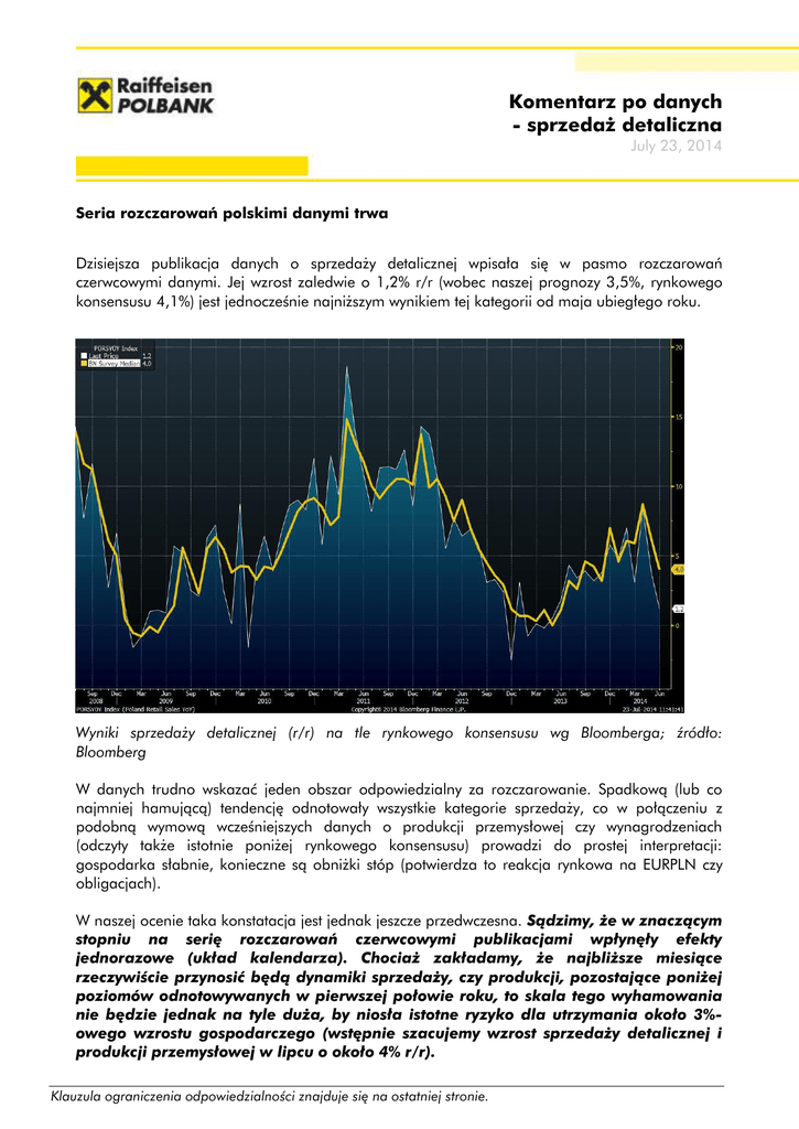 Komentarz po danych - sprzedaż detaliczna July 23, 2014 Seria rozczarowań polskimi danymi trwa Dzisiejsza publikacja danych o sprzedaży detalicznej wpisała się w pasmo rozczarowań czerwcowymi danymi. Jej wzrost zaledwie o 1,2% r/r (wobec naszej prognozy 3,5%, rynkowego konsensusu 4,1%) jest jednocześnie najniższym wynikiem tej kategorii od maja ubiegłego roku. Wyniki sprzedaży detalicznej (r/r) na tle rynkowego konsensusu wg Bloomberga; źródło: Bloomberg W danych trudno wskazać jeden obszar odpowiedzialny za rozczarowanie. Spadkową (lub co najmniej hamującą) tendencję odnotowały wszystkie kategorie sprzedaży, co w połączeniu z podobną wymową wcześniejszych danych o produkcji przemysłowej czy wynagrodzeniach (odczyty także istotnie poniżej rynkowego konsensusu) prowadzi do prostej interpretacji: gospodarka słabnie, konieczne są obniżki stóp (potwierdza to reakcja rynkowa na EURPLN czy obligacjach). W naszej ocenie taka konstatacja jest jednak jeszcze przedwczesna. Sądzimy, że w znaczącym stopniu na serię rozczarowań czerwcowymi publikacjami wpłynęły efekty jednorazowe (układ kalendarza). Chociaż zakładamy, że najbliższe miesiące rzeczywiście przynosić będą dynamiki sprzedaży, czy produkcji, pozostające poniżej poziomów odnotowywanych w pierwszej połowie roku, to skala tego wyhamowania nie będzie jednak na tyle duża, by niosła istotne ryzyko dla utrzymania około 3%owego wzrostu gospodarczego (wstępnie szacujemy wzrost sprzedaży detalicznej i produkcji przemysłowej w lipcu o około 4% r/r). Klauzula ograniczenia odpowiedzialności znajduje się na ostatniej stronie. Z punktu widzenia sprzedaży detalicznej i konsumpcji oczekujemy, że stabilna poprawa rynku pracy i utrzymujący się wzrost optymizmu po stronie gospodarstw domowych tworzą warunki wystarczające do utrzymania trajektorii wzrostowej i zwiększania kontrybucji tego kanału do ogólnego wzrostu gospodarczego. Reakcja kursu EURPLN w ciągu 30 min od publikacji danych o sprzedaży detalicznej – dziś ws średnia, maks. i min. za ostatni rok; źródło: Bloomberg. Raiffeisen Polbank ul. Piękna 20. 00-549 Warszawa www.raiffeisenpolbank.com Klauzula Ograniczenia Odpowiedzialności Raiffeisen Bank Polska SA: Niniejsza wiadomość została przesłana zgodnie z Pani/Pana zleceniem. Informujemy, że zgoda na otrzymywanie informacji może zostać w każdej chwili odwołana. Jeżeli nie życzy sobie Pani/ Pan dalszego otrzymywania materiałów przygotowanych przez Zespół Analiz Ekonomicznych Raiffeisen Bank Polska S.A (dalej: RBPL lub Bank) lub niniejszy materiał został wysłany na Pani/Pana adres przez pomyłkę, prosimy o przesłanie e-maila o tytule "REZYGNACJA" na skrzynkę e-mailową: [email protected]. Opracowanie to nie stanowi oferty w rozumieniu art. 66 Kodeksu Cywilnego i zostało przesłane na podstawie ustnej zgody, która w każdej chwili może być odwołana. Ma ono charakter wyłącznie informacyjny. Powielanie bądź publikowanie go lub jego części bez pisemnej zgody Banku jest zabronione. Decyzja inwestycyjna w odniesieniu do papieru wartościowego, produktu finansowego lub inwestycji powinna być podjęta na podstawie opublikowanego prospektu emisyjnego lub kompletnej dokumentacji dla papieru wartościowego, produktu finansowego lub inwestycji. Ostateczna decyzja zawarcia transakcji należy wyłącznie do Klienta. Bank nie występuje w roli pośrednika ani przedstawiciela Klienta. Przed zawarciem każdej transakcji Klient powinien nie opierając się na informacjach przekazanych przez Bank określić jej ryzyko, potencjalne korzyści oraz straty z nią związane, jak również w szczególności charakterystykę, konsekwencje prawne, podatkowe i księgowe transakcji oraz konsekwencje zmieniających się czynników rynkowych, a także w sposób niezależny ocenić czy jest w stanie sam lub po konsultacjach ze swoimi doradcami podjąć takie ryzyko. Niniejszy dokument nie stanowi rekomendacji kupna lub sprzedaży instrumentów finansowych. Dokument, ani żadna z jego części nie stanowi podstawy do zawarcia jakiejkolwiek umowy lub powstania zobowiązania. Opracowanie to nie zastępuje niezbędnych porad odnośnie zakupu lub sprzedaży papieru wartościowego, inwestycji lub innego produktu finansowego. Analiza oparta jest na informacjach publicznie dostępnych – do jej sporządzenia nie wykorzystano żadnych informacji poufnych. Wyrażane opinie są niezależnymi opiniami Banku. W opracowaniu wykorzystano źródła informacji, które Bank uważa za wiarygodne i dokładne, lecz nie istnieje gwarancja, że są one wyczerpujące i w pełni odzwierciedlają stan faktyczny. Wykresy i diagramy przestawione w niniejszym opracowaniu mają charakter wyłącznie ilustracyjny oraz nie są doradztwem inwestycyjnym ani prognozą. Informacje zawarte w tej publikacji są aktualne na datę utworzenia dokumentu i mogą ulec zmianie w przyszłości. Analitycy zatrudnieni przez RBPL nie są wynagradzani z tytułu konkretnych transakcji inwestycyjnych zawartych w związku z niniejszym opracowaniem. Wynagrodzenie autorów niniejszego raportu oparte jest na ogólnym zysku RBPL, który obejmuje między innymi przychody z bankowości inwestycyjnej i innych transakcji RBPL. W ogólności RBPL zabrania swoim analitykom i osobom raportującym do analityków dokonywania transakcji papierami wartościowymi lub innymi instrumentami finansowymi przedsiębiorstwa, które jest przedmiotem opracowania analitycznego, o ile transakcja ta nie była wcześniej zaakceptowana przez Departament Zgodności RBPL. RBPL wdrożył następujące rozwiązania organizacyjne i administracyjne, włączając w to bariery informacyjne przeciwdziałające powstawaniu konfliktów interesów związanych z rekomendacjami. Jeżeli jakiekolwiek postanowienie niniejszej Klauzuli okaże się niezgodne z prawem, nieważne lub niewykonalne na mocy obowiązujących przepisów prawa, postanowienie takie, o ile da si