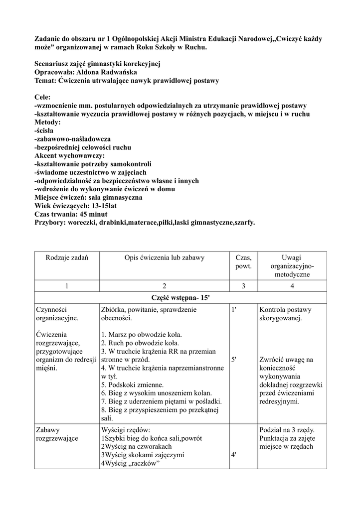 Zadanie do obszaru nr 1 Ogólnopolskiej Akcji Ministra Edukacji Narodowej,,Cwiczyć każdy może” organizowanej w ramach Roku Szkoły w Ruchu. Scenariusz zajęć gimnastyki korekcyjnej Opracowała: Aldona Radwańska Temat: Ćwiczenia utrwalające nawyk prawidłowej postawy Cele: -wzmocnienie mm. postularnych odpowiedzialnych za utrzymanie prawidłowej postawy -kształtowanie wyczucia prawidłowej postawy w różnych pozycjach, w miejscu i w ruchu Metody: -ścisła -zabawowo-naśladowcza -bezpośredniej celowości ruchu Akcent wychowawczy: -kształtowanie potrzeby samokontroli -świadome uczestnictwo w zajęciach -odpowiedzialność za bezpieczeństwo własne i innych -wdrożenie do wykonywanie ćwiczeń w domu Miejsce ćwiczeń: sala gimnasyczna Wiek ćwiczących: 13-15lat Czas trwania: 45 minut Przybory: woreczki, drabinki,materace,piłki,laski gimnastyczne,szarfy. Rodzaje zadań Opis ćwiczenia lub zabawy Czas, powt. Uwagi organizacyjnometodyczne 1 2 3 4 Część wstępna- 15' Czynności organizacyjne. Zbiórka, powitanie, sprawdzenie obecności. Ćwiczenia rozgrzewające, przygotowujące organizm do redresji mięśni. 1. Marsz po obwodzie koła. 2. Ruch po obwodzie koła. 3. W truchcie krążenia RR na przemian stronne w przód. 4. W truchcie krążenia naprzemianstronne w tył. 5. Podskoki zmienne. 6. Bieg z wysokim unoszeniem kolan. 7. Bieg z uderzeniem piętami w pośladki. 8. Bieg z przyspieszeniem po przekątnej sali. Zabawy rozgrzewające Wyścigi rzędów: 1Szybki bieg do końca sali,powrót 2Wyścig na czworakach 3Wyścig skokami zajęczymi 4Wyścig „raczków” 1' Kontrola postawy skorygowanej. 5' Zwrócić uwagę na konieczność wykonywania dokładnej rozgrzewki przed ćwiczeniami redresyjnymi. Podział na 3 rzędy. Punktacja za zajęte miejsce w rzędach 4' Ćwiczenia oddechowe. Korekta postawy w marszu. 1.Marsz z woreczkiem na głowie- wspięcie na palcach, RR w górę-wdech, opad na pięty, RR wzdłuż T- wydech. 2. Marsz w podporze tyłem, woreczek na brzuchu. 5' 3.Marsz z woreczkiem na głowie, RR na biodrach kciukami do przodu, łokcie cofnięte w tył- zrzucenie woreczka przez skłon głowy w przód(w określone miejsce na sali). 4.Poślizg w klęku na kocyku. 5.Poślizg w leżeniu tyłem na kocyku. Korekta postawy w marszu. Część główna- 25' Ćwiczenia elongacyjne. Ćwiczenia antygrawitacyjne. Jw. Rozciąganie mięśni prostownika grzbietu. Jw. Ćwiczenia oddechowe. Ćwiczenia mięśni brzucha. Ćwiczenia z piłkami. 1. Marsz unoszeniem piłki oburącz przodem jak najwyżej w górę i opustem przodem w dół. 2. Bieg z podrzutem piłki w górę i chwytem oburącz nad głową. 3. Bieg z podrzutem piłki w górę, klaśnięcie w dłonie i chwyt piłki oburącz nad głową. 4. Pw.-stanie w rozkroku o nogach prostych. Ruch- toczenie piłki po podłodze między stopami. 5. Pw.-siad prosty. Ruch- toczenie piłki oburącz po nogach. 3x Przemieszczanie się wzdłuż sali. 3x Podczas chwytu wyciągnięcie RR jak najwyżej. 3x 8x Zwrócenie uwagi na trzymanie NN prostych. 8x 6. Pw.- leżenie tyłem, NN ugięte, stopy oparte na podłodze, RR wzdłuż T trzymają 8-10x piłkę. Ruch- wdech nosem z przeniesieniem piłki górą do położenia na podłodze za głowę, wydech ustami jednoczesnym przeniesieniem piłki do pozycji wyjściowej. Zwrócenie uwagi na długość wykonywanego wdechu i wydech. 7. Pw. - siad prosty. Ruch- unoszenie na zmianę PN i LN w górę z jednoczesnym przekładaniem piłki pod uniesioną nogą. Po każdym ćwiczeniu powrót do pozycji wyjściowej o plecach prostych. 10x Rozciąganie mięśni postownika gzrzbietu. 8. Pw.- siat skrzyżny. Ruch- toczenie piłki wokół nóg. Rozciąganie mięśni piersiowych. 9. Pw.- leżenie przodem, laska trzymana w dłoniach oparta na podłodze, czoło oparte na materacu. 8x Ruch- przeniesienie laski jak najdalej w przód i uniesienie jak najwyżej w górę (czoło oparte na materacu), wytrzymanie trzy sekundy, powrót do pozycji wyjściowej. Podczas ćwiczeń czoło oparte na materacu. Wzmocnienie mięśni oddechowych, zwiększenie ruchomości klatki piersiowej. 10. Pw.- siad skrzyżny, w dłoniach trzymana oburącz laska. 8-10x Ruch- wdech nosem z uniesieniem RR z laską w górę, wydech ustami i opuszczenie laski na uda. W czasie ćwiczenia powinna być zachowana pozycja skorygowana. 11. Zabawa „Dziadek i żołnierz”uczestnik zabawy bieganie po sali. Na sygnał prowadzącego dziadek – Cwiczący naśladuje zgarbionego, zmęczonego staruszka. Na hasło żołnierzwyprostowanego żołnierza. Czas naśladowania staruszka- krótki, natomiast naśladowania żołnierzaodpowiednio dłuższy. Elongacja kręgosłupa, wyrabiania nawyku prawidłowej postawy. 8x Część końcowa- 5' Ćwiczenia oddechowe. Pw.- stanie. W dłoniach nad głową 10x ćwiczący trzyma piórko lub kawałek waty. Ruch- silnie dmuchnięcie w piórko tak, aby szybowało jak najdłużej w powietrzu. W czasie ćwiczenia powinna być zachowana postawa skorygowana. Utrwalenie prawidłowej postawy. Pw.- stanie w postawie skorygowanej. Ruch- marsz we wspięciu na palcach z zachowaniem postawy skorygowanej. Zwrócenie uwagi na ułożenie miednicy. Czynności organizacyjnoporządkowe. Podsumowanie zajęć, omówienie realizacji 2' zadań lekcji. Sprzątnięcie przyborów. Pożegnanie. Objaśnienia skrutów: Pw.- pozycja wyjściowa RR- ramiona NN-nogi PN-prawa noga LN- lewa noga T- tułów Jw.- jak wyżej