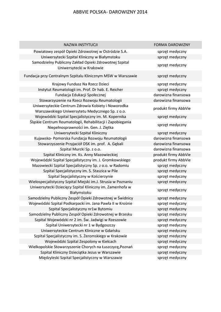 ABBVIE POLSKA- DAROWIZNY 2014 NAZWA INSTYTUCJI FORMA DAROWIZNY Powiatowy zespół Opieki Zdrowotnej w Ostródzie S.A. Uniwersytecki Szpital Kliniczny w Białymstoku Samodzielny Publiczny Zakład Opieki Zdrowotnej Szpital Uniwersytecki w Krakowie sprzęt medyczny sprzęt medyczny Fundacja przy Centralnym Szpitalu Klinicznym MSW w Warszawie sprzęt medyczny Krajowy Fundusz Na Rzecz Dzieci Instytut Reumatologii im. Prof. Dr hab. E. Reicher Fundacja Edukacji Społecznej Stowarzyszenie na Rzecz Rozwoju Reumatologii Uniwersyteckie Centrum Zdrowia Kobiety i Noworodka Warszawskiego Uniwersytetu Medycznego Sp. z o.o. Wojewódzki Szpital Specjalistyczny im. M. Kopernika Śląskie Centrum Reumatologii, Rehabilitacji i Zapobiegania Niepełnosprawności im. Gen. J. Ziętka Uniwersytecki Szpital Kliniczny Kujawsko- Pomorska Fundacja Rozwoju Reumatologii Stowarzyszenie Przyjaciół DSK im. prof. A. Gębali Szpital Murcki Sp. z o.o. Szpital Kliniczny im. Ks. Anny Mazowieckiej Wojewódzki Szpital Specjalistyczny im. J. Gromkowskiego Mazowiecki Szpital Specjalistyczny Sp. z o.o. w Radomiu Szpital Specjalistyczny im. S. Staszica w Pile Szpital Sepcjalistyczny w Kościerzynie Wielospecjalistyczny Szpital Miejski im.J. Strusia w Poznaniu Uniwersytecki Dziecięcy Szpital Kliniczny im. Zamenhofa w Białymstoku Samodzielny Publiczny Zespół Opieki Zdrowotnej w Świdnicy Wojewódzki Szpital Podkarpacki im. Jana Pawła II w Krośnie Szpital Specjalistyczny nr1w Bytomiu Samodzielny Publiczny Zespół Opieki Zdrowotnej w Brzesku Szpital Wojewódzki nr 2 im. Św. Jadwigi w Rzeszowie Szpital Uniwersytecki nr 1 w Bydgoszczy Uniwersyteckie Centrum Kliniczne w Gdańsku Szpital Specjalistyczny im. S. Żeromskiego w Krakowie Wojewódzki Szpital Zespolony w Kielcach Wielkopolskie Stowarzyszenie Chorych na Łuszczycę,Poznań Szpital Kliniczny Dzieciątka Jezus w Warszawie Międzyleski Szpital Specjalistyczny w Warszawie sprzęt medyczny sprzęt medyczny darowizna finansowa darowizna finansowa sprzęt medyczny produkt firmy AbbVie sprzęt medyczny sprzęt medyczny sprzęt medyczny darowizna finansowa darowizna finansowa darowizna finansowa produkt firmy AbbVie produkt firmy AbbVie sprzęt medyczny sprzęt medyczny sprzęt medyczny sprzęt medyczny sprzęt medyczny sprzęt medyczny sprzęt medyczny sprzęt medyczny sprzęt medyczny sprzęt medyczny sprzęt medyczny sprzęt medyczny sprzęt medyczny sprzęt medyczny sprzęt medyczny sprzęt medyczny sprzęt medyczny