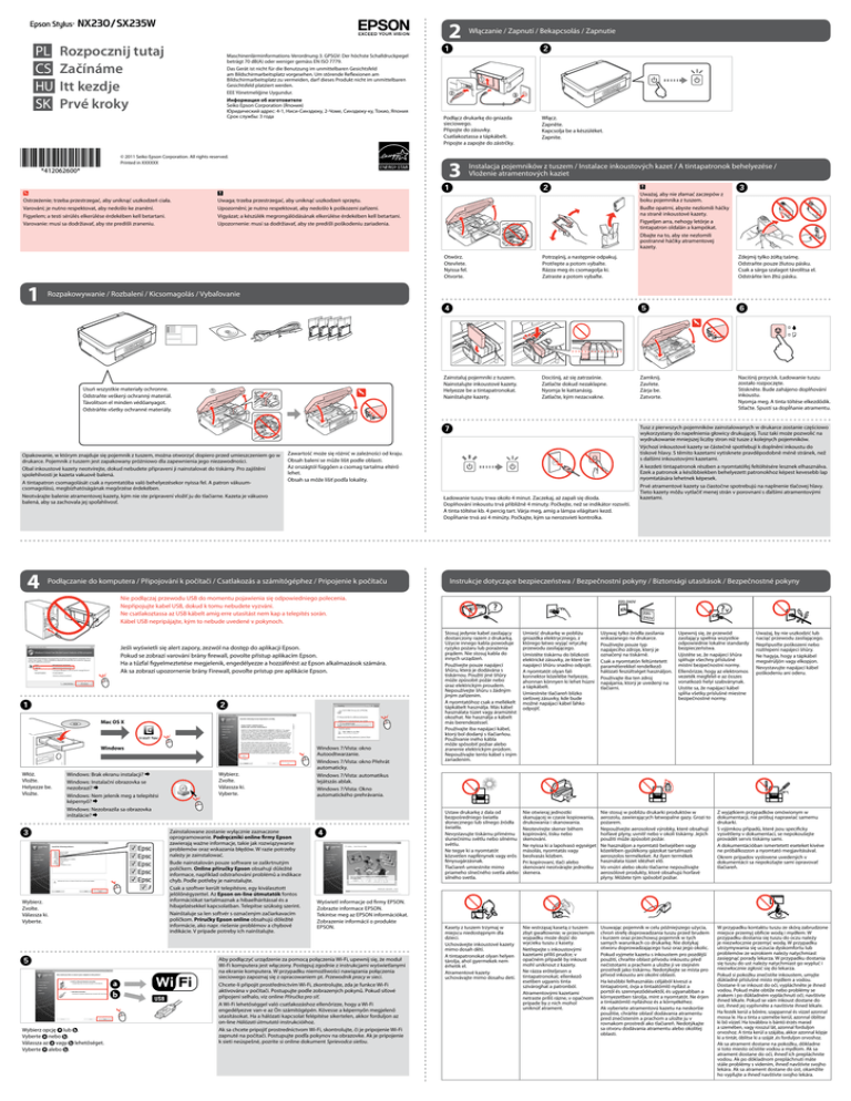 PL CS HU SK 2 Rozpocznij tutaj Začínáme Itt kezdje Prvé kroky Maschinenlärminformations-Verordnung 3. GPSGV: Der höchste Schalldruckpegel beträgt 70 dB(A) oder weniger gemäss EN ISO 7779. Das Gerät ist nicht für die Benutzung im unmittelbaren Gesichtsfeld am Bildschirmarbeitsplatz vorgesehen. Um störende Reflexionen am Bildschirmarbeitsplatz zu vermeiden, darf dieses Produkt nicht im unmittelbaren Gesichtsfeld platziert werden. EEE Yönetmeliğine Uygundur. Информация об изготовителе Seiko Epson Corporation (Япония) Юридический адрес: 4-1, Ниси-Синздюку, 2-Чоме, Синздюку-ку, Токио, Япония Срок службы: 3 года © 2011 Seiko Epson Corporation. All rights reserved. Printed in XXXXXX Włączanie / Zapnutí / Bekapcsolás / Zapnutie A� B� Podłącz drukarkę do gniazda sieciowego. Připojte do zásuvky. Csatlakoztassa a tápkábelt. Pripojte a zapojte do zástrčky. 3 Instalacja pojemników z tuszem / Instalace inkoustových kazet / A tintapatronok behelyezése / Vloženie atramentových kaziet A� w c Ostrzeżenie; trzeba przestrzegać, aby uniknąć uszkodzeń ciała. Varování; je nutno respektovat, aby nedošlo ke zranění. Figyelem; a testi sérülés elkerülése érdekében kell betartani. Varovanie: musí sa dodržiavať, aby ste predišli zraneniu. Uwaga; trzeba przestrzegać, aby uniknąć uszkodzeń sprzętu. Upozornění; je nutno respektovat, aby nedošlo k poškození zařízení. Vigyázat; a készülék megrongálódásának elkerülése érdekében kell betartani. Upozornenie: musí sa dodržiavať, aby ste predišli poškodeniu zariadenia. Otwórz. Otevřete. Nyissa fel. Otvorte. 1 Włącz. Zapněte. Kapcsolja be a készüléket. Zapnite. B� c Uważaj, aby nie złamać zaczepów z boku pojemnika z tuszem. Buďte opatrní, abyste nezlomili háčky na straně inkoustové kazety. Figyeljen arra, nehogy letörje a tintapatron oldalán a kampókat. Dbajte na to, aby ste nezlomili postranné háčiky atramentovej kazety. Potrząśnij, a następnie odpakuj. Protřepte a potom vybalte. Rázza meg és csomagolja ki. Zatraste a potom vybaľte. Zdejmij tylko żółtą taśmę. Odstraňte pouze žlutou pásku. Csak a sárga szalagot távolítsa el. Odstráňte len žltú pásku. Rozpakowywanie / Rozbalení / Kicsomagolás / Vybaľovanie D� Zainstaluj pojemniki z tuszem. Nainstalujte inkoustové kazety. Helyezze be a tintapatronokat. Nainštalujte kazety. Usuń wszystkie materiały ochronne. Odstraňte veškerý ochranný materiál. Távolítson el minden védőanyagot. Odstráňte všetky ochranné materiály. E� Dociśnij, aż się zatrzaśnie. Zatlačte dokud nezaklapne. Nyomja le kattanásig. Zatlačte, kým nezacvakne. G� Opakowanie, w którym znajduje się pojemnik z tuszem, można otworzyć dopiero przed umieszczeniem go w drukarce. Pojemnik z tuszem jest zapakowany próżniowo dla zapewnienia jego niezawodności. Obal inkoustové kazety neotvírejte, dokud nebudete připraveni ji nainstalovat do tiskárny. Pro zajištění spolehlivosti je kazeta vakuově balená. A tintapatron csomagolását csak a nyomtatóba való behelyezésekor nyissa fel. A patron vákuumcsomagolású, megbízhatóságának megőrzése érdekében. Neotvárajte balenie atramentovej kazety, kým nie ste pripravení vložiť ju do tlačiarne. Kazeta je vákuovo balená, aby sa zachovala jej spoľahlivosť. 4 C� Zawartość może się różnić w zależności od kraju. Obsah balení se může lišit podle oblasti. Az országtól függően a csomag tartalma eltérő lehet. Obsah sa môže líšiť podľa lokality. Ładowanie tuszu trwa około 4 minut. Zaczekaj, aż zapali się dioda. Doplňování inkoustu trvá přibližně 4 minuty. Počkejte, než se indikátor rozsvítí. A tinta töltése kb. 4 percig tart. Várja meg, amíg a lámpa világítani kezd. Dopĺňanie trvá asi 4 minúty. Počkajte, kým sa nerozsvieti kontrolka. Podłączanie do komputera / Připojování k počítači / Csatlakozás a számítógéphez / Pripojenie k počítaču F� Zamknij. Zavřete. Zárja be. Zatvorte. Naciśnij przycisk. Ładowanie tuszu zostało rozpoczęte. Stiskněte. Bude zahájeno doplňování inkoustu. Nyomja meg. A tinta töltése elkezdődik. Stlačte. Spustí sa dopĺňanie atramentu. Tusz z pierwszych pojemników zainstalowanych w drukarce zostanie częściowo wykorzystany do napełnienia głowicy drukującej. Tusz taki może pozwolić na wydrukowanie mniejszej liczby stron niż tusze z kolejnych pojemników. Výchozí inkoustové kazety se částečně spotřebují k doplnění inkoustu do tiskové hlavy. S těmito kazetami vytisknete pravděpodobně méně stránek, než s dalšími inkoustovými kazetami. A kezdeti tintapatronok részben a nyomtatófej feltöltésére lesznek elhasználva. Ezek a patronok a későbbiekben behelyezett patronokhoz képest kevesebb lap nyomtatására lehetnek képesek. Prvé atramentové kazety sa čiastočne spotrebujú na naplnenie tlačovej hlavy. Tieto kazety môžu vytlačiť menej strán v porovnaní s ďalšími atramentovými kazetami. Instrukcje dotyczące bezpieczeństwa / Bezpečnostní pokyny / Biztonsági utasítások / Bezpečnostné pokyny Nie podłączaj przewodu USB do momentu pojawienia się odpowiedniego polecenia. Nepřipojujte kabel USB, dokud k tomu nebudete vyzváni. Ne csatlakoztassa az USB kábelt amíg erre utasítást nem kap a telepítés során. Kábel USB nepripájajte, kým to nebude uvedené v pokynoch. Jeśli wyświetli się alert zapory, zezwól na dostęp do aplikacji Epson. Pokud se zobrazí varování brány firewall, povolte přístup aplikacím Epson. Ha a tűzfal figyelmeztetése megjelenik, engedélyezze a hozzáférést az Epson alkalmazások számára. Ak sa zobrazí upozornenie brány Firewall, povoľte prístup pre aplikácie Epson. A� B� Mac OS X Windows Włóż. Vložte. Helyezze be. Vložte. Windows: Br