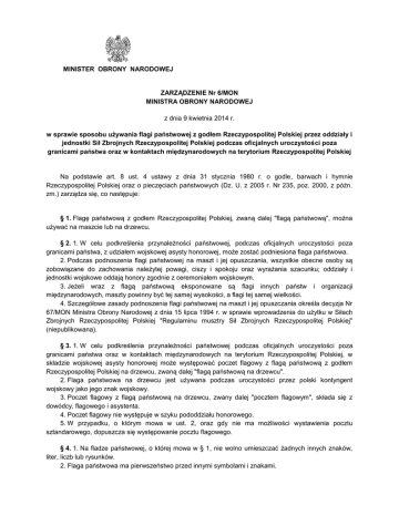 MINISTER OBRONY NARODOWEJ ZARZĄDZENIE Nr 6/MON MINISTRA OBRONY NARODOWEJ z dnia 9 kwietnia 2014 r. w sprawie sposobu używania flagi państwowej z godłem Rzeczypospolitej Polskiej przez oddziały i jednostki Sił Zbrojnych Rzeczypospolitej Polskiej podczas oficjalnych uroczystości poza granicami państwa oraz w kontaktach międzynarodowych na terytorium Rzeczypospolitej Polskiej Na podstawie art. 8 ust. 4 ustawy z dnia 31 stycznia 1980 r. o godle, barwach i hymnie Rzeczypospolitej Polskiej oraz o pieczęciach państwowych (Dz. U. z 2005 r. Nr 235, poz. 2000, z późn. zm.) zarządza się, co następuje: § 1. Flagę państwową z godłem Rzeczypospolitej Polskiej, zwaną dalej "flagą państwową", można używać na maszcie lub na drzewcu. § 2. 1. W celu podkreślenia przynależności państwowej, podczas oficjalnych uroczystości poza granicami państwa, z udziałem wojskowej asysty honorowej, może zostać podniesiona flaga państwowa. 2. Podczas podnoszenia flagi państwowej na maszt i jej opuszczania, wszystkie obecne osoby są zobowiązane do zachowania należytej powagi, ciszy i spokoju oraz wyrażania szacunku; oddziały i jednostki wojskowe oddają honory zgodnie z ceremoniałem wojskowym. 3. Jeżeli wraz z flagą państwową eksponowane są flagi innych państw i organizacji międzynarodowych, maszty powinny być tej samej wysokości, a flagi tej samej wielkości. 4. Szczegółowe zasady podnoszenia flagi państwowej na maszt i jej opuszczania określa decyzja Nr 67/MON Ministra Obrony Narodowej z dnia 15 lipca 1994 r. w sprawie wprowadzenia do użytku w Siłach Zbrojnych Rzeczypospolitej Polskiej "Regulaminu musztry Sił Zbrojnych Rzeczypospolitej Polskiej" (niepublikowana). § 3. 1. W celu podkreślenia przynależności państwowej podczas oficjalnych uroczystości poza granicami państwa oraz w kontaktach międzynarodowych na terytorium Rzeczypospolitej Polskiej, w składzie wojskowej asysty honorowej może występować poczet flagowy z flagą państwową z godłem Rzeczypospolitej Polskiej na drzewcu, zwaną dalej "flagą państwową na drzewcu". 2. Flaga państwowa na drzewcu jest używana podczas uroczystości przez polski kontyngent wojskowy jako jego znak wojskowy. 3. Poczet flagowy z flagą państwową na drzewcu, zwany dalej "pocztem flagowym", składa się z dowódcy, flagowego i asystenta. 4. Poczet flagowy nie występuje w szyku pododdziału honorowego. 5. W przypadku, o którym mowa w ust. 2, oraz gdy nie ma możliwości wystawienia pocztu sztandarowego, dopuszcza się występowanie pocztu flagowego. § 4. 1. Na fladze państwowej, o której mowa w § 1, nie wolno umieszczać żadnych innych znaków, liter, liczb lub rysunków. 2. Flaga państwowa ma pierwszeństwo przed innymi symbolami i znakami. 3. Jeżeli flaga państwowa jest eksponowana z innymi flagami, zajmuje pozycję uprzywilejowaną: 1) w przypadku parzystej liczby flag - umieszcza się ją na pozycji skrajnej po lewej stronie patrząc z przodu, następnie umieszczane są flagi państw i organizacji międzynarodowych w porządku alfabetycznym ich nazw zgodnie z alfabetem używanym w języku polskim, a po nich pozostałe flagi; 2) w przypadku nieparzystej liczby flag - umieszcza się ją w środku, następne flagi umieszczane są naprzemiennie, licząc od środka według kolejności wymienionej w pkt 1; 3) w przypadku większej liczby flag (co najmniej 5) - może być umieszczona na początku oraz na końcu. 4. W przypadku, o którym mowa w § 2, flaga państwowa podnoszona jest na maszt jako pierwsza i opuszczana jako ostatnia. 5. Podczas uroczystości, których organizatorem są władze innego państwa lub organizacji międzynarodowej oraz w wyjątkowych przypadkach wynikających z zasad protokołu dyplomatycznego, pierwszeństwo przed flagą państwową mogą mieć symbole innych państw i organizacji międzynarodowych. 6. Flagi państwowe wycofane z użytku, które posiadają wartość historyczną, związaną z wydarzeniem mającym szczególne znaczenie dla państwa lub Sił Zbrojnych Rzeczypospolitej Polskiej, powinny być przekazane do wojskowej placówki muzealnej lub sali tradycji jednostki wojskowej. § 5. 1. Drzewce flagi państwowej, o którym mowa w § 3 ust. 1, ma wysokość 2 500 mm i jest sporządzone z drewna toczonego. Drzewce jest dwudzielne, połączone tuleją z metalu białego. Na dolnym końcu drzewca znajduje się stożkowate okucie z metalu białego. Na górnym końcu drzewca znajduje się grot w kształcie stożka z metalu białego. 2. Dopuszcza się używanie flagi państwowej z godłem złożonej z dwóch zszytych płatów. 3. Flagę państwową mocuje się do drzewca przy pomocy pasa białej skóry przybitego 7 gwoździami z białego metalu po każdej stronie jej płata (drzewca). 4. Wzór drzewca oraz sposób mocowania flagi państwowej określają załączniki Nr 1 i Nr 2. § 6. Koszty zakupu flag państwowych pokrywają dowódcy jednostek wojskowych w ramach posiadanego budżetu. § 7. Traci moc zarządzenie Nr 31/MON Ministra Obrony Narodowej z dnia 3 grudnia 2007 r. w sprawie sposobu używania flagi państwowej z godłem Rzeczypospolitej Polskiej przez oddziały i jednostki Sił Zbrojnych Rzeczypospolitej Polskiej podczas oficjalnych uroczystości poza granicami państwa oraz w kontaktach międzynarodowych na terytorium Rzeczypospolitej Polskiej (Dz. Urz. Min. Obr. Nar. Nr 23, poz. 236). § 8. Zarządzenie wchodzi w życie z dniem ogłoszenia. MINISTER OBRONY NARODOWEJ / - / Załącznik Nr 1 WZÓR DRZEWCA ORAZ SPOSÓB MOCOWANIA FLAGI PAŃSTWOWEJ STRONA GŁÓWNA Załącznik Nr 2 WZÓR DRZEWCA ORAZ SPOSÓB MOCOWANIA FLAGI PAŃSTWOWEJ STRONA ODWROTNA