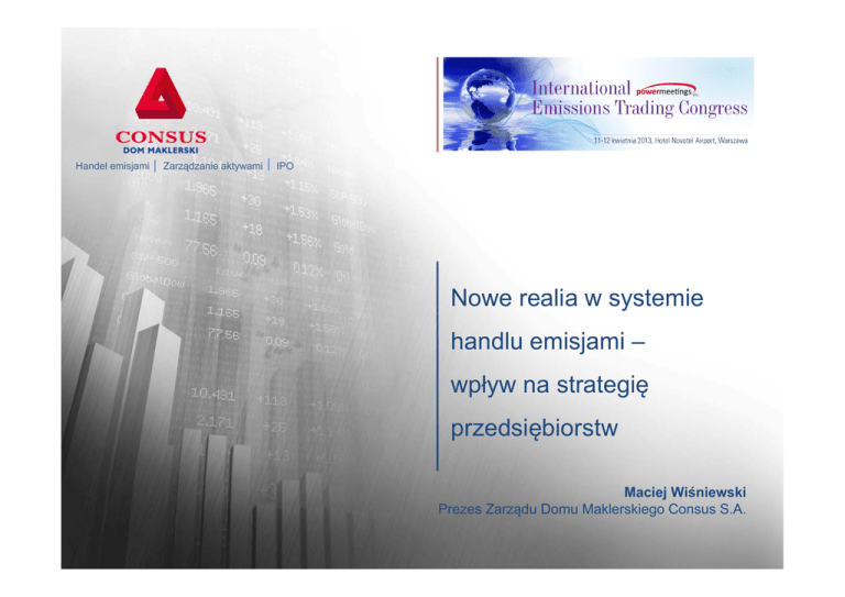 Handel emisjami Zarządzanie aktywami IPO Nowe realia w systemie handlu emisjami – wpływ na strategię przedsiębiorstw Maciej Wiśniewski Prezes Zarządu Domu Maklerskiego Consus S.A. Spis treści 1. 2. 3. 4. 5. 6. 7. 8. 9. 10. Co to jest EU ETS? Czynniki wpływające na cenę Bilans 2008 – 2020 Przewidywania cen Gdzie można kupić Kto może handlować Co się zmienia na rynku Co to oznacza dla operatorów posiadających własne Trading Deski Nowe obowiązki dla Trading Desków Dlaczego tak się dzieje oraz rozwiązania 3 4 6 11 20 21 22 26 30 31 2 1. Co to jest EU ETS? EU ETS • EU ETS jest wdrożeniem elastycznego mechanizmu (ETS) z międzynarodowego porozumienia z Kioto. • EU ETS ma na celu: o Ograniczenie emisji gazów cieplarnianych. o Dywersyfikacja źródeł wytwarzania energii i paliw energetycznych. Pierwszy Dom Maklerski w Polsce na Rynku Carbon 3 3 2. Czynniki wpływające na cenę CENA EUA Pierwszy Dom Maklerski w Polsce na Rynku Carbon 4 2. Czynniki wpływające na cenę Czynniki • Popyt i podaż – dotyczy wszystkich jednostek, • Backloading, • Wycofanie jednostek, • Wymienność jednostek, • Zwiększenie popytu o Polaczenie z innymi systemami, o Rozliczenie NON-ETS, Pierwszy Dom Maklerski w Polsce na Rynku Carbon 5 5 3. Bilans 2008 - 2020 – CER i ERU Bilans 2008 – 2020 • Wydanych CERs - 1,283,182,415 • Wydanych ERUs - 731,854,280 • Wykorzystanych w UE – w 2011 - 555 mln z 1,4 mld. • Do wykorzystania w UE w latach 2008-2020 – nie więcej niż 1,4 mld. • CER i ERU wydane i dostępne po maju 2013 r. – 800 mln Pierwszy Dom Maklerski w Polsce na Rynku Carbon 6 6 3. Bilans 2008-2020 – CER i ERU Bilans 2008 – 2020 • Popyt na te jednostki z innych systemów • Brak dopływu nowych jednostek – niepewna sytuacja Pierwszy Dom Maklerski w Polsce na Rynku Carbon 7 7 3. Bilans 2008-2020 Alokacja 2012 Zweryfikowane emisje 2012 Alokacja 2011 Zweryfikowane emisje 2011 Alokacja 2010 2 212 038 444 1 842 346 293 2 016 868 199 1 904 437 530 1 998 164 671 Zweryfikowane Zweryfikowane Alokacja 2009 emisje 2010 emisje 2009 Alokacja 2008 Zweryfikowane emisje 2008 1 958 524 462 2 119 682 004 RAZEM Europa Suma [tCo2] Bilans roczny [+nadwyżka/niedobór] Zmiana % emisji rok do roku 1 939 463 509 1 974 533 671 1 879 567 203 369 692 151 112 430 669 58 701 162 94 966 468 -3,26% -1,81% 3,19% -11,33% Pierwszy Dom Maklerski w Polsce na Rynku Carbon -161 157 542 474 632 908 260 000 000 8 3. Bilans 2008-2020 Dane rzeczywiste 2011 Założenie 2013 2014 2015 2016 2017 2018 2019 2020 1 904 437 530 1 904 437 530 1 904 437 530 1 904 437 530 1 904 437 530 1 904 437 530 1 904 437 530 1 904 437 530 1 904 437 530 2 016 868 199 2 039 152 882 2 001 717 495 1 964 282 108 1 926 846 721 1 889 411 334 1 851 975 947 1 814 540 560 1 777 105 173 Emisje Przydział 112 430 669 134 715 352 97 279 965 59 844 578 22 409 191 -15 026 196 -52 461 583 -89 896 970 -127 332 357 Bilans 29 531 980 Pierwszy Dom Maklerski w Polsce na Rynku Carbon 9 3. Bilans 2008-2020 Bilans 2008 – 2020 • Nadwyżki 2008-2012 z przydziału – ok. 260mln. • Nadwyżki 2008-2012 z rezerw – ok. 500mln. • NER 2008-2012 – ok. 200mln. • Rozliczone CER i ERU w 2008-2020 – ok. 1,4mld. • Nadwyżka z przydziału 2013-2020 – ok. 30mln • RAZEM nadwyżka – 2190 mln Pierwszy Dom Maklerski w Polsce na Rynku Carbon 10 10 4. Przewidywania cen COMPANY Commerzbank Consus Jefferies Bache Nomisma Energia Point Carbon Solvay Energy Services Schwarzthal 70Watt Consulting Societe Generale Tschach Solutions UBS Unicredit Average Previous poll Change 2013 8,5 4,35 5 4,6 6 10 4,5 2,54 6,5 4 5 4,6 5,47 5,58 -2,05 2014 12,5 5,26 12,5 8 11 11 6,75 2,62 7,5 10 6 6 8,26 8,38 -1,42 2015 2016 PHASE3 6,83 13,5 10,9 14 12 8 2,69 8,5 7,57 6,91 13 12,4 11 12,1 10,5 2,67 9,15 7 8 9,27 9,06 -2,31 8,49 8,29 2,45 9,6 12 10 2,78 9,5 Pierwszy Dom Maklerski w Polsce na Rynku Carbon 7,9 8,5 9,41 9,6 -1,96 11 4. Przewidywania cen ECX CER JUN3 ECX CER SEP3 ECX CER DEC3 ECX CER MAR4 ECX CER JUN4 ECX CER SEP4 ECX CER DEC4 ECX CER MAR5 ECX CER JUN5 ECX CER SEP5 ECX CER DEC5 ECX CER DEC6 ECX CER DEC7 ECX CER DEC8 ECX CER DEC9 ECX CER DEC0 0,41 0,42 0,41 0,42 0,43 0,44 0,44 0,44 0,45 0,46 0,47 0,58 0,69 0,75 0,9 1 EUR EUR EUR EUR EUR EUR EUR EUR EUR EUR EUR EUR EUR EUR EUR EUR ECX EUA APR3 ECX EUA MAY3 ECX EUA JUN3 ECX EUA SEP3 ECX EUA DEC3 ECX EUA MAR4 ECX EUA JUN4 ECX EUA SEP4 ECX EUA DEC4 ECX EUA MAR5 ECX EUA JUN5 ECX EUA SEP5 ECX EUA DEC5 ECX EUA MAR6 ECX EUA JUN6 ECX EUA SEP6 ECX EUA DEC6 ECX EUA DEC7 ECX EUA DEC8 ECX EUA DEC9 ECX EUA DEC0 5,1 5,11 5,13 5,16 5,19 5,24 5,29 5,35 5,41 5,46 5,51 5,57 5,63 5,69 5,76 5,83 5,9 6,18 6,55 6,94 7,33 Pierwszy Dom Maklerski w Polsce na Rynku Carbon EUR EUR EUR EUR EUR EUR EUR EUR EUR EUR EUR EUR EUR EUR EUR EUR EUR EUR EUR EUR EUR 12 4. Przewidywania cen EEX – Lipsk Ostatnia aukcja EUA 26.03.13 [€/t CO2] SPOT EUA spot [€/t CO2] EUA Future - Dec 2013 [€/t CO2] Natural gas spot (NCG) [€/MWh] Power ELIX spot [€/MWh] Coal ARA Futures – Apr 2013 [US $/t] THE ICE – Londyn EUA Daily Futures CER Daily Futures EUA Future - Dec 2013 [€/t CO2] CER Future - Dec 2013 [€/t CO2] Ropa Brent Europe [US$/1000 barrels] 4,54 4,56 4,66 39,51 59,16 80,56 4,55 0,14 4,62 0,33 108,25 Prognoza kasowego rynku carbon Okres Średnie ceny w okresie [€] EUA CER prognozy 4,56 0,14 2013 H1 2013 H2 2014 2015 2016 2013-2020 Pierwszy Dom Maklerski w Polsce na Rynku Carbon 4,14 0,17 5,26 0,21 6,83 0,24 7,57 0,27 6,91 0,28 13 4. Przewidywania cen Projekcje kluczowych czynników wpływających na prognozę cen rynku carbon Czynnik 2013 2014 2015 2016-2020 EUROPE GDP growth [ % ] 0,4 1,6 1,9 2 EUROPE Population [mln] 503,92 505,35 506,79 511,30 EUROPE Natural Gas [US $ / mmbtu] 10,70 10,95 11,2 11,78 IEA Crude Oil imported [US $ / barrel] 113,13 115,73 118,4 124,71 Pierwszy Dom Maklerski w Polsce na Rynku Carbon 14 4. Przewidywania cen - podsumowanie Pierwszy Dom Maklerski w Polsce na Rynku Carbon 15 4. Przewidy