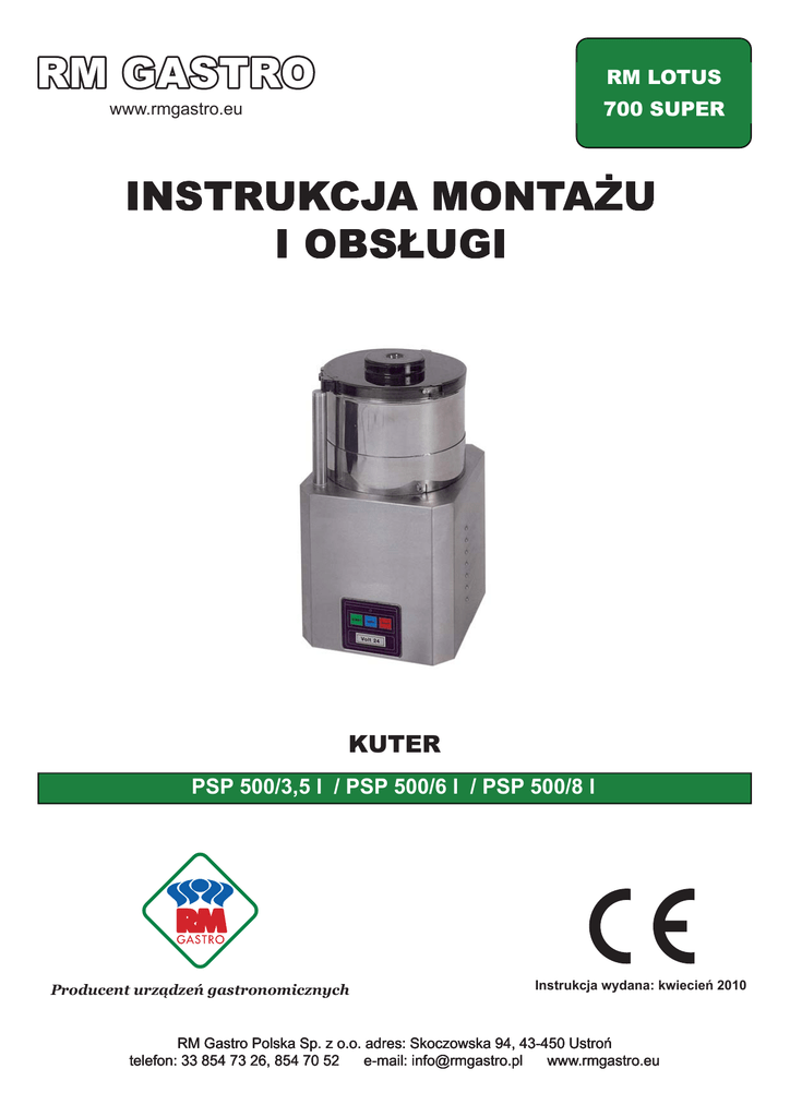 RM LOTUS 700 SUPER www.rmgastro.eu INSTRUKCJA MONTAŻU I OBSŁUGI KUTER PSP 500/3,5 l / PSP 500/6 l / PSP 500/8 l Producent urządzeń gastronomicznych Instrukcja wydana: kwiecień 2010 RM Gastro Polska Sp. z o.o. adres: Skoczowska 94, 43-450 Ustroń telefon: 33 854 73 26, 854 70 52 e-mail: [email protected] www.rmgastro.eu Spis treści 2 1. Wstęp 3 2. Opis i dane techniczne 4 3. Instalacja i umiejscowienie 5 4. Podłączenie do sieci elektrycznej 5 5. Instrukcja obsługi 6 6. Czyszczenie i konserwacja 10 7. Schematy podłączenia 11 8. Gwarancja 12 Firma RM Gastro przekazuje w Państwa ręce to urządzenie z nadzieją, że stanie się ono źródłem komfortu pracy, dochodów i inspiracj. Niniejsza instrukcja ma na celu usprawnienie pracy z urządzeniem i ochronę bezpieczeństwa użytkownika, dlatego prosimy o uważne jej przeczytanie. 1. Wstęp Producent nie odpowiada za pośrednie lub bezpośrednie szkody wynikłe ze złej instalacji, konserwacji, niewłaściwego użytkowania lub nieprzestrzegania przepisów wymienionych w tej instrukcji. • • • • • • • • Polecenia ważne są dla modeli: PSP 500 Instrukcję należy starannie przechowywać. Urządzenie może obsługiwać wyłącznie osoba dorosła i przeszkolona. Zabrania się obsługiwania urządzenia osobm pod wpłwem alkoholu lub środków odurzających. Nie pozostawiać pracującego urządzenia bez dozoru. Przy sprzedaży lub przemieszczeniu urządzenia należy się upewnić, że obsługa lub serwis zapoznał się z instrukcją obsługi i montażu. Zaleca się przegląd urządzenia minimum 2 razy w roku przez pracowników serwisu. Przy wymianach części używać oryginalnych części zamiennych. Zabrania się dokonywania napraw przez osoby nieupoważnione pod groźbą utraty gwarancji. Urządzenia nie należy czyścić pod bieżącą wodą lub wodą pod ciśnieniem. W przypadku wystąpienia awarii urządzenia należy bezzwłocznie odłączyć wszelkie zasilanie oraz wezwać autoryzowany serwis. Zabrania się używania urządzenia niesprawnego technicznie Osoby obsługujące powinny być ubrane w czyste i higieniczne ubranie ochronne, zapewniające bezpieczną i wygodną obsługę . • Niestosowanie się do podanych instrukcji i wskazówek BHP może powodować urazy w wyniku porażenia prądem elektrycznym jak również urazy mechaniczne np. uderzenia, otarcia. Nieprzestrzeganie zasad higieny (czystości) i należytej konserwacji może powodować zagrożenia biologiczne np. zatrucia, kontakt żywności z narzędziami roboczymi i osłonami w strefie spożywczej. 3 2. Opis i dane techniczne Tabliczka znamionowa znajduje się na tylnej ściance urządzenia. Przed instalacją należy zaznajomić się z instrukcją podłączenia instalacji elektrycznej i gazowej. Wszystkie urządzenia posiadają znak CE. Urządzenie nie emituje hałasu powyżej 70 dB. Typ Wysokoś A (cm) Szerokość B (cm) Obroty (obr./min) Napięcie (V) Moc (kW) PSP 500/3,5 40 24 1400 230/400 0,55 12 PSP 500/6 44 28 1400 230/400 1,1 20 PSP 500/8 55 28 1400 230/400 1,1 22 wymiary urządzenia podane są w tabeli powyżej 4 Waga (kg) 3. Instalacja i umiejscowienie Jakiekolwiek czynności montażowe i regulacyjne powinny być wykonywane, gdy urządzenie jest odłączone od sieci. Jeśli w procesie regulacji konieczne jest zasilanie urządzenia, należy zachować szczególną ostrożność. Montaż, demontaż oraz wszelkie przeróbki powinny być przeprowadzone na podstawie pisemnej umowy z autoryzowaną firmą serwisową z zachowaniem przepisów zgodnych z obowiązującymi normami w sprawie montażu i podłączenia urządzenia. Montaż, regulację oraz oddanie do użytku musi przeprowadzić osoba o odpowiednich kwalifikacjach - posiadająca uprawnienia elektryczne zgodne z obowiązującymi normami. Urządzenie należy umieścić na stabilnej, poziomej powierzchni (z max. nierownością do 2°) i wypoziomować za pomocą regulacji nóżek. 4. Podłączenie do sieci elektrycznej Przewód elektryczny powinien posiadać oddzielny bezpiecznik, odpowiadający mocy instalowanego urządzenia. Moc urządzenia należy skontrolować na tabliczce znamionowej umieszczonej z tyłu urządzenia. Listwa zaciskowa znajduje się na spodzie tylnej części obudowy. Przewód uziemienia musi być dłuższy od pozostałych przewodów. Urządzenie należy podłączyć do sieci. Między urządzeniem a siecią należy zamontować wyłącznik zabezpieczający zgodny z normami. Przewód uziemiający nie może być podłączony do tego wyłącznika. Kabel elektryczny powinien być umieszczony tak, aby w żadnym punkcie nie osiągnął temperatury o 50° wyższej od otoczenia. Przed podłączeniem do sieci należy sprawdzić czy: • bezpiecznik wewnętrzny oraz instalacja są odpowiednie do obciążenia urządzenia • (patrz tabliczka znamionowa) • instalacja posiada uziemienie zgodne z normami • wyłącznik zabezpieczający jest łatwo dostępny • urządzenie jest uziemione za pomocą śruby z oznaczeniem uziemienia. 5 5. Instrukcja obsługi Przed pierwszym użyciem należy: • ściągnąć wszelkie folie zabezpieczające • przemyć urządzenie wodą z płynem do mycia naczyń, zmyć detergent i wytrzeć do sucha Nie należy pozostawiać pracującego urządzenia bez dozoru. Temperatura pracy urządzenia: Temperatura przechowywania: Moc silnika: 0-32 oC -15 - +65 oC 80% przy temperaturze 20oC 50% przy temperaturze 60oC Kutry PSP-500 są zaopatrzone w magnetyczny wyłącznik bezpieczeństwa, któy znajduje się w plastikowej pokrywie (rys. 2). Kiedy wieko jest otwarte lub niedomknięte mikrowyłącznik blokuje włączenie urządzenia. Aby uruchomić urządzenie należy: • nacisnąć przycisk START (rys. 3, następna strona) • skontrolować obroty silnika - rys. 4 na następnej stronie (powinny być zgodne ze strzałką umieszczoną na obudowie) Aby zatrzymać urządzenie należy nacisnąć przycisk STOP. Obsługa: 1. Otwórz wieko obudowy 2. Włóż proukty spożywcze do 