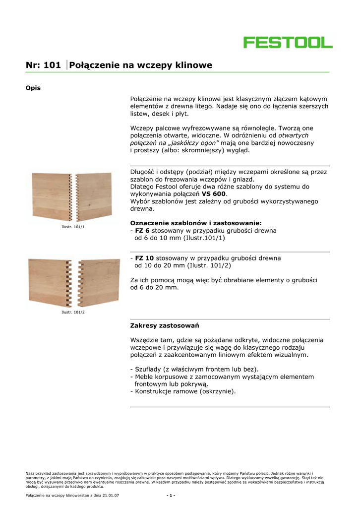 Nr: 101 Połączenie na wczepy klinowe Opis Połączenie na wczepy klinowe jest klasycznym złączem kątowym elementów z drewna litego. Nadaje się ono do łączenia szerszych listew, desek i płyt. Wczepy palcowe wyfrezowywane są równolegle. Tworzą one połączenia otwarte, widoczne. W odróżnieniu od otwartych połączeń na „jaskółczy ogon” mają one bardziej nowoczesny i prostszy (albo: skromniejszy) wygląd. Długość i odstępy (podział) między wczepami określone są przez szablon do frezowania wczepów i gniazd. Dlatego Festool oferuje dwa różne szablony do systemu do wykonywania połączeń VS 600. Wybór szablonów jest zależny od grubości wykorzystywanego drewna. Ilustr. 101/1 Oznaczenie szablonów i zastosowanie: - FZ 6 stosowany w przypadku grubości drewna od 6 do 10 mm (Ilustr.101/1) - FZ 10 stosowany w przypadku grubości drewna od 10 do 20 mm (Ilustr. 101/2) Za ich pomocą mogą więc być obrabiane elementy o grubości od 6 do 20 mm. Ilustr. 101/2 Zakresy zastosowań Wszędzie tam, gdzie są pożądane odkryte, widoczne połączenia wczepowe i przywiązuje się wagę do klasycznego rodzaju połączeń z zaakcentowanym liniowym efektem wizualnym. - Szuflady (z właściwym frontem lub bez). - Meble korpusowe z zamocowanym wystającym elementem frontowym lub pokrywą. - Konstrukcje ramowe (oskrzynie). Nasz przykład zastosowania jest sprawdzonym i wypróbowanym w praktyce sposobem postępowania, który możemy Państwu polecić. Jednak różne warunki i parametry, z jakimi mają Państwo do czynienia, znajdują się całkowicie poza naszymi możliwościami wpływu. Dlatego wykluczamy wszelką gwarancję. Stąd też nie mogą być wysuwane przeciwko nam ewentualne roszczenia prawne. W każdym przypadku należy postępować zgodnie ze wskazówkami bezpieczeństwa i instrukcją obsługi, dołączanymi do każdego produktu. Połączenie na wczepy klinowe/stan z dnia 21.01.07 -1- Zalety tego połączenia • Wysoka stabilność. • Relatywnie szybkie wykonanie (dobre w przypadku produkcji małych serii). • Za jego pomocą można łączyć ze sobą elementy drewniane o różnej grubości. Wady tego połączenia • Przy sklejaniu konieczna jest prasa do korpusów lub ściski do korpusów. Wskazówki dotyczące konstrukcji i jej rozplanowania • Jest możliwe łączenie ze sobą elementów drewnianych o różnej grubości. Np. w przypadku szuflad element frontowy może być wybrany grubszy niż tył i ścianki boczne. • Aby w obu narożach uzyskać po pół wczepu, szerokość deski powinna być podzielna przez 10 albo 6. Maszyny/wyposażenie Podstawowe wyposażenie: - Frezarka górnowrzecionowa (Festool OF 900 E, OF 1000 EB, OF 1010 EB). Ilustr. 101/3 OF 1010 EB Festool - System do wykonywania połączeń VS 600 GE (nr zamów. 488 876). Ilustr. 101/4 Nasz przykład zastosowania jest sprawdzonym i wypróbowanym w praktyce sposobem postępowania, który możemy Państwu polecić. Jednak różne warunki i parametry, z jakimi mają Państwo do czynienia, znajdują się całkowicie poza naszymi możliwościami wpływu. Dlatego wykluczamy wszelką gwarancję. Stąd też nie mogą być wysuwane przeciwko nam ewentualne roszczenia prawne. W każdym przypadku należy postępować zgodnie ze wskazówkami bezpieczeństwa i instrukcją obsługi, dołączanymi do każdego produktu. Połączenie na wczepy klinowe/stan z dnia 21.01.07 -2- Przydatny osprzęt (nie jest zawarty w zakresie dostawy): - Czop centrujący (nr zamów. 492 187), kształt stożkowy umożliwia dokładne centrowanie pierścienia do kopiowania, nadaje się do zastosowania tylko do FZ 10. - Osłona ssąca: umożliwia skuteczne odsysanie wiórów bezpośrednio w miejscu, gdzie powstają (nr zamów. 484 453). Odkurzacz z wężem ssącym D 27 Ilustr. 101/5 CTL 22 E-SG Wyposażenie do obróbki drewna o grubości 6 - 10 mm: - 1 jednostka do wczepów klinowych FZ 6 (nr zamów. 488 879) - 1 pierścień do kopiowania KR D 8,5 (jest zawarty w zakresie dostawy FZ 6). - 1 frez spiralny do wpustów HS Spi 6/16/50 (nr zamów. 490 944) do drewna drzew iglastych lub HW Spi 6/16/50 (nr zamów. 490 978) do twardszych rodzajów drewna. Ilustr. 101/6 Wyposażenie do obróbki drewna o grubości 10 - 20 mm: - 1 jednostka do wczepów klinowych FZ 10 (nr zamów. 488 880) - 1 pierścień do kopiowania KR D 13,8 (jest zawarty w zakresie dostawy FZ 10). - 1 frez spiralny do wpustów HS Spi 10/30/60 (nr zamów. 490 946) do drewna drzew iglastych lub HW Spi 10/30/60 (nr zamów. 490 980) do twardszych rodzajów drewna. Wskazówka: • Frezy HW nadają się do wszystkich rodzajów drewna i cechują się dłuższym okresem użytkowania. • W porównaniu do tradycyjnych frezów do wpustów z ostrzem prostym, frezy spiralne do wpustów dają przy małej sile posuwu krawędzie niemal wolne od wyrw. Nasz przykład zastosowania jest sprawdzonym i wypróbowanym w praktyce sposobem postępowania, który możemy Państwu polecić. Jednak różne warunki i parametry, z jakimi mają Państwo do czynienia, znajdują się całkowicie poza naszymi możliwościami wpływu. Dlatego wykluczamy wszelką gwarancję. Stąd też nie mogą być wysuwane przeciwko nam ewentualne roszczenia prawne. W każdym przypadku należy postępować zgodnie ze wskazówkami bezpieczeństwa i instrukcją obsługi, dołączanymi do każdego produktu. Połączenie na wczepy klinowe/stan z dnia 21.01.07 -3- Przygotowanie/ustawianie Wybór drewna: w części czołowej nie mogą występować sęki ! Przycięcie: długość deski = długość obrabianego elementu Oznakowanie (trójkąt stolarski) . • W przypadku szuflad umieścić znak na górnych wąskich krawędziach. • W przypadku elementów korpusowych umieścić znak na przednich wąskich krawędziach. Ilustr. 101/7 Wskazówka: zasadniczo przy wykonywaniu szuflad górne, widoczne wąskie krawędzie powinny przylegać do zderzaków, a w przypadku elementów korpusowych do zderzaków winny przylegać przednie wido