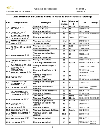 Camino de Santiago 01.2014 r. Camino Vía de la Plata :: Maciej R. Lista schronisk na Camino Vía de la Plata na trasie Sewilla – Astorga Km Miejscowość 0,0 SEVILLA 22,8 GUILLENA CASTILBLANCO DE LS ARROYOS ALMADEN DE LA 29,3 PLATA 18,2 14,8 19,7 21,6 6,0 14,3 14,3 4,2 8,0 7,0 27,4 16,0 Ilość Cena w miejsc € Albergue Tel Uwagi Albergue Triana Albergue Juvenil Albergue Municipal Albergue Luz del Camino 50 300 20 13 13 z śn 15 10 12 z śn 954459960 955056500 672373099 667727380 665068222 Albergue Municipal 28 Donat. 955734811 64/16 6 32 12 14 7 12 z śn 8/10 10 12 z śn 649327285 622175519 954773007 654862553 607742350 50 10 647234400 12 30 16 10 924516097 678277716 Zamk. 12 z śn 924584745 678277716 36 6 924584745 Zamk. 18 10 691537283 Zamk. 638284988 30 10 617846551 20 10 691537283 665962628 40 3 924548401 24 12,5 634905944 12 12 12 22 18 10 10 15/18 12 z śn 12 z śn 665261758 691537283 646179914 924340070 924340407 658854372 18 6 646216341 17 27 10 Donat. 616515195 12/9 6 927383002 Albergue Municipal La Casa del Reloj Albergue Municipal EL REAL DE LA JARA Alojamiento del Peregrino Alojamiento Molina Albergue Municipal Las Moreras MONESTERIO Albergue Parroquial FUENTE DE CANTOS Albergue Alba Plata A.R El Zaguán de la Plata CALZADILLA DE LOS Albergue municipal (+1'8 Km) BARROS ?PUEBLA DE Albergue Alba Plata (+1'4 km) SANCHO PEREZ Albergue Amigos del Camino Zafra ZAFRA Albergue Alba Plata LOS SANTOS DE Albergue Municipal (+1'2 Km) MAIMONA Albergue Turístico La LA ALMAZARA Almazara Albergue Tierra de Barros VILLAFRANCA DE Albergue el Carmen LOS BARROS Casa Perin Albergue Alba Plata TORREMEJÍA Albergue Rojo & Plata Albergue Molino del Pan MERIDA Caliente Albergue Analena ALJUCEN 15,9 20,0 ALCUESCAR Albergue Esclavos de Maria 14,5 ALDEA DEL CANO Albergue Miliario del Verdinal 11,2 VALDESALOR Albergue Municipal 14 6 927129711 11,8 CACERES Albergue Municipal 60 16 670360552 1 500m od N-630 927120024 Śn =2€, kol= 5€ Camino de Santiago 01.2014 r. Camino Vía de la Plata :: Maciej R. Śn= 3€, kol= 8€ Albergue Las Veletas 40 17 Albergue Municipal 18 Donat./gr 927290002 atis 21,8 EMBALSE DE Albergue Alba Plata (+0'6 km) 26 15 z śn 11,4 ?CAÑAVERAL Albergue Municipal 6 8,9 GRIMALDO Albergue Municipal 12 Donat. 927300460 645125102 20,5 GALISTEO Albergue Municipal 12 7 665270182 Śn =3€, 24 14 z śn 676477341 12 15 10 11 15 z śn Donat. 13/ 15 z śn 927402075 676477341 647401877 927484048 12 12 z śn 927488048 18 12 923414216 24 12 /10 646410643 12 6 648401608 70 Donat. 923151083 10 10 6 10 7 6 638149855 636208086 923344075 923344071 16 Donat. 923194249 652921185 65 12 923269141 150 16 923194249 8 5 678642690 923310016 16 10 8 10 20 36 12 12 6 6/10 Donat 980577301 Zamk. 633424321 685808085 Śn=2,5€, 980560017 616848319 980509427 11,0 CASAR DE CACERES ALCANTARA Albergue Municipal los Milliarios Albergue Señora Elena OLIVA DE PLASENCIA Albergue Turístico Albergue Municipal ALDEANUEVA DEL Albergue La Casa de mi CAMINO Abuela BAÑOS DE Albergue Turístico MONTEMAYOR PUERTO DE BEJAR Albergue Turistico El Acebo LA CALZADA DE Albergue Alba-Soraya BEJAR VALVERDE DE Albergue Nenufar VALDELACASA FUENTEROBLE DE Albergue Parroquial (Padre Blas) SALVATIERRA SAN PEDRO DE Albergue el Miliario Albergue Mari Carmen ROZADOS Albergue Municipal MORILLE Albergue Casa la Calera (ot.16:00 h) Albergue Juvenil Salamanca SALAMANCA Albergue Juvenil Lazarillo de Tormes CALZADA DE Albergue Municipal VALDUNCIEL Albergue Municipal EL CUBO DE LA Albergue Torre de Sabre TIERRA DEL VINO Albergue F & M VILLANUEVA DE Albergue Municipal Albergue Via de la Plata CAMPEAN Albergue Municipal ZAMORA 10,9 CARCABOSO 18,4 27,0 9,8 2,8 9,6 8,6 11,6 28,5 4,0 19,0 15,8 20,6 13,2 18,6 26 927211210 664262742 927300067 Zamk. 630410740 692531587 Colonia San Miguel 6,8 ROALES DEL PAN Refugio 4 Gratis 980538670 675094879 11,8 MONTAMARTA Albergue de Peregrinos (-0,5 km) 20 5 685104807 980550112 2 Camino de Santiago 01.2014 r. Camino Vía de la Plata :: 12,6 3,8 FONTANILLAS DE CASTRO RIEGO DEL CAMINO Maciej R. Albergue Municipal ? 4 Donat 615974962 Albergue Municipal 15 Donat 675700311 980593570 10 5 980587183 980587005 14 8/10 z śn 675550051 980640073 GRANJA DE Albergue Municipal MORERUELA 17,2 BARCIAL DEL BARCO Albergue Las Eras 6,5 10,0 BENAVENTE Albergue Municipal 12 4 980631349 7,6 VILLABRAZARO Albergue Municipal 12 Donat 980642630 Albergue Bodegon d Ozaniego (-1,5 km) 12 10 z śn 652750237 20,5 LA BAÑEZA Albergue Municipal 36 4 987641776 987640992 164 5 987616034 618271773 24,2 ASTORGA Albergue d Peregrinos Siervas de Maria Albergue de Peregrinos San Javier 95 8 987618532 13,3 „Km” ALIJA DEL INFANTADO Opis: zawiera liczbę kilometrów od poprzedniej miejscowości z albergue. „Miejscowość” nazwa miejscowości z albergue; Ikony: - sklep; - restauracja-można zjeść obiad. „Albergue” nazwa albergue – schroniska, które przyjmują pielgrzymów z credencialem („paszportem pielgrzyma”). Warunki: nocleg na łóżkach piętrowych w wieloosobowych i koedukacyjnych pokojach, często wspólne łazienki z prysznicami z ciepłą wodą. Dopisek (-+ km) oznacza że schronisko jest położone przed lub za miejscowością w podanej odległości w km. „Ilość miejsc” Określa liczbę miejsc do spania w schronisku. „Cena w €” Cena za nocleg i korzystanie z wszystkich urządzeń i wyposażenia w euro. „Donat.” –donativo oznacza opłatę za nocleg wg uznania pielgrzyma, nie jest równoznaczna, że nie należy płacić. Kiedyś to było 2-3 euro, obecnie 5 euro i więcej gdy w schronisku organizowany jest wspólny posiłek. Posiłek jemy z datków pielgrzymów poprzedniej nocy, a my finansujemy posiłek pielgrzymom, którzy przyjdą tu jutro! „Gratis” oznacza, że za schronisko nie jest pobierana opłata. Dopisek „z śn” oznacza, że w cenie jest śniadanie kontynentalne (kawa, herbata, sok, pieczywo, dżem, masło). „Tel” Nr telefonu kontaktowego do osoby opiekującej się schroniskiem i posia