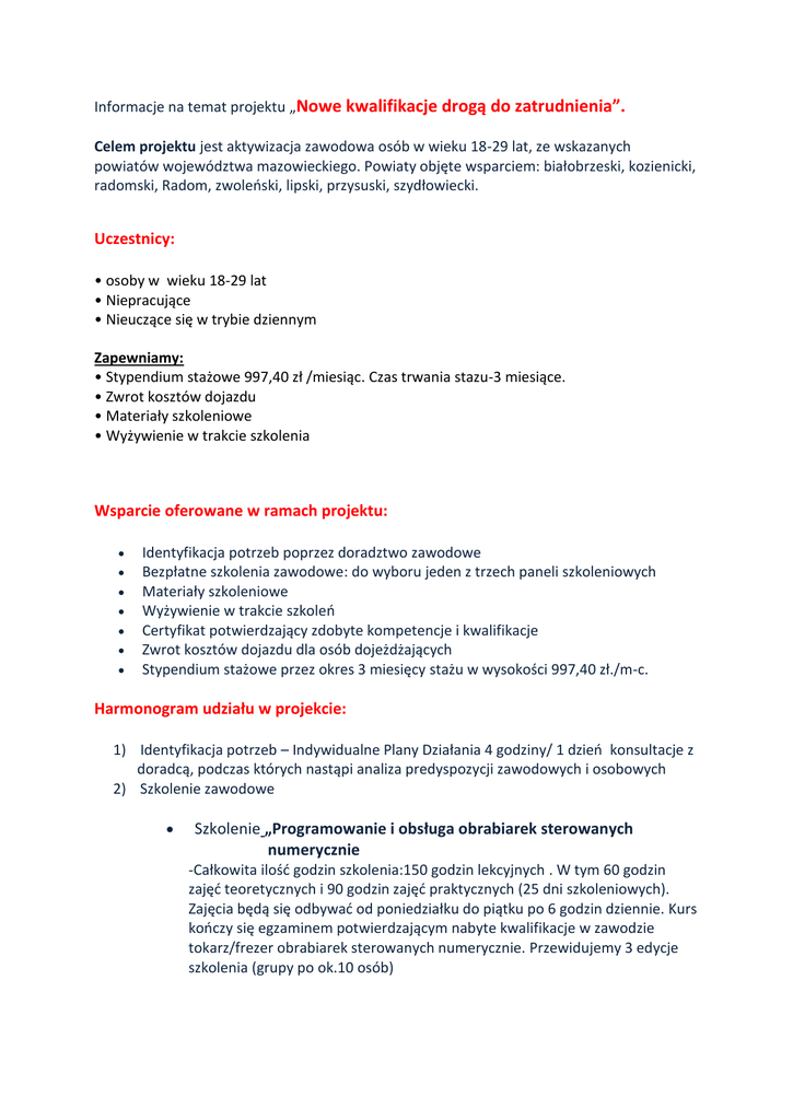 Informacje na temat projektu „Nowe kwalifikacje drogą do zatrudnienia”. Celem projektu jest aktywizacja zawodowa osób w wieku 18-29 lat, ze wskazanych powiatów województwa mazowieckiego. Powiaty objęte wsparciem: białobrzeski, kozienicki, radomski, Radom, zwoleński, lipski, przysuski, szydłowiecki. Uczestnicy: • osoby w wieku 18-29 lat • Niepracujące • Nieuczące się w trybie dziennym Zapewniamy: • Stypendium stażowe 997,40 zł /miesiąc. Czas trwania stazu-3 miesiące. • Zwrot kosztów dojazdu • Materiały szkoleniowe • Wyżywienie w trakcie szkolenia Wsparcie oferowane w ramach projektu: Identyfikacja potrzeb poprzez doradztwo zawodowe Bezpłatne szkolenia zawodowe: do wyboru jeden z trzech paneli szkoleniowych Materiały szkoleniowe Wyżywienie w trakcie szkoleń Certyfikat potwierdzający zdobyte kompetencje i kwalifikacje Zwrot kosztów dojazdu dla osób dojeżdżających Stypendium stażowe przez okres 3 miesięcy stażu w wysokości 997,40 zł./m-c. Harmonogram udziału w projekcie: 1) Identyfikacja potrzeb – Indywidualne Plany Działania 4 godziny/ 1 dzień konsultacje z doradcą, podczas których nastąpi analiza predyspozycji zawodowych i osobowych 2) Szkolenie zawodowe Szkolenie „Programowanie i obsługa obrabiarek sterowanych numerycznie -Całkowita ilość godzin szkolenia:150 godzin lekcyjnych . W tym 60 godzin zajęć teoretycznych i 90 godzin zajęć praktycznych (25 dni szkoleniowych). Zajęcia będą się odbywać od poniedziałku do piątku po 6 godzin dziennie. Kurs kończy się egzaminem potwierdzającym nabyte kwalifikacje w zawodzie tokarz/frezer obrabiarek sterowanych numerycznie. Przewidujemy 3 edycje szkolenia (grupy po ok.10 osób) Szkolenie „Magazynier-Logistyk” - Całkowita ilość godzin szkolenia: 120 godzin lekcyjnych. W trakcie szkolenia będzie można zdobyć umiejętności związane z obsługą magazynu oraz komputera, logistyki prac magazynowych oraz łańcucha dostaw. Zajęcia będą się odbywać od poniedziałku do piątku (20 dni) po 6 godzin dziennie. Przewidujemy 2 edycje szkolenia (grupy po ok. 10 osób) Szkolenie „Pracownik administracyjno-biurowy z kompetencjami ekologicznymi” - Całkowita ilość godzin szkolenia: 120 godzin lekcyjnych. Celem kursu jest zdobycie wiedzy i umiejętności w zakresie organizacji i zarządzania pracą biurową oraz nabycie kompetencji ekologicznych wykorzystywanych w pracy biurowej. Zajęcia będą się odbywać od poniedziałku do piątku po 6 godzin dziennie. Przewidujemy 3 edycje kursu (grupy po ok. 10 osób). Zgłoszenie do udziału w projekcie: Zgłoszenie do udziału w projekcie następuje na podstawie wypełnionych czytelnie i podpisanych dokumentów rekrutacyjnych. Dokumenty dostępne są na stronie Biura Projektu: www.radomskibiznes.pl W razie jakichkolwiek pytań proszę o kontakt. Pozdrawiam serdecznie Anna Burska Koordynator ds. Promocji i Szkoleń Izba Przemysłowo-Handlowa Ziemi Radomskiej ul. Rwańska 7 26-600 Radom tel: 48 384 56 60; fax 48 384 56 61; kom. 668-446-048 [email protected]; www.radomskibiznes.pl Projekt „ Nowe kwalifikacje drogą do zatrudnienia” finansowany ze środków UE.