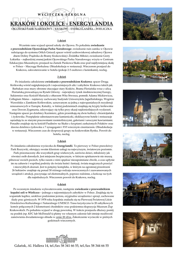 WYCIECZKA SZKOLNA KRAKÓW I OKOLICE - ENERGYLANDIA OJCOWSKI PARK NARODOWY – KRAKÓW – ENERGYLANDIA – WIELICZKA 1 dzień Wcześnie rano wyjazd sprzed szkoły do Ojcowa. Po południu zwiedzanie z przewodnikiem Ojcowskiego Parku Narodowego: zwiedzanie ruin zamku w Ojcowie należącego do systemu Orlich Gniazd; spacer wśród uzdrowiskowej zabudowy Ojcowa dnem Doliny Prądnika do Bramy Krakowskiej i Źródełka Miłości; zwiedzanie Groty Łokietka – najbardziej znanej jaskini Ojcowskiego Parku Narodowego; wizyta w Centrum Edukacyjno-Muzealnym; przejazd na Zamek Pieskowa Skała oraz pod najsłynniejszą skałę w Polsce – Maczugę Herkulesa. Obiadokolacja w restauracji. Wieczorem przejazd do Krakowa, zakwaterowanie w hotelu (pokoje 2-5 osobowe z łazienkami), nocleg. 2 dzień Po śniadaniu całodzienne zwiedzanie z przewodnikiem Krakowa: spacer Drogą Królewską wśród najpiękniejszych i najważniejszych ulic i zabytków Krakowa takich jak: Barbakan oraz mury obronne otaczające stary Kraków, Brama Floriańska wraz z ulicą Floriańską prowadzącą na Rynek Główny - największy rynek średniowiecznej Europy, Sukiennice oraz Kościół Mariacki z ołtarzem Wita Stwosza, pomnik Adama Mickiewicza, Collegium Maius – najstarszy zachowany budynek Uniwersytetu Jagiellońskiego, Wzgórze Wawelskie z Zamkiem Królewskim, uznawanym za jedną z najwspanialszych rezydencji renesansowych w Europie, Katedry, w której podziemiach znajdują się krypty królewskie oraz Dzwon Zygmunta, odzywający się tylko przy okazji najdonioślejszych wydarzeń. Następnie spacer po dzielnicy Kazimierz, gdzie przenikają się dwie kultury: chrześcijańska i żydowska. Przepięknie odrestaurowane kamieniczki, ekskluzywne hotele i restauracje sąsiadują tu ze starymi pracowniami rzemieślniczymi, galeriami i uroczymi kawiarniami. Ponadto znajduje się tu kościół Paulinów na Skałce z kryptami zasłużonych Polaków oraz dawna dzielnica żydowska z 7 synagogami i XVI wiecznym cmentarzem. Obiadokolacja w restauracji. Wieczorem czas do dyspozycji grupy na krakowskim Rynku. Powrót do hotelu, nocleg. 3 dzień Po śniadaniu całodzienna wycieczka do Energylandii. To pierwszy w Polsce prawdziwy Park Rozrywki, oferujący swoim klientom usługi na najwyższym, światowym poziomie. Park przeznaczony dla wszystkich grup wiekowych, zarówno dzieci, młodzieży jak również osób dorosłych. Jest miejscem bezpiecznym, w którym opiekunowie nie muszą pilnować swoich pociech, tylko razem z nimi spędzać niezapomniane chwile, a czas upłynie im na zabawie i wspólnej podróży do świata baśni i fantazji, świata magicznych przeżyć i niezwykłych doznań. Jest to potężny kompleks, w którym na ogromnej przestrzeni 26 hektarów znajduje się ponad 30 różnego rodzaju nowoczesnych i zaawansowanych urządzeń i atrakcji, poczynając od ekstremalnych, poprzez rodzinne, a kończąc na tych dla najmłodszych. Wieczorem powrót do Krakowa, nocleg. 4 dzień Po wczesnym śniadaniu wykwaterowanie, następnie zwiedzanie z przewodnikiem kopalni soli w Wieliczce – jednego z najcenniejszych zabytków w Polsce. Znajdują się tu wspaniałe kaplice, urokliwe podziemne jeziora, oryginalne urządzenia i sprzęt, zachowane ślady prac górniczych. W 1978 roku kopalnia znalazła się na Pierwszej Światowej Liście Dziedzictwa Kulturalnego i Naturalnego UNESCO. Trasa turystyczna to 20 zabytkowych komór połączonych 2 kilometrami chodników oraz podziemna ekspozycja Muzeum Żup Krakowskich. Po południu wyjazd w drogę powrotną. W trakcie przejazdu dłuższy postój na posiłek (np. KFC lub McDonald’s) płatny we własnym zakresie lub istnieje możliwość zamówienia dwudaniowego obiadu w cenie 20 zł/os. Zakończenie wycieczki w późnych godzinach wieczornych. Gdańsk, Al. Hallera 14, tel./fax 58 341 66 55, tel./fax 58 344 66 55 Cena obejmuje: przejazd wygodnym autokarem, opłaty drogowe (autostrady) i parkingi, opiekę pilota wycieczki na całej trasie, usługi licencjonowanych przewodników, 3 noclegi, 3 śniadania, 3 obiadokolacje. DZIECI pow. 40 36 – 40 31 – 35 CENA 545,590,645,- Bilety wstępu do zwiedzanych obiektów płatne dodatkowo – ok. 120 zł/os. Sugerowane bilety wstępów: Ojcowski Park Narodowy – Jaskinia Łokietka ……………………..................................……. cena: ok. 6 zł/os. Ojcowski Park Narodowy – Muzeum (wstęp + film 3d) .………………………………..…… cena: ok. 8 zł/os. Kraków – Kościół Mariacki …………………………………...………………………….…...…. cena: ok. 5 zł/os. Kraków – Katedra na Wawelu ……………………………………………………….…………. cena: ok. 6 zł/os. Kraków – synagoga Remuh + cmentarz żydowski ………………………...……………..…... cena: ok. 5 zł/os. Kraków – Kościół na Skałce ………………………………………………………...………….... cena: ok. 2 zł/os. Energylandia ………………………...………………………..….... cena: ok. 49 zł/os. (szk. podst.) lub ok. 59 zł (gimnazjum) Wieliczka – Kopalnia Soli ………………………………..…………………………………....….cena: ok. 26 zł/os. Zamiennie lub dodatkowo proponujemy: Ojcowski Park Narodowy – Ruiny Zamku w Ojcowie …….…………………………...……. cena: ok. 2 zł/os. Zamek Pieskowa Skała – wnętrza (wystawy i galerie) …...…………………………………... cena: ok. 11 zł/os. Kraków – Reprezentacyjne Komnaty Królewskie ………………………………….….……… cena: ok. 11 zł/os. Kraków – Prywatne Apartamenty Królewskie ………………………………………..…….… cena: ok. 19 zł/os. Kraków – Podziemia Rynku……………………………………………………………...…….... cena: ok. 10 zł/os. Kraków – Collegium Maius – muzeum ……