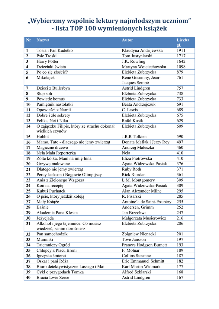 „Wybierzmy wspólnie lektury najmłodszym uczniom” - lista TOP 100 wymienionych książek Nr Nazwa Autor 1 2 3 4 5 6 Tosia i Pan Kudełko Psie Troski Harry Potter Dzieciaki świata Po co się złościć? Mikołajek 7 8 9 10 11 12 13 14 Dzieci z Bullerbyn Słup soli Powiedz komuś Pamiętnik nastolatki Opowieści z Narnii Dobre i złe sekrety Feliks, Net i Nika O zajączku Filipie, który ze strachu dokonał wielkich czynów Hobbit Mamo, Tato - dlaczego nie jemy zwierząt Magiczne drzewo Nela Mała Reporterka Żółte kółka. Mam na imię Inna Grzywą malowane Dlatego nie jemy zwierząt Percy Jackson i Bogowie Olimpijscy Ania z Zielonego Wzgórza Koń na receptę Kubuś Puchatek O psie, który jeździł koleją Mały Książę Baśnie Akademia Pana Kleska Jeżycjada Alkohol i jego tajemnice. Co musisz wiedzieć, zanim dorośniesz Pan samochodzik Muminki Tajemniczy Ogród Chłopcy z Placu Broni Igrzyska śmierci Oskar i pani Róża Biuro detektywistyczne Lassego i Mai Cykl o przygodach Tomka Bracia Lwie Serce Klaudyna Andrijewska Tom Justyniarski J.K. Rowling Martyna Wojciechowska Elżbieta Zubrzycka René Goscinny, JeanJacques Sempé Astrid Lindgren Elżbieta Zubrzycka Elżbieta Zubrzycka Beata Andrzejczuk C. Lewis Elżbieta Zubrzycka Rafał Kosik Elżbieta Zubrzycka 15 16 17 18 19 20 21 22 23 24 25 26 27 28 29 30 31 32 33 34 35 36 37 38 39 40 Liczba gł. 1911 1717 1642 1098 879 761 757 738 733 691 689 675 629 609 J.R.R Tolkien Donata Mafiak i Jerzy Rey Andrzej Maleszka Nela Eliza Piotrowska Agata Widzowska Pasiak Ruby Roth Rick Riordan L.M. Montgomery Agata Widzowska-Pasiak Alan Alexander Milne R. Pisarski Antoine’a de Saint-Exupéry Andersen, Grimm Jan Brzechwa Małgorzata Musierowicz Elżbieta Zubrzycka 590 497 460 410 410 376 371 361 309 309 295 285 255 252 247 216 206 Zbigniew Nienacki Tove Jansson Frances Hodgson Burnett F. Molnar Collins Suzanne Eric Emmanuel Schmitt Karl Martin Widmark Alfred Szklarski Astrid Lindgren 201 197 193 189 187 182 177 168 167 41 42 43 44 45 46 47 48 49 50 51 52 53 54 55 56 57 58 59 60 61 62 63 64 65 66 67 68 69 70 71 72 73 74 75 76 77 78 79 80 81 82 83 84 85 86 87 88 89 90 Karolcia Detektyw Pozytywka Baśniobór Saga Wiedźmin W pustyni i w puszczy Seria Zwiadowcy Piaskowy wilk Ten obcy Przygody Pippi Mała Księżniczka Szatan z siódmej klasy Władca Pierścieni Matylda Alicja w krainie czarów Przygody Tomka Sawyera Koszmarny Karolek Cykl Świat Dysku Charlie i fabryka czekolady Paskudki słowiańskie Pan Kuleczka Dynastia Miziołków Cykl Dziedzictwo Kroniki Saltamontes Afryka Kazika Seria Niefortunnych Zdarzeń Dziennik cwaniaczka Złodziejka książek Kroniki Archeo Pinokio Robinson Crusoe Gwiazd naszych wina MOMO Miś Paddington Ronja, córka zbójnika Lassie, wróć! Zezia , Giler i Oczak Doktor Dolittle Atramentowe Serce Moje szczęśliwe życie Wiersze Koziołek Matołek Seria Elmer Gra Endera Koralina Babcia na jabłoni Most do Terabithii Martynka Patka i Pepe Skrzynia władcy piorunów Dziadek i niedźwiadek. Historia prawdziwa Maria Kruger Grzegorz Kasdepke Brandon Mull Andrzej Sapkowski Henryk Sienkiewicz John Flanagan Asa Lind Irena Jurgielewicz Astrid Lindgren Frances Hodgson Burnett Kornel Makuszyński J. R. R Tolkien R. Dahl Lewis Caroll Mark Twain Francesca Simon Terry Pratchett Roald Dahl Magdalena Mrozińska Wojciech Widłak Joanna Olech Christopher Paolini Monika Marin Łukasz Wierzbicki Lemony Snicket Jeff Kinney Markus Zusak Agnieszka Stelmaszyk C.Collodi Daniel Defoe John Green Michele Endego Michael Bond Astrid Lindgren Eric Knight Agnieszka Chylińska Hugh Lofting Cornelia Funke Rose Lagercrantz Małgorzata Strzałkowska Kornel Makuszyński David McKee Orson Scott Card Neil Gaiman Mira Lobe Katherine Peterson Gilbert Delahaye Agnieszka Szczepańska Kozioł Marcin Łukasz Wierzbicki 154 144 144 141 140 134 129 128 118 117 114 112 111 110 110 106 106 104 103 100 99 96 88 85 84 82 80 78 77 77 72 70 68 67 65 64 63 63 61 58 56 56 55 55 54 54 53 53 53 49 91 92 93 94 95 96 97 98 99 100 Seria Pompon Niekończąca się historia Brzechwa dzieciom Opowieści wigilijne Asiunia Kamienie na szaniec Pollyanna Zosia z ulicy Kociej Kłamczucha Wakacje z duchami Joanna Olech Michael Ende Jan Brzechwa Charles Dickens Joanna Papuzińska Aleksander Kamiński Eleanor Hodgeman Porter Agnieszka Tyszka M. Musierowicz Adam Bahdaj 49 48 48 47 47 45 45 45 44 44
