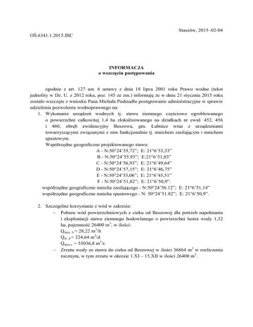 Staszów, 2015–02-04 OŚ.6341.1.2015.IIIC INFORMACJA o wszczęciu postępowania zgodnie z art. 127 ust. 6 ustawy z dnia 18 lipca 2001 roku Prawo wodne (tekst jednolity w Dz. U. z 2012 roku, poz. 145 ze zm.) informuję że w dniu 21 stycznia 2015 roku zostało wszczęte z wniosku Pana Michała Podsiadło postępowanie administracyjne w sprawie udzielenia pozwolenia wodnoprawnego na: 1. Wykonanie urządzeń wodnych tj. stawu ziemnego częściowo ogroblowanego o powierzchni całkowitej 1,4 ha zlokalizowanego na działkach nr ewid. 452, 456 i 460, obręb ewidencyjny Beszowa, gm. Łubnice wraz z urządzeniami towarzyszącymi związanymi z nim funkcjonalnie tj. mnichem zasilającym i mnichem spustowym. Współrzędne geograficzne projektowanego stawu: A - N:50°24’55,72”; E: 21°6’53,33” B - N:50°24’55.93”; E:21°6’51,03” C - N:50°24’56,93”; E: 21°6’49,64” D - N:50°24’57,15”; E: 21°6’46,75” E - N:50°24’55,06”; E: 21°6’45,51” F - N:50°24’51,82”; E: 21°6’50,9”. współrzędne geograficzne mnicha zasilającego - N:50°24’56.12”; E: 21°6’51,14” współrzędne geograficzne mnicha spustowego - N: 50°24’51.82”; E: 21°6’50,9”. 2. Szczególne korzystanie z wód w zakresie: − Poboru wód powierzchniowych z cieku od Beszowej dla potrzeb napełniania i eksploatacji stawu ziemnego hodowlanego o powierzchni lustra wody 1,32 ha, pojemność 26400 m3, w ilości: Qmax. h = 28,22 m3/h Qśr. d = 224,64 m3/d Qmax.r. = 55036,8 m3/r. − Zrzutu wody ze stawu do cieku od Beszowej w ilości 36864 m3 w rozliczeniu rocznym, w tym zrzutu w okresie 1.XI – 15.XII w ilości 26400 m3.