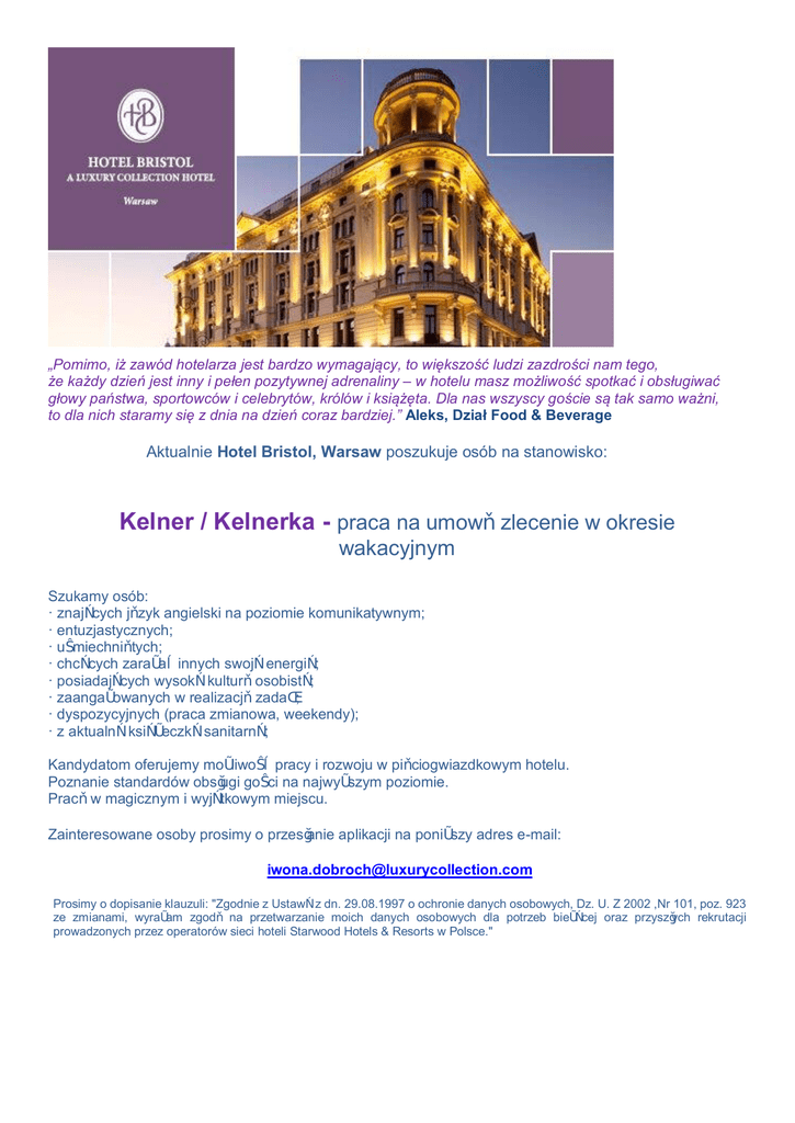 „Pomimo, iż zawód hotelarza jest bardzo wymagający, to większość ludzi zazdrości nam tego, że każdy dzień jest inny i pełen pozytywnej adrenaliny – w hotelu masz możliwość spotkać i obsługiwać głowy państwa, sportowców i celebrytów, królów i książęta. Dla nas wszyscy goście są tak samo ważni, to dla nich staramy się z dnia na dzień coraz bardziej.” Aleks, Dział Food & Beverage Aktualnie Hotel Bristol, Warsaw poszukuje osób na stanowisko: Kelner / Kelnerka - praca na umowę zlecenie w okresie wakacyjnym Szukamy osób: · znających język angielski na poziomie komunikatywnym; · entuzjastycznych; · uśmiechniętych; · chcących zarażać innych swoją energią; · posiadających wysoką kulturę osobistą; · zaangażowanych w realizację zadań; · dyspozycyjnych (praca zmianowa, weekendy); · z aktualną książeczką sanitarną; Kandydatom oferujemy możliwość pracy i rozwoju w pięciogwiazdkowym hotelu. Poznanie standardów obsługi gości na najwyższym poziomie. Pracę w magicznym i wyjątkowym miejscu. Zainteresowane osoby prosimy o przesłanie aplikacji na poniższy adres e-mail: [email protected] Prosimy o dopisanie klauzuli: "Zgodnie z Ustawą z dn. 29.08.1997 o ochronie danych osobowych, Dz. U. Z 2002 ,Nr 101, poz. 923 ze zmianami, wyrażam zgodę na przetwarzanie moich danych osobowych dla potrzeb bieżącej oraz przyszłych rekrutacji prowadzonych przez operatorów sieci hoteli Starwood Hotels & Resorts w Polsce."