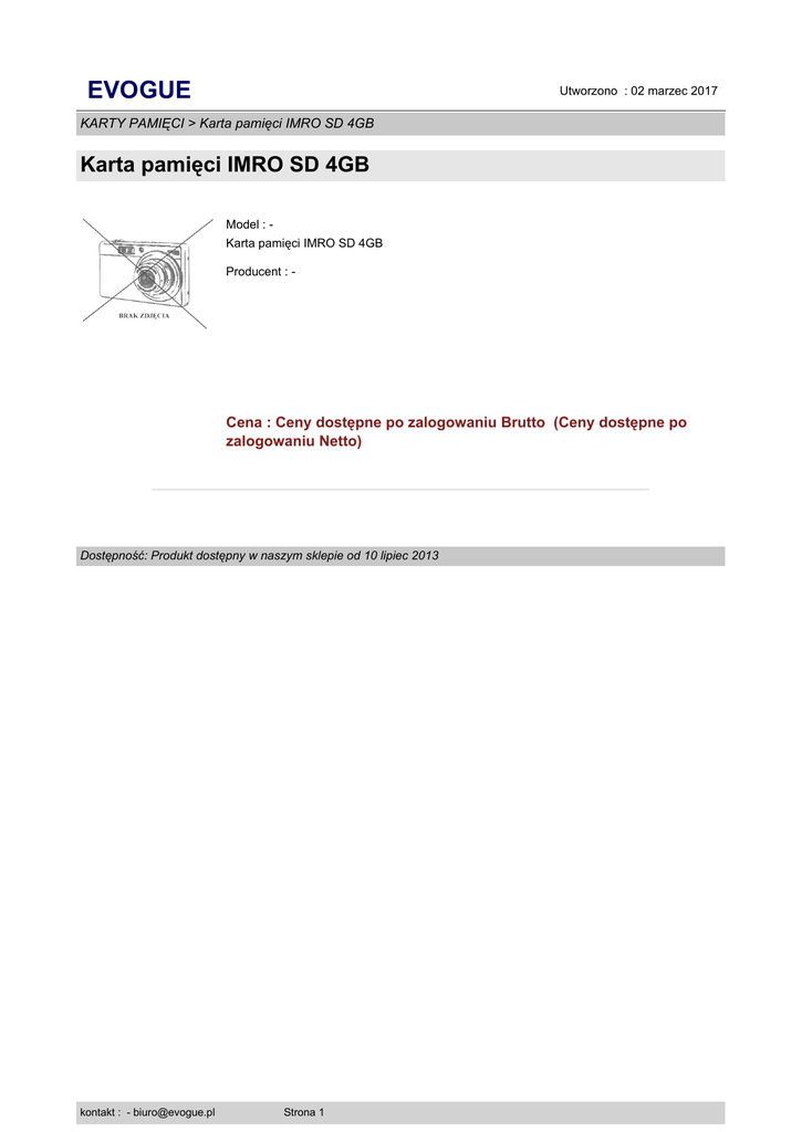 EVOGUE Utworzono : 02 marzec 2017 KARTY PAMIĘCI > Karta pamięci IMRO SD 4GB Karta pamięci IMRO SD 4GB Model : Karta pamięci IMRO SD 4GB Producent : - Cena : Ceny dostępne po zalogowaniu Brutto (Ceny dostępne po zalogowaniu Netto) Dostępność: Produkt dostępny w naszym sklepie od 10 lipiec 2013 kontakt : - [email protected] Strona 1