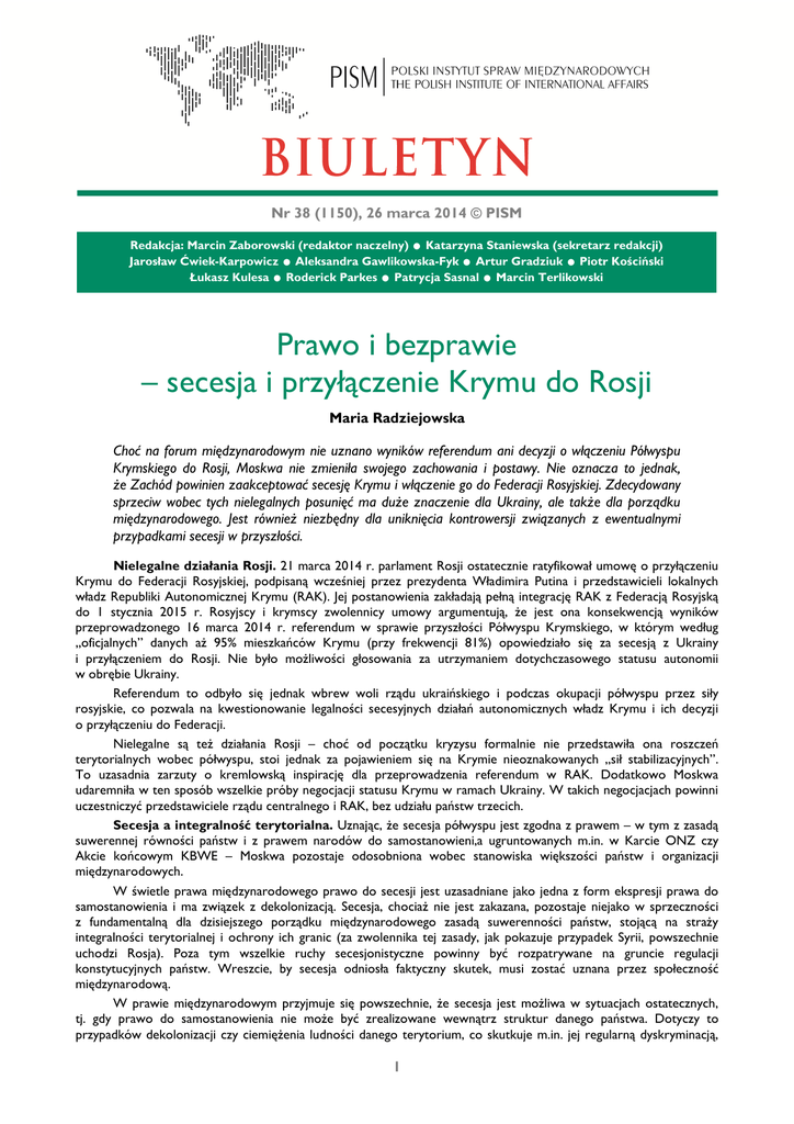 Nr 38 (1150), 26 marca 2014 © PISM .. . .. . Redakcja: Marcin Zaborowski (redaktor naczelny) Katarzyna Staniewska (sekretarz redakcji) Jarosław Ćwiek-Karpowicz Aleksandra Gawlikowska-Fyk Artur Gradziuk Piotr Kościński Łukasz Kulesa Roderick Parkes Patrycja Sasnal Marcin Terlikowski . Prawo i bezprawie – secesja i przyłączenie Krymu do Rosji Maria Radziejowska Choć na forum międzynarodowym nie uznano wyników referendum ani decyzji o włączeniu Półwyspu Krymskiego do Rosji, Moskwa nie zmieniła swojego zachowania i postawy. Nie oznacza to jednak, Ŝe Zachód powinien zaakceptować secesję Krymu i włączenie go do Federacji Rosyjskiej. Zdecydowany sprzeciw wobec tych nielegalnych posunięć ma duŜe znaczenie dla Ukrainy, ale takŜe dla porządku międzynarodowego. Jest równieŜ niezbędny dla uniknięcia kontrowersji związanych z ewentualnymi przypadkami secesji w przyszłości. Nielegalne działania Rosji. 21 marca 2014 r. parlament Rosji ostatecznie ratyfikował umowę o przyłączeniu Krymu do Federacji Rosyjskiej, podpisaną wcześniej przez prezydenta Władimira Putina i przedstawicieli lokalnych władz Republiki Autonomicznej Krymu (RAK). Jej postanowienia zakładają pełną integrację RAK z Federacją Rosyjską do 1 stycznia 2015 r. Rosyjscy i krymscy zwolennicy umowy argumentują, Ŝe jest ona konsekwencją wyników przeprowadzonego 16 marca 2014 r. referendum w sprawie przyszłości Półwyspu Krymskiego, w którym według „oficjalnych” danych aŜ 95% mieszkańców Krymu (przy frekwencji 81%) opowiedziało się za secesją z Ukrainy i przyłączeniem do Rosji. Nie było moŜliwości głosowania za utrzymaniem dotychczasowego statusu autonomii w obrębie Ukrainy. Referendum to odbyło się jednak wbrew woli rządu ukraińskiego i podczas okupacji półwyspu przez siły rosyjskie, co pozwala na kwestionowanie legalności secesyjnych działań autonomicznych władz Krymu i ich decyzji o przyłączeniu do Federacji. Nielegalne są teŜ działania Rosji – choć od początku kryzysu formalnie nie przedstawiła ona roszczeń terytorialnych wobec półwyspu, stoi jednak za pojawieniem się na Krymie nieoznakowanych „sił stabilizacyjnych”. To uzasadnia zarzuty o kremlowską inspirację dla przeprowadzenia referendum w RAK. Dodatkowo Moskwa udaremniła w ten sposób wszelkie próby negocjacji statusu Krymu w ramach Ukrainy. W takich negocjacjach powinni uczestniczyć przedstawiciele rządu centralnego i RAK, bez udziału państw trzecich. Secesja a integralność terytorialna. Uznając, Ŝe secesja półwyspu jest zgodna z prawem – w tym z zasadą suwerennej równości państw i z prawem narodów do samostanowieni,a ugruntowanych m.in. w Karcie ONZ czy Akcie końcowym KBWE – Moskwa pozostaje odosobniona wobec stanowiska większości państw i organizacji międzynarodowych. W świetle prawa międzynarodowego prawo do secesji jest uzasadniane jako jedna z form ekspresji prawa do samostanowienia i ma związek z dekolonizacją. Secesja, chociaŜ nie jest zakazana, pozostaje niejako w sprzeczności z fundamentalną dla dzisiejszego porządku międzynarodowego zasadą suwerenności państw, stojącą na straŜy integralności terytorialnej i ochrony ich granic (za zwolennika tej zasady, jak pokazuje przypadek Syrii, powszechnie uchodzi Rosja). Poza tym wszelkie ruchy secesjonistyczne powinny być rozpatrywane na gruncie regulacji konstytucyjnych państw. Wreszcie, by secesja odniosła faktyczny skutek, musi zostać uznana przez społeczność międzynarodową. W prawie międzynarodowym przyjmuje się powszechnie, Ŝe secesja jest moŜliwa w sytuacjach ostatecznych, tj. gdy prawo do samostanowienia nie moŜe być zrealizowane wewnątrz struktur danego państwa. Dotyczy to przypadków dekolonizacji czy ciemięŜenia ludności danego terytorium, co skutkuje m.in. jej regularną dyskryminacją, 1 łamaniem praw człowieka lub uniemoŜliwieniem jej udziału w rządzeniu państwem czy zamieszkiwanym przez nią regionem. W tej sprawie wypowiedział się m.in. w 1998 r. Sąd NajwyŜszy Kanady w opinii na temat ewentualnego odłączenia się Quebecu, odrzucając separatystyczne aspiracje prowincji. Natomiast w 2010 r. Międzynarodowy Trybunał Sprawiedliwości (MTS) w opinii na temat deklaracji niepodległości kosowskich Albańczyków poprzestał na analizie jej zgodności z prawem międzynarodowym, powstrzymując się od rozwaŜenia kwestii prawa do jednostronnej secesji. Stanowisko rosyjskie a łamanie prawa międzynarodowego. Wbrew argumentacji Moskwy w przypadku secesji Krymu nie moŜe być mowy o realizacji prawa jego mieszkańców do samostanowienia, zarówno na podstawie prawa międzynarodowego, jak i wewnętrznego prawa Ukrainy. Po pierwsze, Rosja, usprawiedliwiając secesję Krymu, odwołuje się do precedensu Kosowa, chociaŜ do tej pory nie uznała jego niepodległości. W przypadku Kosowa Moskwa argumentowała swoje antysecesyjne stanowisko tym, Ŝe prawo do samostanowienia w drodze secesji moŜe być realizowane jedynie wyjątkowo, tzn. w przypadku przemocy wobec danej grupy, i jako środek ostateczny – po wyczerpaniu innych środków rozstrzygnięcia zaistniałego konfliktu. W ten sposób nie moŜna jednak interpretować postępowania Rosji wobec RAK, bo rzekomy wzrost nastrojów nacjonalistycznych i antyrosyjskich na Ukrainie stanowi tylko hipotetyczne zagroŜenie. Pomimo zmiany władzy i ogólnej destabilizacji instytucjonalnej, polityka Kijowa wobec rosyjskiej ludności Krymu nie moŜe być uznana za kolonizatorską, charakteryzującą się prześladowaniami lub dyskryminacją. Do tej pory najpowaŜniejszym przypadkiem działań mogących uchodzić za dyskryminowanie mniejszości przez nowe władze Ukrainy była – zawetowana przez pełniącego funkcję prezydenta Ołeksandra Turczynowa – próba odwołania ustawy z 2012 r., uznającej oficjalny status języków mniejszości narodowych na Ukrainie, w tym rosyjskiego. Niewyjaśniona jest takŜe kwe