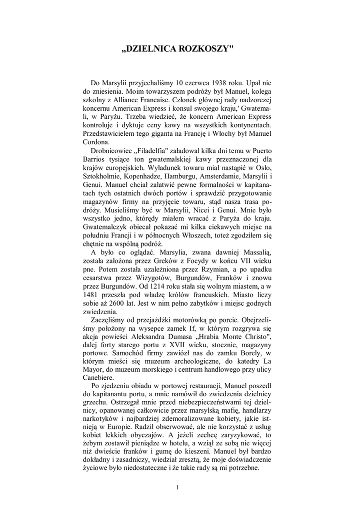 „DZIELNICA ROZKOSZY" Do Marsylii przyjechaliśmy 10 czerwca 1938 roku. Upał nie do zniesienia. Moim towarzyszem podróży był Manuel, kolega szkolny z Alliance Francaise. Członek głównej rady nadzorczej koncernu American Express i konsul swojego kraju,' Gwatemali, w Paryżu. Trzeba wiedzieć, że koncern American Express kontroluje i dyktuje ceny kawy na wszystkich kontynentach. Przedstawicielem tego giganta na Francję i Włochy był Manuel Cordona. Drobnicowiec „Filadelfia" załadował kilka dni temu w Puerto Barrios tysiące ton gwatemalskiej kawy przeznaczonej dla krajów europejskich. Wyładunek towaru miał nastąpić w Oslo, Sztokholmie, Kopenhadze, Hamburgu, Amsterdamie, Marsylii i Genui. Manuel chciał załatwić pewne formalności w kapitanatach tych ostatnich dwóch portów i sprawdzić przygotowanie magazynów firmy na przyjęcie towaru, stąd nasza trasa podróży. Musieliśmy być w Marsylii, Nicei i Genui. Mnie było wszystko jedno, którędy miałem wracać z Paryża do kraju. Gwatemalczyk obiecał pokazać mi kilka ciekawych miejsc na południu Francji i w północnych Włoszech, toteż zgodziłem się chętnie na wspólną podróż. A było co oglądać. Marsylia, zwana dawniej Massalią, została założona przez Greków z Focydy w końcu VII wieku pne. Potem została uzależniona przez Rzymian, a po upadku cesarstwa przez Wizygotów, Burgundów, Franków i znowu przez Burgundów. Od 1214 roku stała się wolnym miastem, a w 1481 przeszła pod władzę królów francuskich. Miasto liczy sobie aż 2600 lat. Jest w nim pełno zabytków i miejsc godnych zwiedzenia. Zaczęliśmy od przejażdżki motorówką po porcie. Obejrzeliśmy położony na wysepce zamek If, w którym rozgrywa się akcja powieści Aleksandra Dumasa „Hrabia Monte Christo", dalej forty starego portu z XVII wieku, stocznie, magazyny portowe. Samochód firmy zawiózł nas do zamku Borely, w którym mieści się muzeum archeologiczne, do katedry La Mayor, do muzeum morskiego i centrum handlowego przy ulicy Canebiere. Po zjedzeniu obiadu w portowej restauracji, Manuel poszedł do kapitanantu portu, a mnie namówił do zwiedzenia dzielnicy grzechu. Ostrzegał mnie przed niebezpieczeństwami tej dzielnicy, opanowanej całkowicie przez marsylską mafię, handlarzy narkotyków i najbardziej zdemoralizowane kobiety, jakie istnieją w Europie. Radził obserwować, ale nie korzystać z usług kobiet lekkich obyczajów. A jeżeli zechcę zaryzykować, to żebym zostawił pieniądze w hotelu, a wziął ze sobą nie więcej niż dwieście franków i gumę do kieszeni. Manuel był bardzo dokładny i zasadniczy, wiedział zresztą, że moje doświadczenie życiowe było niedostateczne i że takie rady są mi potrzebne. 1 Targowisko rozkoszy mieściło się w ciasnych uliczkach o zabudowie pięciopiętrowej. Znalazłem się w tłumie żołnierzy Legii Cudzoziemskiej, cudzoziemskich robotników, marynarzy okrętów wojennych i statków handlowych. Wybrałem ulicę najbardziej uczęszczaną; zabrukowana kocimi łbami, zbyt ciasna dla pojazdów kołowych, domy stare, obdarte z tynków. Ulica stawała się coraz bardziej stromą i wąską, emanowała podejrzane, nieprzyjemne zapachy. Takich miejsc nie powinno się odwiedzać samemu - pomyślałem. Pijani marynarze zataczali się od ściany do ściany, rycząc pikantne piosenki. We wszystkich oknach, od parteru do piątego piętra, siedziały malowane lale. Tego upalnego dnia lale ubrane były tylko w majteczki. Wychylały się z otwartych okien i psykały na przechodzących mężczyzn. Niektóre brały do rąk swoje bujne piersi, jak gdyby zapewniając przechodnia, że nie będzie żałował odwiedzin. Białe i czarne, Mulatki, Arabki, Berberyjki, tłuste i szczupłe, ciche i natarczywe. Nie było takiej rzeczy, której by nie zrobiły, żeby zadowolić klienta. Zajrzałem do jednego z licznych lokali rozrywkowych. Cały personel żeński był jednolicie ubrany w czarne pończochy i czarne paski do ich podtrzymywania. Kelnerki nosiły także maleńkie białe fartuszki przykrywające brzuszki. Nie nosiły staników ani majtek. Marynarze i żołnierze porozwalani na sofach obłapywali dziewczyny, popijając napoje roznoszone przez kelnerki. Ci, którzy ustalili już cenę za usługi, szli do pokoi na pierwszym piętrze. Powietrze było gęste od dymu z papierosów i od oparów alkoholu. Wycofałem się dyskretnie z lokalu i wróciłem do hotelu. Byłem blady i przerażony, jakbym zobaczył jakieś upiory. Manuel trzymał w ręku dzisiejszą gazetę. Pokazał mi artykuł relacjonujący odkrycie w jednej z piwnic tej dzielnicy dwudziestu ośmiu szkieletów zakopanych w ziemi. Prowadzono śledztwo w tej sprawie. Domyślano się, że ofiarami mordów byli klienci tamtejszych prostytutek. Widocznie zauważyły u nich zbyt dużo pieniędzy w portfelach i to ich zgubiło. Dzisiaj dzielnica ta już nie istnieje. Została całkowicie zburzona. Była siedliskiem handlu narkotykami. Można tam było nabyć dowolną ilość heroiny, morfiny, opium, marihuany, kokainy. Deprawowały się tam młode dziewczyny i wdrażały do wszystkich możliwych zboczeń seksualnych: zoofilii, sadyzmu, masochizmu, fetyszyzmu itp. Prostytutka z Marsylii znaczyło prostytutka, która zna wszystkie tajniki Kamasutry i jeszcze znacznie więcej. Marsylia nie stała się z roku na rok miastem zamieszkałym jedynie przez świętoszków, ale obecnie jest podobna do wszystkich innych portów świata, a rozrywki marynarzy nie przybierają aż tak odrażających form jak przed ostatnią wojną. 2