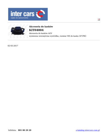 Akcesoria do kasków KIT04004 Akcesoria do kasków AGV wymienna wewnętrzna wyśćiółka, rozmiar MS do kasku GP-PRO 02-03-2017 Infolinia: 801 80 20 20 e-katalog.intercars.com.pl