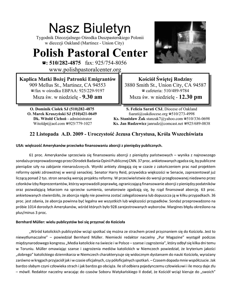 Nasz Biuletyn Tygodnik Diecezjalnego Ośrodka Duszpasterskiego Polonii w diecezji Oakland (Martinez - Union City) Polish Pastoral Center ?: 510/282-4875 fax: 925/754-8056 www.polishpastoralcenter.org Kaplica Matki Bożej Patronki Emigrantów 909 Mellus St., Martinez, CA 94553 Kościół Świętej Rodziny 3880 Smith St., Union City, CA 94587 ?/fax w ośrodku EBPAA: 925/229-9197 ? cafeteria: 510/489-9784 Msza św. w niedzielę - 9.30 am Msza św. w niedzielę - 12.30 pm O. Dominik Ciołek SJ (510)282-4875 O. Marek Kruszyński SJ (510)421-0649 Dk. Witold Cichoń - administrator [email protected] ?925/779-1027 S. Felicia Sarati CSJ, Diocese of Oakland [email protected] ?510/273-4998 Ks. Stanisław Żak [email protected] ?510/336-0698 Ks. Jan Rudzewicz [email protected] ?925/689-0838 22 Listopada A.D. 2009 - Uroczystość Jezusa Chrystusa, Króla Wszechświata USA: większość Amerykanów przeciwko finansowaniu aborcji z pieniędzy publicznych. 61 proc. Amerykanów sprzeciwia się finansowaniu aborcji z pieniędzy państwowych – wynika z najnowszego sondażu przeprowadzonego przez Ośrodek Badania Opinii Publicznej CNN. 37 proc. ankietowanych zgadza się, by publiczne pieniądze szły na zabijanie nienarodzonych. Wyniki ankiety zbiegają się w czasie z zakończeniem prac nad projektem reformy opieki zdrowotnej w wersji senackiej. Senator Harry Reid, przywódca większości w Senacie, zaprezentował już liczącą ponad 2 tys. stron senacką wersję projektu reformy. W przeciwieństwie do wersji przegłosowanej niedawno przez członków Izby Reprezentantów, którzy wprowadzili poprawkę, ograniczającą finansowanie aborcji z pieniędzy podatników oraz pozwalającą lekarzom na sprzeciw sumienia, senatorowie zgadzają się, by rząd finansował aborcję. 63 proc. ankietowanych stwierdziło, że aborcja nigdy nie powinna zostać zalegalizowana lub dopuszcza ją w kilku przypadkach. 36 proc. jest zdania, że aborcja powinna być legalna we wszystkich lub większości przypadków. Sondaż przeprowadzono na próbie 1014 dorosłych Amerykanów, wśród których było 928 zarejestrowanych wyborców. Margines błędu określono na plus/minus 3 proc. Bernhard Müller: wielu publicystów boi się przyznać do Kościoła „Wśród katolickich publicystów wciąż spotkać się można ze strachem przed przyznaniem się do Kościoła. Jest to niewytłumaczalne” – powiedział Bernhard Müller. Niemiecki redaktor naczelny „Pur Magazine” wystąpił podczas międzynarodowego kongresu „Media katolickie na świecie i w Polsce – szanse i zagrożenia”, który odbył się kilka dni temu w Toruniu. Müller omawiając szanse i zagrożenia mediów katolickich w Niemczech powiedział, że kryterium jakości „dobrego” katolickiego dziennikarza w Niemczech charakteryzuje się widocznym dystansem do nauki Kościoła, wyrażany zarówno w kręgach przyjaciół jak i w czasie oficjalnych, czy półoficjalnych spotkań. – Czasem dopada mnie współczucie. Jak bardzo słabym czyni człowieka strach i jak bardzo go obciąża. Ile sił odbiera pojedynczemu człowiekowi i ile mocy daje złu – mówił. Redaktor naczelny wracając do czasów Soboru Watykańskiego II dodał, że Kościół wciąż kieruje do „swoich” dziennikarzy jednoznaczne oczekiwanie – by Chrystus był przykładem, a drogowskazem życia zawodowego i osobistego powinien być katechizm. . Zebrane składki kościelne. Za złożone ofiary składamy serdeczne Bóg zapłać: Martinez 08/09/09 08/16/09 08/23/09 08/30/09 09/06/09 09/13/09 09/20/09 09/27/09 10/04/09 10/11/09 10/18/09 $239 $313 $328 $291 $254 $301 + Katedra $198 $300 $343 $307 $380 Union City $259 $211 $323 + lunch $57 $213 $218 + lunch $31 $238 + Katedra $163 $189 $324 $278 $226 $412 10/25/09 $280 11/1/09 $645 Z Ogłoszenia parafialne Z . Prosimy o składanie kart wypominkowych za dusze zmarłych tych, o których zbawienie parafianie pragną sie modlić. Kartki są dostępne do pobrania przy wejściu do Kościoła pw. św. Rodziny w Union City oraz w Kaplicy w Martinez. . W miesiącu Listopadzie w każdą niedzielę będziemy się modlić modlitwą wypominkową, podczas modlitwy wiernych, wypraszając Pana Boga o Jego nieskończone miłosierdzie i szczęśliwość wieczną dla naszych zmarłych. . Zapraszamy na wieczory wigilijne organizowane przez nasze wpolnoty: Walnut Creek 12 grudnia, 5 pm, bilety u p. Iwony Urbaniak (925)685-6035 i p. Elżbiety Łukaszewicz (925)914-9988. 5-go grudnia o godz.17tej, Polska Parafia i Szkoła Polska w Union City zaprasza na tradycyjne "Jasełka" i kolacje "Wigilia" (dzielenie sie opłatkiem, spotkanie z Mikołajem, tradycyjne potrawy i śpiew kolęd). Bilety: dorosły - $20, dzieci- (od 5 do 18) - $10, do 5-go roku życia – darmo. Bilety można kupić po każdej Mszy św. lub zarezerwować u pp. Grażyna Koralewska 408-866-6864, Elżbieta Pajerska - 650-349-3630, Beata Wrona 510-886-1290. . Sylwester 31-go Grudnia w godzinach od 19-tej do 2-giej rano - Polska Parafia w Union City 3880 Smith St. zaprasza na szaloną noc. Bilety : $30 - od osoby (+ lampka szampana ), $ 25 - bilety wcześniej zamówione. Rezerwacja: pp. Malgorzata Bzowska – 510-881-0499, Beata Wrona 510-886-1290 albo po każdej Mszy św. . Domek do wynajęcia w Oakland na pograniczu San Leandro, spokojna okolica, w przystępnej cenie. 1 bedroom, living room, kitchen i bathroom. Cena $700, deposit $350. Proszę o kontakt z panem Jackiem (408) 761-7507. BIURO PRAWNE FIRMY KEROSKY & ASSOCIATES Specjalizuje się we wszystkich sprawach cywilnych, takich jak: wypadki samochodowe - obrażenia ciała sprawy spadkowe - prawo emigracyjne prawo budowlane oraz nieruchomości - wszystkie sprawy biznesowe. POLISH & EUROPEAN Delikateski "Where sausages are truly Polish" Call toll free 1-800-FRYKASY 1984 Monument Blvd. Concord, CA 94520 785 Market St 15th Floor San Francisco, CA 94103 ? 415/777-4445 http://www.youradwokat.com Mówimy po polsku i rosyjsku. Tłumaczenia i usługi no