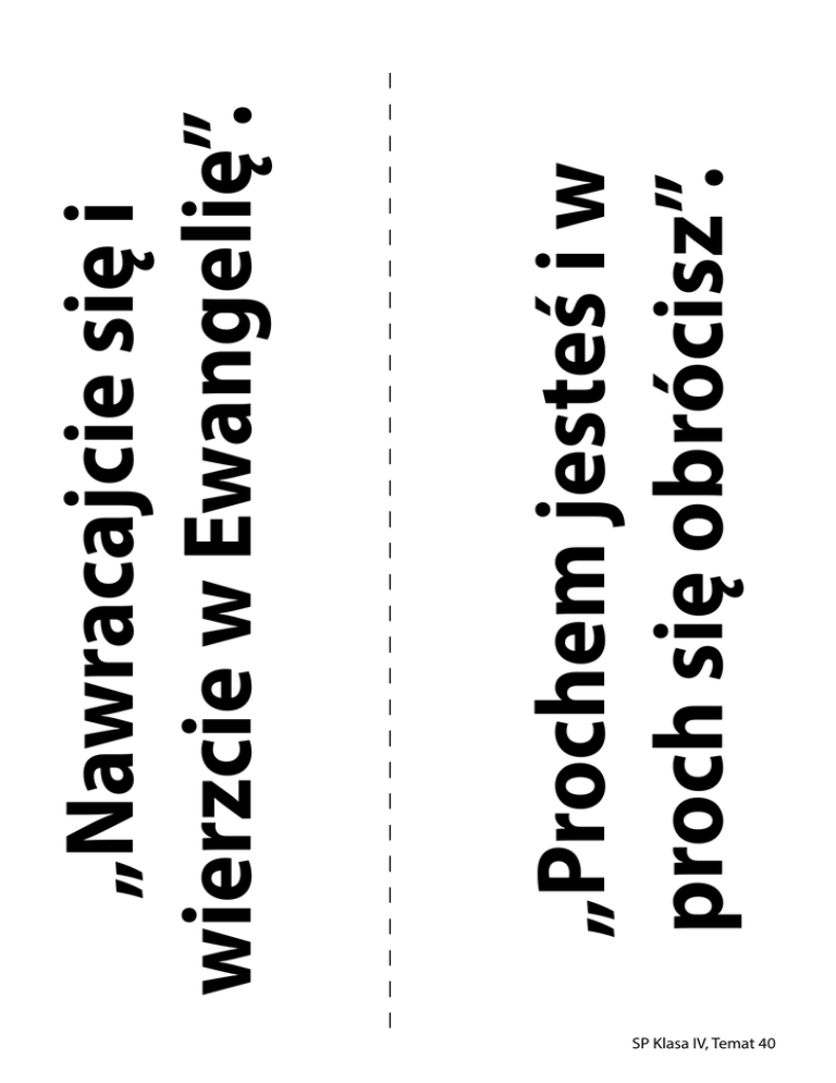 SP Klasa IV, Temat 40 „Prochem jesteś i w proch się obrócisz”. „Nawracajcie się i wierzcie w Ewangelię”. „Popielcowa karta wstępu na Wielki Post” Imię i nazwisko: …………………………… Data urodzenia: …………………………… Miejsce zamieszkania: …………………………… Ubezpieczenie: Anioł Stróż. Cel Wielkiego Postu: nawrócenie. Środki: post i modlitwa. Miejsce docelowe: niebo. „Popielcowa karta wstępu na Wielki Post” Imię i nazwisko: …………………………… Data urodzenia: …………………………… Miejsce zamieszkania: …………………………… Ubezpieczenie: Anioł Stróż. Cel Wielkiego Postu: nawrócenie. Środki: post i modlitwa. Miejsce docelowe: niebo. „Popielcowa karta wstępu na Wielki Post” Imię i nazwisko: …………………………… Data urodzenia: …………………………… Miejsce zamieszkania: …………………………… Ubezpieczenie: Anioł Stróż. Cel Wielkiego Postu: nawrócenie. Środki: post i modlitwa. Miejsce docelowe: niebo. SP Klasa IV, Temat 40 „Popielcowa karta wstępu na Wielki Post” Imię i nazwisko: …………………………… Data urodzenia: …………………………… Miejsce zamieszkania: …………………………… Ubezpieczenie: Anioł Stróż. Cel Wielkiego Postu: nawrócenie. Środki: post i modlitwa. Miejsce docelowe: niebo. zagiąć „Nawróćcie się do Mnie całym swym sercem, przez post i płacz, i lament. Rozdzierajcie jednak serca wasze, a nie szaty! Nawróćcie się do Pana, Boga waszego! On bowiem jest litościwy, miłosierny, nieskory do gniewu i bogaty w łaskę, a lituje się nad niedolą”. (Jl 2,12-13) odciąć i przykleić POPIELEC SP Klasa IV, Temat 40 Hasła: – pomagam bliźniemu, – złoszczę się, – jestem leniwy, – jestem pracowity, – wypełniam swoje obowiązki, – kłamię, – modlę się, – chodzę do kościoła. SP Klasa IV, Temat 40