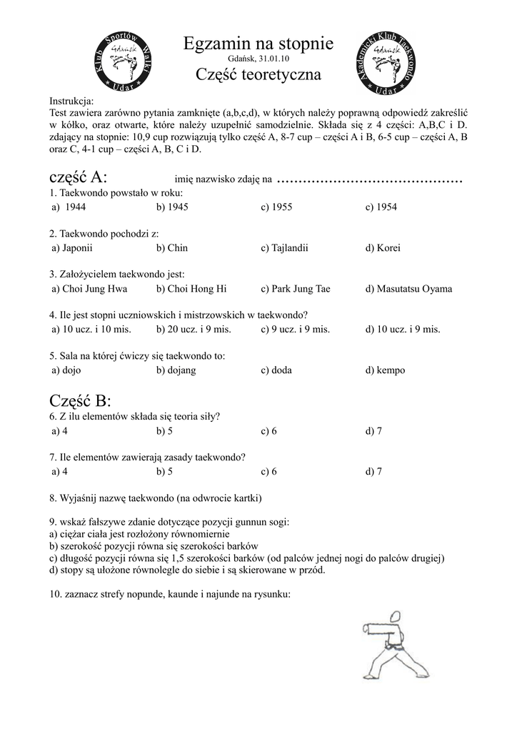 Egzamin na stopnie Gdańsk, 31.01.10 Część teoretyczna Instrukcja: Test zawiera zarówno pytania zamknięte (a,b,c,d), w których należy poprawną odpowiedź zakreślić w kółko, oraz otwarte, które należy uzupełnić samodzielnie. Składa się z 4 części: A,B,C i D. zdający na stopnie: 10,9 cup rozwiązują tylko część A, 8-7 cup – części A i B, 6-5 cup – części A, B oraz C, 4-1 cup – części A, B, C i D. część A: ........................................... imię nazwisko zdaję na 1. Taekwondo powstało w roku: a) 1944 b) 1945 c) 1955 c) 1954 2. Taekwondo pochodzi z: a) Japonii b) Chin c) Tajlandii d) Korei 3. Założycielem taekwondo jest: a) Choi Jung Hwa b) Choi Hong Hi c) Park Jung Tae d) Masutatsu Oyama 4. Ile jest stopni uczniowskich i mistrzowskich w taekwondo? a) 10 ucz. i 10 mis. b) 20 ucz. i 9 mis. c) 9 ucz. i 9 mis. d) 10 ucz. i 9 mis. 5. Sala na której ćwiczy się taekwondo to: a) dojo b) dojang c) doda d) kempo 6. Z ilu elementów składa się teoria siły? a) 4 b) 5 c) 6 d) 7 7. Ile elementów zawierają zasady taekwondo? a) 4 b) 5 c) 6 d) 7 Część B: 8. Wyjaśnij nazwę taekwondo (na odwrocie kartki) 9. wskaż fałszywe zdanie dotyczące pozycji gunnun sogi: a) ciężar ciała jest rozłożony równomiernie b) szerokość pozycji równa się szerokości barków c) długość pozycji równa się 1,5 szerokości barków (od palców jednej nogi do palców drugiej) d) stopy są ułożone równolegle do siebie i są skierowane w przód. 10. zaznacz strefy nopunde, kaunde i najunde na rysunku: Część C: 11. elementem teorii siły jest: a) równowaga b) koncentracja c) szybkość d) kontrola oddechu 12. Podaj pełną nazwę (pozycja, powierzchnia uderzeniowa, strefa uderzeniowa, technika) drugiej techniki atakującej w układzie WON-HYO. ….…....................................................................................................................................... 13. Techniką atakującą jest: a) makgi b) jirugi c) tulgi d) taerigi 14. Przyporządkuj nazwy elementów doboku do ich polskich odpowiedników: sang-i spodnie ha-i bluza ti pas 15. opisz na odwrocie kartki co symbolizują wszystkie kolory pasów oraz układy wymagane na stopień KTÓRY POSIADASZ. Część D: 16. Napisz pełną komendę jaką osoba z najwyższym stopniem musi wypowiedzieć przed treningiem z Mistrzem Jamesem Limem. …................................................................................................................................................... 17. Po ilu egzaminach można możliwie najszybciej zdobyć stopień I dan? …................... 18. Napisz nazwy przynajmniej 3 sztuk/sportów walki pochodzących z Korei. …......................................... , …................................................... , ….............................................. 18. Na odwrocie kartki wypisz (lub narysuj) po 3 miejsca witalne człowieka z każdej strefy. 19. Napisz „taekwondo” w notacji koreańskiej. 20. (podchwytliwe) ile zostało wymyślonych układów taekwondo ITF ? …................................