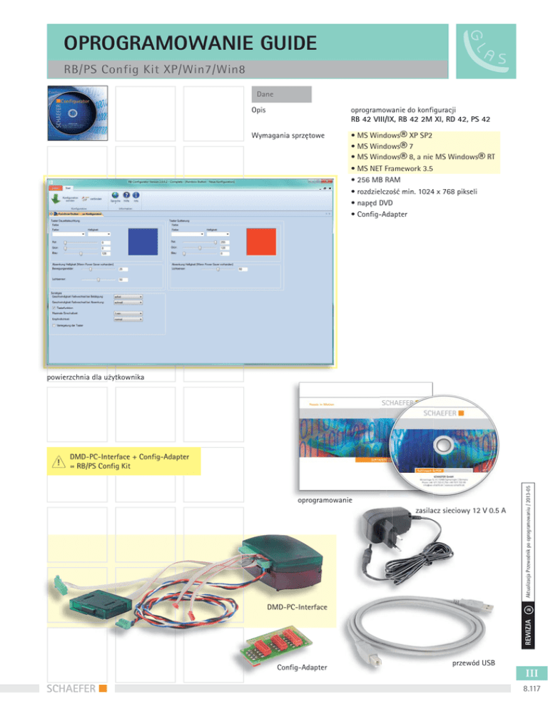 OPROGRAMOWANIE GUIDE RB/PS Config Kit XP/Win7/Win8 Dane Opis oprogramowanie do konfiguracji RB 42 VIII/IX, RB 42 2M XI, RD 42, PS 42 Wymagania sprzętowe • MS Windows • MS Windows • MS Windows ® XP SP2 ®7 ® 8, a nie MS Windows® RT • MS NET Framework 3.5 • 256 MB RAM • rozdzielczość min. 1024 x 768 pikseli • napęd DVD • Config-Adapter powierzchnia dla użytkownika oprogramowanie zasilacz sieciowy 12 V 0.5 A a DMD-PC-Interface Aktualizacja Przewodnik po oprogramowaniu / 2013-05 DMD-PC-Interface + Config-Adapter = RB/PS Config Kit REWIZJA ! Config-Adapter przewód USB III 8.117 OSZCZĘDNOŚĆ ENERGII Power Saver 42 Przykład Budynek biznesowy z dziesięcioma piętrami, w tym dwa piętra z miejscami parkingowymi; panel w kabinie składa się z: 11 x RB 42 1 x RB 42 2M XI 1 x DVM 70 (urządzenie do zapowiedzi głosowych) 1 x TFT 800 (wyświetlacz) oświetlenie kabiny 100 W Rozwiązanie 2 x PS 42 EMC LS na piętrach do parkowania 1 x PS 42 EMC LS w panelu kabiny 1 x przekaźnik na dachu kabiny Funkcja Panel kabiny i oświetlenie kabiny włączają się, gdy na piętrach do parkowania osoba zbliża się do windy. Włączają się także, gdy drzwi kabiny otwierają się lub zamykają. ENERGY SAVING Po upływie ustawionego czasu te dwa elementy ponownie wyłączają się. Oszczędność energii 890 kWh/a with PS 42 without PS 42 Czas amortyzacji < 2 lat LOW ENERGY +24 V GND PS 42 EMC LS 9. OG PS 42 EMC LS 9. piętro pozycja parkowania PS 42 EMC LS parter pozycja parkowania pozycja parkowania 3. OG 2. OG PS 42 EMC LS 1. OG PS 42 EMC LS PS 42 EMC LS kabina EG pozycja parkowania RB 42 +24 V 230 V oświetlenie kabiny 24 V „drzwi otw.“ z napędu drzwi + 24 V podłączone DVM np. przekaźnik ER62-8 ... 230 V AC/DC GND III 8.118 na dachu kabiny DMD inne panel kabiny w panelu kabiny w panelu awaryjnym lub w panelu wskaźników