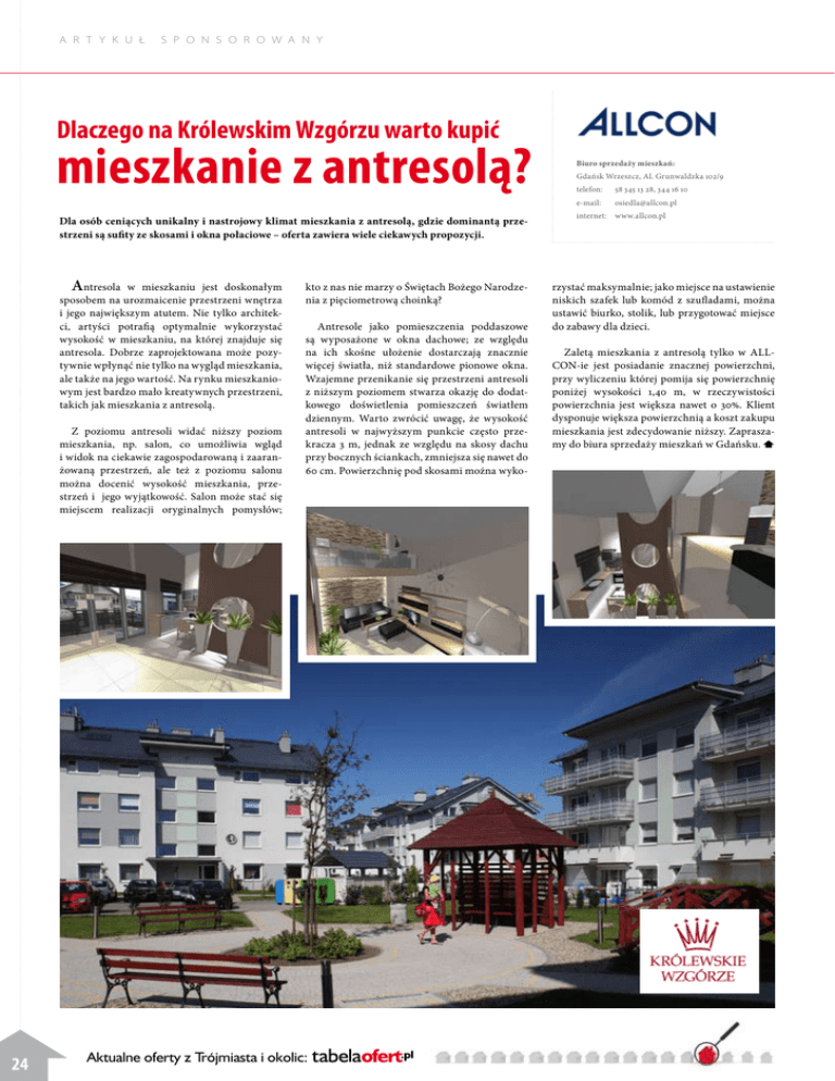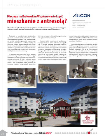 A R T Y K U Ł S P O N S O R O W A N Y Dlaczego na Królewskim Wzgórzu warto kupić mieszkanie z antresolą? Dla osób ceniących unikalny i nastrojowy klimat mieszkania z antresolą, gdzie dominantą przestrzeni są sufity ze skosami i okna połaciowe – oferta zawiera wiele ciekawych propozycji. Antresola w mieszkaniu jest doskonałym sposobem na urozmaicenie przestrzeni wnętrza i jego największym atutem. Nie tylko architekci, artyści potrafią optymalnie wykorzystać wysokość w mieszkaniu, na której znajduje się antresola. Dobrze zaprojektowana może pozytywnie wpłynąć nie tylko na wygląd mieszkania, ale także na jego wartość. Na rynku mieszkaniowym jest bardzo mało kreatywnych przestrzeni, takich jak mieszkania z antresolą. Z poziomu antresoli widać niższy poziom mieszkania, np. salon, co umożliwia wgląd i widok na ciekawie zagospodarowaną i zaaranżowaną przestrzeń, ale też z poziomu salonu można docenić wysokość mieszkania, przestrzeń i jego wyjątkowość. Salon może stać się miejscem realizacji oryginalnych pomysłów; 24 kto z nas nie marzy o Świętach Bożego Narodzenia z pięciometrową choinką? Antresole jako pomieszczenia poddaszowe są wyposażone w okna dachowe; ze względu na ich skośne ułożenie dostarczają znacznie więcej światła, niż standardowe pionowe okna. Wzajemne przenikanie się przestrzeni antresoli z niższym poziomem stwarza okazję do dodatkowego doświetlenia pomieszczeń światłem dziennym. Warto zwrócić uwagę, że wysokość antresoli w najwyższym punkcie często przekracza 3 m, jednak ze względu na skosy dachu przy bocznych ściankach, zmniejsza się nawet do 60 cm. Powierzchnię pod skosami można wyko- Aktualne oferty z Trójmiasta i okolic: Biuro sprzedaży mieszkań: Gdańsk Wrzeszcz, Al. Grunwaldzka 102/9 telefon: 58 345 13 28, 344 16 10 e-mail: [email protected] internet: www.allcon.pl rzystać maksymalnie; jako miejsce na ustawienie niskich szafek lub komód z szufladami, można ustawić biurko, stolik, lub przygotować miejsce do zabawy dla dzieci. Zaletą mieszkania z antresolą tylko w ALLCON-ie jest posiadanie znacznej powierzchni, przy wyliczeniu której pomija się powierzchnię poniżej wysokości 1,40 m, w rzeczywistości powierzchnia jest większa nawet o 30%. Klient dysponuje większa powierzchnią a koszt zakupu mieszkania jest zdecydowanie niższy. Zapraszamy do biura sprzedaży mieszkań w Gdańsku.