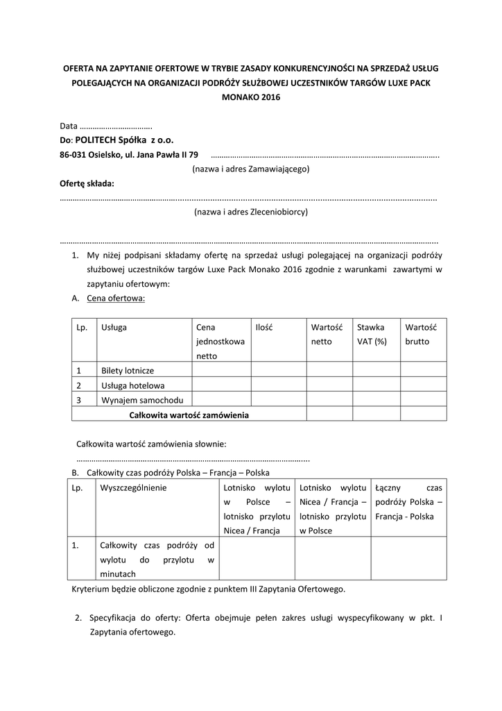 OFERTA NA ZAPYTANIE OFERTOWE W TRYBIE ZASADY KONKURENCYJNOŚCI NA SPRZEDAŻ USŁUG POLEGAJĄCYCH NA ORGANIZACJI PODRÓŻY SŁUŻBOWEJ UCZESTNIKÓW TARGÓW LUXE PACK MONAKO 2016 Data ……………………………. Do: POLITECH Spółka z o.o. 86-031 Osielsko, ul. Jana Pawła II 79 …………………………………………………………………………………………….. (nazwa i adres Zamawiającego) Ofertę składa: ………………………………………………................................................................................................................ (nazwa i adres Zleceniobiorcy) …………………………………………………………………………………………………………………………………………………………... 1. My niżej podpisani składamy ofertę na sprzedaż usługi polegającej na organizacji podróży służbowej uczestników targów Luxe Pack Monako 2016 zgodnie z warunkami zawartymi w zapytaniu ofertowym: A. Cena ofertowa: Lp. Usługa Cena Ilość jednostkowa Wartość Stawka Wartość netto VAT (%) brutto netto 1 Bilety lotnicze 2 Usługa hotelowa 3 Wynajem samochodu Całkowita wartość zamówienia Całkowita wartość zamówienia słownie: …………………………………………………………………………………………….... B. Całkowity czas podróży Polska – Francja – Polska Lp. Wyszczególnienie Lotnisko wylotu Lotnisko wylotu Łączny w Polsce czas – Nicea / Francja – podróży Polska – lotnisko przylotu lotnisko przylotu Francja - Polska Nicea / Francja 1. w Polsce Całkowity czas podróży od wylotu do przylotu w minutach Kryterium będzie obliczone zgodnie z punktem III Zapytania Ofertowego. 2. Specyfikacja do oferty: Oferta obejmuje pełen zakres usługi wyspecyfikowany w pkt. I Zapytania ofertowego. 3. Warunki i termin płatności za usługę: Zgodne z pkt. VII.4. Zapytania ofertowego 4. Warunki dostawy: bilety oraz rezerwacje zostaną przesłane w formie elektronicznej bezpośrednio z systemów rezerwacyjnych na adres: [email protected] lub w formie drukowanej na adres siedziby Zamawiającego. Termin przesłania dokumentów 19.08.2016. 5. Termin związania ofertą wynosi 3 dni robocze od daty wyznaczonej jako termin składania oferty. 6. Potwierdzamy, iż nie uczestniczymy w jakiejkolwiek innej ofercie dotyczącej tego samego postępowania. 7. Oświadczamy, że spełniamy warunki udziału w postępowaniu określone w pkt. II Zapytania ofertowego. 8. Oświadczamy, że nie jesteśmy powiązani z Zamawiającym osobowo lub kapitałowo. Przez powiązania kapitałowe lub osobowe rozumie się wzajemne powiązania między Zamawiającym lub osobami upoważnionymi do zaciągania zobowiązań w imieniu Zamawiającego lub osobami wykonującymi w imieniu Zamawiającego czynności związane z przygotowaniem i przeprowadzeniem procedury wyboru wykonawcy a wykonawcą, polegające w szczególności na: a) uczestniczeniu w spółce jako wspólnik spółki cywilnej lub spółki osobowej, b) posiadaniu co najmniej 10% udziałów lub akcji, c) pełnieniu funkcji członka organu nadzorczego lub zarządzającego, prokurenta, pełnomocnika, d) pozostawaniu w związku małżeńskim w stosunku pokrewieństwa lub powinowactwa w linii prostej, pokrewieństwa drugiego stopnia lub powinowactwa drugiego stopnia w linii bocznej lub w stosunku przysposobienia, opieki lub kurateli. Miejscowość i data: ……………………………………… Podpis osoby upoważnionej do reprezentowania Zleceniobiorcy……………………….. (pieczęć Zleceniobiorcy) Do niniejszej oferty załączono: 1. Odpis z Krajowego Rejestru Sądowego lub wpisu do Ewidencji Działalności Gospodarczej. 2. Dokument poświadczający należyte wykonanie min. jednej usługi określonej w punkcie IIa. Zapytania ofertowego (np. referencje, print screen ze strony internetowej). 2