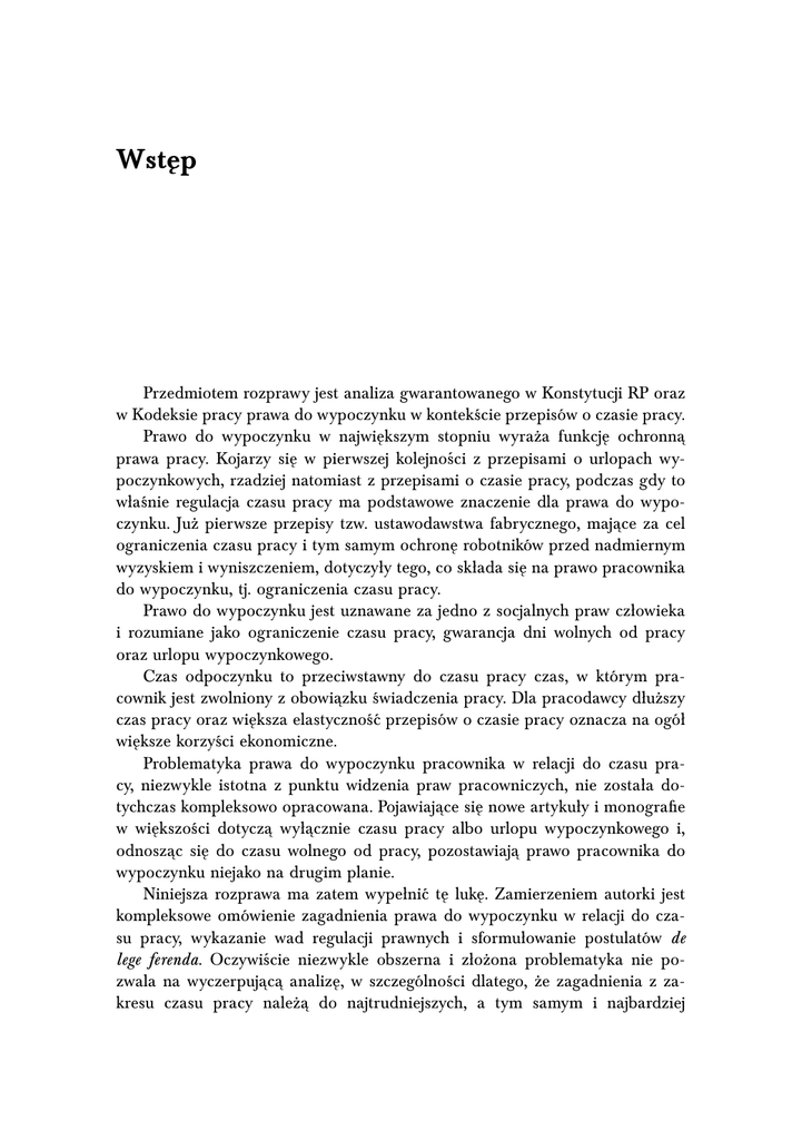 Wstep ˛ Przedmiotem rozprawy jest analiza gwarantowanego w Konstytucji RP oraz w Kodeksie pracy prawa do wypoczynku w kontekście przepisów o czasie pracy. Prawo do wypoczynku w najwiekszym ˛ stopniu wyraża funkcje˛ ochronna˛ prawa pracy. Kojarzy sie˛ w pierwszej kolejności z przepisami o urlopach wypoczynkowych, rzadziej natomiast z przepisami o czasie pracy, podczas gdy to właśnie regulacja czasu pracy ma podstawowe znaczenie dla prawa do wypoczynku. Już pierwsze przepisy tzw. ustawodawstwa fabrycznego, majace ˛ za cel ograniczenia czasu pracy i tym samym ochrone˛ robotników przed nadmiernym wyzyskiem i wyniszczeniem, dotyczyły tego, co składa sie˛ na prawo pracownika do wypoczynku, tj. ograniczenia czasu pracy. Prawo do wypoczynku jest uznawane za jedno z socjalnych praw człowieka i rozumiane jako ograniczenie czasu pracy, gwarancja dni wolnych od pracy oraz urlopu wypoczynkowego. Czas odpoczynku to przeciwstawny do czasu pracy czas, w którym pracownik jest zwolniony z obowiazku ˛ świadczenia pracy. Dla pracodawcy dłuższy czas pracy oraz wieksza ˛ elastyczność przepisów o czasie pracy oznacza na ogół wi˛eksze korzyści ekonomiczne. Problematyka prawa do wypoczynku pracownika w relacji do czasu pracy, niezwykle istotna z punktu widzenia praw pracowniczych, nie została dotychczas kompleksowo opracowana. Pojawiajace ˛ sie˛ nowe artykuły i monografie w wi˛ekszości dotycza˛ wyłacznie ˛ czasu pracy albo urlopu wypoczynkowego i, odnoszac ˛ si˛e do czasu wolnego od pracy, pozostawiaja˛ prawo pracownika do wypoczynku niejako na drugim planie. Niniejsza rozprawa ma zatem wypełnić t˛e luk˛e. Zamierzeniem autorki jest kompleksowe omówienie zagadnienia prawa do wypoczynku w relacji do czasu pracy, wykazanie wad regulacji prawnych i sformułowanie postulatów de lege ferenda. Oczywiście niezwykle obszerna i złożona problematyka nie pozwala na wyczerpujac ˛ a˛ analize, ˛ w szczególności dlatego, że zagadnienia z zakresu czasu pracy należa˛ do najtrudniejszych, a tym samym i najbardziej Wst˛ep 11 kontrowersyjnych, wywołujac ˛ liczne komentarze w środowiskach naukowych i w praktyce. Autorka koncentruje sie˛ na zagadnieniach ściśle zwiazanych ˛ z elementami prawa do wypoczynku w kontekście regulacji prawnej czasu pracy, odnoszac ˛ si˛e do poszczególnych instytucji czasu pracy w aspekcie ich wpływu na prawo do wypoczynku. W szczególności w rozdziale III, poświeconym ˛ relacji czasu pracy do czasu wolnego od pracy, znalazło sie˛ omówienie podstawowych pojeć ˛ zwiazanych ˛ z czasem pracy (normy i wymiar czasu pracy, rozkłady czasu pracy, systemy czasu pracy) w zakresie niezbednym ˛ do przeprowadzenia tej analizy. Nie poświ˛econo szczegółowych rozważań sposobom rekompensaty za prace˛ wykonywana˛ ponad normy czasu pracy oraz przepisom pragmatyk pracowniczych. Tylko marginalnie nawiazano ˛ w rozprawie do regulacji pozakodeksowych, m.in. do ustawy z 16 kwietnia 2004 r. o czasie pracy kierowców1 i ustawy z 27 sierpnia 1997 r. o rehabilitacji zawodowej i społecznej oraz zatrudnianiu osób niepełnosprawnych2 . Jedynie w niezbednym ˛ zakresie odwołano sie˛ także do pozakodeksowej regulacji dyżuru medycznego przy okazji omawiania dyżuru zakładowego w VII rozdziale ksia˛żki. Prawo do wypoczynku w kontekście regulacji czasu pracy zostało omówione zarówno na tle miedzynarodowego ˛ prawa pracy, jak i ustawodawstwa unijnego. Poza analiza˛ obowiazuj ˛ acych ˛ przepisów prawnych wykorzystano także niektóre nieobowiazuj ˛ ace ˛ już akty prawne. Rozprawa opiera sie˛ głównie na regulacjach i literaturze z zakresu prawa pracy, aczkolwiek uzupełniajaco ˛ pojawia sie˛ w niej dorobek innych dyscyplin naukowych, głownie z zakresu ekonomii, zarzadzania, ˛ socjologii i medycyny. W szczególności dla potrzeb przedstawienia negatywnych skutków braku odpoczynku dla zdrowia pracownika posłużono sie˛ stosownymi wynikami badań naukowo-medycznych. Struktura wewnetrzna ˛ ksia˛żki obejmuje osiem rozdziałów, w których zagadnienia sa˛ usystematyzowane tytułami i podtytułami. W rozdziale I przedstawiono prawo pracownika do wypoczynku w aktach prawa mi˛edzynarodowego i w prawie Unii Europejskiej. Poszczególne akty prawne zostały omówione wedle porzadku ˛ chronologicznego. W rozdziale II przedstawiono prawo pracownika do wypoczynku w polskim prawie pracy. W pierwszej cześci ˛ tego rozdziału zawarto rys historyczny, którego celem jest zaprezentowanie dorobku legislacyjnego, stanowisk doktryny oraz orzecznictwa w Polsce w okresie miedzywojennym ˛ i powojennym do 1974 r. Nast˛epnie omówiono prawo do wypoczynku według obowiazuj ˛ acej ˛ Konstytucji RP i Kodeksu pracy oraz znaczenie przepisów prawnych o czasie pracy dla prawa do wypoczynku. 1 2 Dz.U. z 2012 r., poz. 1155, ze zm. Dz.U. z 2011 r., nr 127, poz. 721, ze zm. 12 Wst˛ep Przedmiotem analizy w rozdziale III jest relacja czasu pracy i czasu wolnego od pracy. Pierwsza cześć ˛ rozdziału jest poświecona ˛ omówieniu pojecia ˛ czasu pracy na gruncie Kodeksu pracy. Poszczególne cześci ˛ składowe tego pojecia ˛ zostały poddane szczegółowej analizie; autorka wyartykułowała kwestie sporne, nierozstrzygniete ˛ w doktrynie i w orzecznictwie, podejmujac ˛ próbe˛ ich wyjaśnienia. Autorka zwraca szczególna˛ uwag˛e na istniejace ˛ w polskim prawie „pośrednie kategorie czasu pracownika”, które nie sa˛ traktowane jako czas pracy, a jednocześnie niewatpliwie ˛ nie stanowia˛ czasu wolnego (czasu odpoczynku); sa˛ czymś pośrednim miedzy ˛ tymi kategoriami. W polskim ustawodawstwie można zaliczyć do nich: podróż służbowa,˛ dyżur zakładowy i szkolenia pracownicze. Nast˛epnie omówiono normy i wymiar czasu pracy oraz systemy czasu pracy w odniesieniu do prawa pracownika do wypoczynku. W kolejnym podrozdziale zdefiniowano czas wolny od pracy jako warunek realizacji prawa do wypoczynku. Rozdział ten zamykaja˛ r