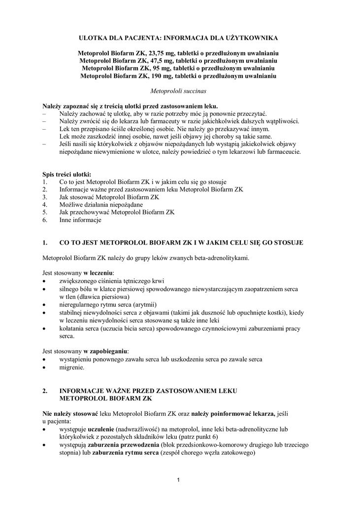 ULOTKA DLA PACJENTA: INFORMACJA DLA UŻYTKOWNIKA Metoprolol Biofarm ZK, 23,75 mg, tabletki o przedłużonym uwalnianiu Metoprolol Biofarm ZK, 47,5 mg, tabletki o przedłużonym uwalnianiu Metoprolol Biofarm ZK, 95 mg, tabletki o przedłużonym uwalnianiu Metoprolol Biofarm ZK, 190 mg, tabletki o przedłużonym uwalnianiu Metoprololi succinas Należy zapoznać się z treścią ulotki przed zastosowaniem leku. – Należy zachować tę ulotkę, aby w razie potrzeby móc ją ponownie przeczytać. – Należy zwrócić się do lekarza lub farmaceuty w razie jakichkolwiek dalszych wątpliwości. – Lek ten przepisano ściśle określonej osobie. Nie należy go przekazywać innym. Lek może zaszkodzić innej osobie, nawet jeśli objawy jej choroby są takie same. – Jeśli nasili się którykolwiek z objawów niepożądanych lub wystąpią jakiekolwiek objawy niepożądane niewymienione w ulotce, należy powiedzieć o tym lekarzowi lub farmaceucie. Spis treści ulotki: 1. Co to jest Metoprolol Biofarm ZK i w jakim celu się go stosuje 2. Informacje ważne przed zastosowaniem leku Metoprolol Biofarm ZK 3. Jak stosować Metoprolol Biofarm ZK 4. Możliwe działania niepożądane 5. Jak przechowywać Metoprolol Biofarm ZK 6. Inne informacje 1. CO TO JEST METOPROLOL BIOFARM ZK I W JAKIM CELU SIĘ GO STOSUJE Metoprolol Biofarm ZK należy do grupy leków zwanych beta-adrenolitykami. Jest stosowany w leczeniu: zwiększonego ciśnienia tętniczego krwi silnego bólu w klatce piersiowej spowodowanego niewystarczającym zaopatrzeniem serca w tlen (dławica piersiowa) nieregularnego rytmu serca (arytmii) stabilnej niewydolności serca z objawami (takimi jak duszność lub opuchnięte kostki), kiedy w leczeniu niewydolności serca stosowane są także inne leki kołatania serca (uczucia bicia serca) spowodowanego czynnościowymi zaburzeniami pracy serca. Jest stosowany w zapobieganiu: wystąpieniu ponownego zawału serca lub uszkodzeniu serca po zawale serca migrenie. 2. INFORMACJE WAŻNE PRZED ZASTOSOWANIEM LEKU METOPROLOL BIOFARM ZK Nie należy stosować leku Metoprolol Biofarm ZK oraz należy poinformować lekarza, jeśli u pacjenta: występuje uczulenie (nadwrażliwość) na metoprolol, inne leki beta-adrenolityczne lub którykolwiek z pozostałych składników leku (patrz punkt 6) występują zaburzenia przewodzenia (blok przedsionkowo-komorowy drugiego lub trzeciego stopnia) lub zaburzenia rytmu serca (zespół chorego węzła zatokowego) 1 występuje nieleczona niewydolność serca, pacjent otrzymuje leczenie zwiększające kurczliwość serca lub u pacjenta występuje wstrząs w wyniku zaburzeń serca występują ciężkie zaburzenia krążenia (ciężkie zaburzenia obwodowego krążenia krwi) występuje wolne bicie serca (poniżej 50 uderzeń na minutę) występuje niskie ciśnienie krwi występuje zwiększona kwasowość krwi (kwasica metaboliczna) występuje ciężka astma lub POChP (przewlekła obturacyjna choroba płuc) występuje nieleczony guz chromochłonny nadnerczy (rzadko występujący guz w jednym z gruczołów nadnerczy powodujący wysokie ciśnienie krwi) występuje niewydolność serca i skurczowe ciśnienie krwi poniżej 100 mm Hg. Są stosowane następujące leki (patrz także „Stosowanie innych leków”): inhibitory monoaminooksydazy (IMAO) (stosowane w leczeniu depresji) werapamil i diltiazem (stosowane w celu zmniejszenia ciśnienia krwi) leki przeciwarytmiczne jak dyzopiramid. Należy zachować szczególną ostrożność stosując Metoprolol Biofarm ZK oraz poinformować lekarza, jeśli u pacjenta: występuje astma występuje dławica piersiowa Prinzmetala (silny ból w klatce piersiowej pojawiający się zwykle w nocy) występuje cukrzyca (lek może maskować niskie stężenie cukru we krwi) występuje guz chromochłonny nadnerczy (rzadko występujący guz w jednym z gruczołów nadnerczy powodujący wysokie ciśnienie krwi) pacjent jest leczony w celu zmniejszenia reakcji alergicznej. Metoprolol Biofarm ZK może zwiększać nadwrażliwość na substancje, które wywołują u pacjenta alergię lub nasilać ciężkość reakcji alergicznej. występuje nadczynność tarczycy (lek może maskować objawy takie jak przyspieszona czynność serca, zwiększone pocenie, drżenie, niepokój, zwiększony apetyt lub zmniejszenie masy ciała) występuje lub występowała łuszczyca (ciężka wysypka skórna) występują zaburzenia krążenia krwi, które mogą powodować mrowienie, blednięcie lub sinienie palców rąk i stóp występują zaburzenia przewodzenia w sercu (blok serca) występuje niewydolność serca i jedno z następujących: niestabilna niewydolność serca (klasa IV według NYHA) zawał serca lub napad dławicy piersiowej w ciągu ostatnich 28 dni zaburzona czynność nerek lub wątroby wiek poniżej 40 lat lub powyżej 80 lat choroba zastawek serca powiększenie mięśnia sercowego operacja serca w ciągu ostatnich 4 miesięcy. Jeśli u pacjenta planowana jest operacja lub zabieg w znieczuleniu należy poinformować lekarza lub stomatologa o stosowaniu tabletek z metoprololem. Stosowanie innych leków Nie należy przyjmować leku Metoprolol Biofarm ZK w przypadku jednoczesnego stosowania: inhibitorów monoaminooksydazy (IMAO) stosowanych w leczeniu depresji (może nasilić się działanie obniżające ciśnienie krwi) innych leków obniżających ciśnienie krwi takich jak werapamil i diltiazem (może wystąpić zwolnienie akcji serca i nadmierne zmniejszenie ciśnienia krwi) leków przeciwarytmicznych takich jak dyzopiramid (może zwiększyć się ryzyko nieregularnego lub wolnego bicia serca i zmniejszenia wydolności serca). 2 Przed przyjęciem leku Metoprolol Biofarm ZK, należy powiedzieć lekarzowi o przyjmowanych aktualnie lub ostatnio następujących lekach, również tych, które wydawane są bez recepty: Następujące leki mogą nasilać działanie zmniejszające ciśnienie krwi: cymetydyna (stosowana w chorobie wrzodowej) hydralazyna lub klonidyna (leki z