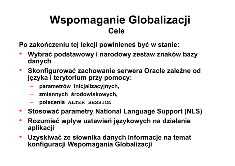 Wspomaganie Globalizacji Cele Po zakończeniu tej lekcji powinieneś być w stanie: • Wybrać podstawowy i narodowy zestaw znaków bazy danych y • Skonfigurować zachowanie serwera Oracle zależne od języka i terytorium przy pomocy: – – – • • • parametrów inicjalizacyjnych, zmiennych środowiskowych, polecenia ALTER SESSION Stosować parametry National Language Support (NLS) Rozumieć wpływ ustawień językowych na działanie aplikacji Uzyskiwać ze słownika danych informacje na temat konfiguracji Wspomagania Globalizacji Własności Wspomagania Globalizacji • • • • • • • • Wspomaganie języków narodowych Wspomaganie p g terytoriów y Wspomaganie wielu zestawów znaków Sortowania lingwistyczne g y Wyświetlanie komunikatów Oracle w różnych językach Różne formaty daty i czasu Formaty liczb Symbole walut Database Różne typy schematów kodowania znaków Oracle Database zapewnia wmożliwość wykozystania różnych kategorii schematów kodowania znaków: • Jednobajtowe zestawy znaków – 7-bitowe – 8-bitowe • Wielobajtowe zestawy znaków zmiennej długości • Wielobajtowe zestawy znaków stałej długości • Unicode (AL32UFT8, AL16UTF16, UTF8) Podstawowy i narodowy zestaw znaków bazy danych Zestaw podstawowy Zestaw narodowy Określany przy tworzeniu b.d. Określany przy tworzeniu b.d. Nie może zostać zmieniony (kilka wyjątków) Nie może zostać zmieniony (kilka wyjątków) Wykorzystywany w typach CHAR, Wykorzystywany w typach VARCHAR2, CLOB, LONG NCHAR, NVARCHAR2, NCLOB Można stosować schematy jednobajtowe i zmiennej długości Można stosować Unicode w schematach h h AL16UTF16 A 16UTF16 i UTF8 Wskazówki do stosowania podstawowego i narodowego zestawu znaków bazy danych Rozważania • Jakie języki powinna wspomagać baza y danych? • Jaki wpływ mogą mieć zasoby systemowe na działanie bazy danych i aplikacji? • Czy są wymagania w stosunku do wydajności? • Jakie ograniczenia mogą wystąpić? Wskazówki do wyboru narodowego zestawu znaków bazy danych • Dwie możliwości – AL16UTF16 – UTF8 • Czy ma znaczenie oszczędność miejsca? • Czy ma znaczenie wydajność ? Zestaw znaków Unicode Kiedy powinno się tworzyć bazę danych z zestawem znaków Unicode? • Łatwa migracja kodu do Javy i Pl/SQL • Łatwa migracja danych z zestawów opartych o kod ASCII • Losowo rozrzucone dane wielojęzyczne • Przeszukiwanie tekstów w kartrydżu InterMedia Zestaw znaków Unicode Kiedy powinno się stosować typy danych Unicode? • Stopniowe dodawane wspomaganie wielojęzyczności • • Aplikacje pakietowe Wydajność Jednobajtowy podstawowy zestaw znaków z zestawem narodowym zmiennej długości • W klientach Windows lepsze jest wspomaganie zestawu UTF-16 Określanie zachowania zależnego od języka Parametr inicjalizacyjny Zmienna środowiskowa Polecenie ALTER SESSION Określenie konfiguracji narodowej dla serwera NLS_LANGUAGE określa: • • • • Język komunikatów Nazwy dni i miesięcy Symbole dla A.D, A D B.C, B C A.M, A M P.M. PM Domyślny porządek sortowania NLS_TERRITORY określa: k śl • • Numerację dni i tygodni Domyślny format daty, separator dziesiętny i grupowy, symbole waluty ISO i lokalny Domyślne wartości parametrów zależnych od języka i terytorium PARAMETR NLS_LANGUAGE Wartość AMERICAN NLS_DATE_LANGUAGE AMERICAN NLS_SORT BINARY NLS_TERRITORY AMERICA NLS_CURRENCY $ NLS_ISO_CURRENCY AMERICA NLS_DATE_FORMAT DD-MON-RR NLS_NUMERIC_CHARACTERS ,. Określanie konfiguracji narodowej dla sesji użytkownika • Zmienna środowiskowa: NLS_LANG=French_France.UTF8 • Dodatkowe zmienne środowiskowe: – NLS_DATE_FORMAT – NLS_DATE_LANGUAGE – NLS_SORT – NLS_NUMERIC_CHARACTERS – NLS_CURRENCY – NLS_ISO_CURRENCY NLS ISO CURRENCY – NLS_CALENDAR Zestawy znaków w architekturze Klient-Serwer NLS_LANG=<language>_<territory>.<charset> NLS_NCHAR=<ncharset> CREATE DATABASE ... CHARACTER SET <charset> NATIONAL CHARACTER SET <ncharset> ... Określanie konfiguracji narodowej dla sesji użytkownika ALTER SESSION SET NLS NLS_DATE_FORMAT=‘DD.MM.YYYY’; DATE FORMAT ‘DD MM YYYY’ DBMS_SESSION.SET_NLS(‘NLS_DATE_FORMAT’, _ _ _ _ ’’’DD.MM.YYYY’’’) ; Sortowanie Lingwistyczne Oracle dostarcza trzech typów sortowania • Sortowanie binarne oparte o binarne wartości znaków • Sortowanie jednojęzyczne – Sortowanie takie jest realizowane w dwóch fazach – Opiera się na wartości głównej i mniej znaczącej przypisanej y j do znaków • Sortowanie wielojęzyczne – Oparte o standard ISO 14651 oraz standard Unicode 3.0 Sortowanie NLS • NLS_SORT określa sposób sortowania danych znakowych – Jest określany przez zmienną środowiskową NLS_LANG – Może zostać zmieniony na poziomie sesji • funkcja j NLSSORT – Określa sposób sortowania danych znakowych – Pozwala na określenie sposobu sortowania na poziomie polecenia SQL Stosowanie parametrów NLS w funkcjach SQL SELECT TO_CHAR(hire_date,’DD.Mon.YYYY’, ‘NLS_DATE_LANGUAGE=FRENCH’) FROM employees; SELECT ename, TO_CHAR(sal,’9G999D99’, ‘NLS_NUMERIC_CHARACTERS=‘‘,.’’’) FROM emp; Wspomaganie indeksów lingwistycznych • Indeksowanie lingwistyczne • Wysoka y wydajność y j sortowania lingwistycznego g y g CREATE INDEX list_word ON list (NLSSORT(word, ‘NLS_SORT = French_M’)); • Przy porównaniach lingwistycznych stosuje się parametr inicjalizacyjny p j yj y NLS_COMP Import i załadunek danych a NLS • Dane podczas importu podlegają konwersji z zestawu znaków pliku eksportu do zestawu znaków kó b bazy danych. d h • LOADER: – Ścieżka Ś i żk k konwencjonalna: j l D Dane są k konwertowane t do zestawu znaków sesji użytkownika określonego parametrem NLS_LANG. – Ścieżka bezpośrednia: Dane są konwertowane bezpośrednio do zestawu znaków bazy danych. Uzyskiwanie informacji o zestawach znaków bazy danych NLS_DATABASE_PARAMETERS: • PARAMETER (NLS_CHARACTERSET, NLS