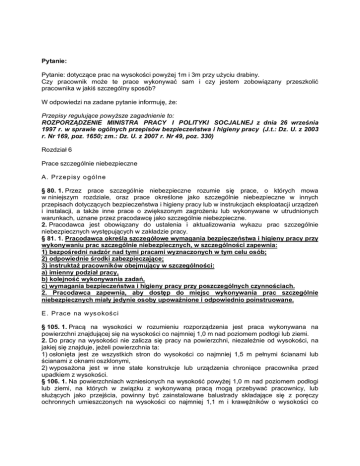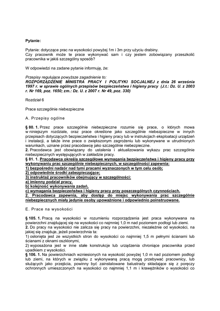 Pytanie: Pytanie: dotycz ce prac na wysoko ci powy ej 1m i 3m przy u yciu drabiny. Czy pracownik mo e te prace wykonywa sam i czy jestem zobowi zany przeszkoli pracownika w jaki szczególny sposób? W odpowiedzi na zadane pytanie informuj , e: Przepisy reguluj ce powy sze zagadnienie to: ROZPORZ DZENIE MINISTRA PRACY I POLITYKI SOCJALNEJ z dnia 26 wrze nia 1997 r. w sprawie ogólnych przepisów bezpiecze stwa i higieny pracy (J.t.: Dz. U. z 2003 r. Nr 169, poz. 1650; zm.: Dz. U. z 2007 r. Nr 49, poz. 330) Rozdzia 6 Prace szczególnie niebezpieczne A. Przep isy o gólne § 80. 1. Przez prace szczególnie niebezpieczne rozumie si prace, o których mowa w niniejszym rozdziale, oraz prace okre lone jako szczególnie niebezpieczne w innych przepisach dotycz cych bezpiecze stwa i higieny pracy lub w instrukcjach eksploatacji urz dze i instalacji, a tak e inne prace o zwi kszonym zagro eniu lub wykonywane w utrudnionych warunkach, uznane przez pracodawc jako szczególnie niebezpieczne. 2. Pracodawca jest obowi zany do ustalenia i aktualizowania wykazu prac szczególnie niebezpiecznych wyst puj cych w zak adzie pracy. § 81. 1. Pracodawca okre la szczegó owe wymagania bezpiecze stwa i higieny pracy przy wykonywaniu prac szczególnie niebezpiecznych, w szczególno ci zapewnia: 1) bezpo redni nadzór nad tymi pracami wyznaczonych w tym celu osób; 2) odpowiednie rodki zabezpieczaj ce; 3) instrukta pracowników obejmuj cy w szczególno ci: a) imienny podzia pracy, b) kolejno wykonywania zada , c) wymagania bezpiecze stwa i higieny pracy przy poszczególnych czynno ciach. 2. Pracodawca zapewnia, aby dost p do miejsc wykonywania prac szczególnie niebezpiecznych mia y jedynie osoby upowa nione i odpowiednio poinstruowane. E . Pr ac e na w ys o ko c i § 105. 1. Prac na wysoko ci w rozumieniu rozporz dzenia jest praca wykonywana na powierzchni znajduj cej si na wysoko ci co najmniej 1,0 m nad poziomem pod ogi lub ziemi. 2. Do pracy na wysoko ci nie zalicza si pracy na powierzchni, niezale nie od wysoko ci, na jakiej si znajduje, je eli powierzchnia ta: 1) os oni ta jest ze wszystkich stron do wysoko ci co najmniej 1,5 m pe nymi cianami lub cianami z oknami oszklonymi, 2) wyposa ona jest w inne sta e konstrukcje lub urz dzenia chroni ce pracownika przed upadkiem z wysoko ci. § 106. 1. Na powierzchniach wzniesionych na wysoko powy ej 1,0 m nad poziomem pod ogi lub ziemi, na których w zwi zku z wykonywan prac mog przebywa pracownicy, lub cych jako przej cia, powinny by zainstalowane balustrady sk adaj ce si z por czy ochronnych umieszczonych na wysoko ci co najmniej 1,1 m i kraw ników o wysoko ci co najmniej 0,15 m. Pomi dzy por cz i kraw nikiem powinna by umieszczona w po owie wysoko ci poprzeczka lub przestrze ta powinna by wype niona w sposób uniemo liwiaj cy wypadni cie osób. 2. Je eli ze wzgl du na rodzaj i warunki wykonywania prac na wysoko ci zastosowanie balustrad, o których mowa w ust. 1, jest niemo liwe, nale y stosowa inne skuteczne rodki ochrony pracowników przed upadkiem z wysoko ci, odpowiednie do rodzaju i warunków wykonywania pracy. 3. Wymagania okre lone w ust. 1 nie dotycz ramp prze adunkowych. § 107. Prace na wysoko ci powinny by organizowane i wykonywane w sposób nie zmuszaj cy pracownika do wychylania si poza por cz balustrady lub obrys urz dzenia, na którym stoi. § 108. Przy pracach na: drabinach, klamrach, rusztowaniach i innych podwy szeniach nie przeznaczonych na pobyt ludzi, na wysoko ci do 2 m nad poziomem pod ogi lub ziemi nie wymagaj cych od pracownika wychylania si poza obrys urz dzenia, na którym stoi, albo przyjmowania innej wymuszonej pozycji cia a gro cej upadkiem z wysoko ci, nale y zapewni , aby: 1) drabiny, klamry, rusztowania, pomosty i inne urz dzenia by y stabilne i zabezpieczone przed nie przewidywan zmian po enia oraz posiada y odpowiedni wytrzyma na przewidywane obci enie, 2) pomost roboczy spe nia nast puj ce wymagania: a) powierzchnia pomostu powinna by wystarczaj ca dla pracowników, narz dzi i niezb dnych materia ów, b) pod oga powinna by pozioma i równa, trwale umocowana do elementów konstrukcyjnych pomostu, c) w widocznym miejscu pomostu powinny by umieszczone czytelne informacje o wielko ci dopuszczalnego obci enia. § 109. 1. Przy pracach wykonywanych na rusztowaniach na wysoko ci powy ej 2 m od otaczaj cego poziomu pod ogi lub terenu zewn trznego oraz na podestach ruchomych wisz cych nale y w szczególno ci: 1) zapewni bezpiecze stwo przy komunikacji pionowej i doj cia do stanowiska pracy, 2) zapewni stabilno rusztowa i odpowiedni ich wytrzyma na przewidywane obci enia, 3) przed rozpocz ciem u ytkowania rusztowania nale y dokona odbioru technicznego w trybie okre lonym w odr bnych przepisach. 2. Rusztowania i podesty ruchome wisz ce powinny spe nia wymagania okre lone odpowiednio w odr bnych przepisach oraz w Polskich Normach. § 110. 1. Przy pracach na: s upach, masztach, konstrukcjach wie owych, kominach, konstrukcjach budowlanych bez stropów, a tak e przy ustawianiu lub rozbiórce rusztowa oraz przy pracach na drabinach i klamrach na wysoko ci powy ej 2 m nad poziomem terenu zewn trznego lub pod ogi nale y w szczególno ci: 1) przed rozpocz ciem prac sprawdzi stan techniczny konstrukcji lub urz dze , na których maj by wykonywane prace, w tym ich stabilno , wytrzyma na przewidywane obci enie oraz zabezpieczenie przed nie przewidywan zmian po enia, a tak e stan techniczny sta ych elementów konstrukcji lub urz dze maj cych s do mocowania linek bezpiecze stwa, 2) zapewni stosowanie przez pracowników, odpowiedniego do rodzaju wykonywanych prac, sprz tu chroni cego przed upadkiem z wysoko ci jak: szelki bezpiecze stwa z link bezpiecze stwa przymocowan do sta ych elementów konstrukcji, szelki bezpiecze stwa z pasem biodrowym (do prac w podparciu — na s upach, masztach itp.), 3) zapewni stosowanie przez pracowników he mów ochronnych. 2. Wymagania okre lone w ust. 1 dotycz równie prac wykonywanych na galeriach, pomostach, podestach 