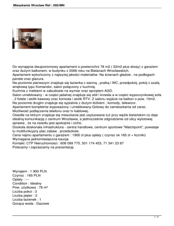 Mieszkanie Wrocław Ref : 095/MN Do wynajęcia dwupoziomowy apartament o powierzchni 78 m2 ( 52m2 plus skosy) z garażem oraz dużym balkonem, w budynku z 2006 roku na Bielanach Wrocławskich. Apartament wykończony z najwyżej jakości materiałów. Na ścianach gładzie , na podłogach panele oraz glazura. Na poziomie pierwszym znajduje się łazienka z wanną , pralką i WC, przedpokój, pokój z szafą wnękową typu Komandor, salon połączony z kuchnią. Kuchnia z meblami w zabudowie na wymiar oraz sprzętem AGD. Salon umeblowany - w części jadalnej znajduje się stół i krzesła a w części wypoczynkowej sofa , 2 fotele i stolik kawowy oraz komoda i stolik RTV. Z salonu wyjście na balkon o pow. 10m2. Na poziomie drugim znajduje się sypialnia z dużym łóżkiem , komody, telewizor. Apartament kompletnie wyposażony i umeblowany.Gotowy do zamieszkania od zaraz. Możliwość podłączenia telefonu oraz tv kablowej. Osiedle na którym znajduje się mieszkanie jest usytuowane tuż przy węźle bielańskim co daje idealną komunikację z centrum Wrocławia, a jednocześnie odgrodzenie od ulicy wylotowej sprawia , że na osiedlu jest spokojnie i cicho. Dookoła doskonała infrastruktura - centra handlowe, centrum sportowe "Matchpoint", powstaje tu multifunkcyjny plac zabaw . przedszkole. Cena najmu apartamentu z garażem : 1900 zł plus opłaty ( czynsz ok 165 zł + liczniki) Wymagana jednomiesięczna kaucja. Kontakt: CTP Nieruchomości : 608 099 775, 501 174 453, 71 341 23 87 Polecamy i zapraszamy na prezentację. Wynajem : 1 900 PLN Czynsz : 165 PLN Opłaty : --Condition : Idealny Pow. użytkowa : 78 m² Liczba pokoi : 3 Liczba pięter : 2 Liczba łazienek : 1 Gorąca woda : Gazowe 1/2 Mieszkanie Wrocław Ref : 095/MN Ogrzewanie : Gazowe Zalety : - garaż prąd woda gaz balkon umeblowane okna plastikowe Adres : Bielany Wrocławskie, WROCłAW http://ctpnieruchomosci.pl/wyszukiwarka-ofert/47-apartament-na-bielanach-wroclawskich?forma t=pdf 2/2