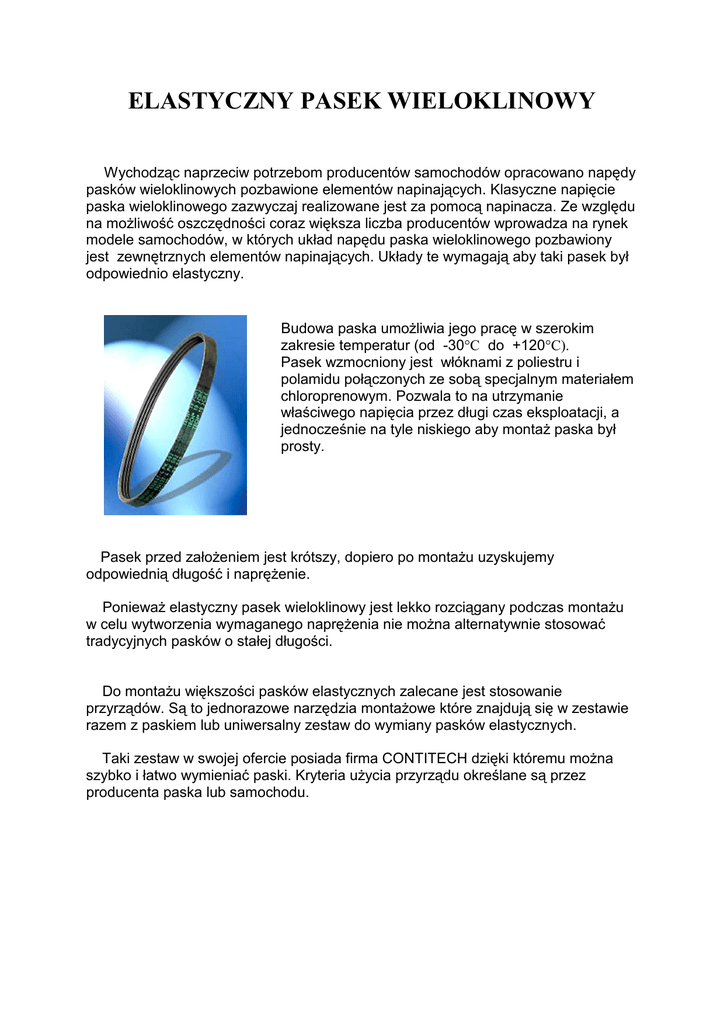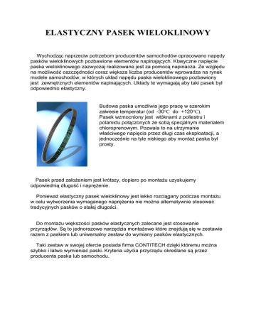 ELASTYCZNY PASEK WIELOKLINOWY Wychodząc naprzeciw potrzebom producentów samochodów opracowano napędy pasków wieloklinowych pozbawione elementów napinających. Klasyczne napięcie paska wieloklinowego zazwyczaj realizowane jest za pomocą napinacza. Ze względu na moŜliwość oszczędności coraz większa liczba producentów wprowadza na rynek modele samochodów, w których układ napędu paska wieloklinowego pozbawiony jest zewnętrznych elementów napinających. Układy te wymagają aby taki pasek był odpowiednio elastyczny. Budowa paska umoŜliwia jego pracę w szerokim zakresie temperatur (od -30°C do +120°C). Pasek wzmocniony jest włóknami z poliestru i polamidu połączonych ze sobą specjalnym materiałem chloroprenowym. Pozwala to na utrzymanie właściwego napięcia przez długi czas eksploatacji, a jednocześnie na tyle niskiego aby montaŜ paska był prosty. Pasek przed załoŜeniem jest krótszy, dopiero po montaŜu uzyskujemy odpowiednią długość i napręŜenie. PoniewaŜ elastyczny pasek wieloklinowy jest lekko rozciągany podczas montaŜu w celu wytworzenia wymaganego napręŜenia nie moŜna alternatywnie stosować tradycyjnych pasków o stałej długości. Do montaŜu większości pasków elastycznych zalecane jest stosowanie przyrządów. Są to jednorazowe narzędzia montaŜowe które znajdują się w zestawie razem z paskiem lub uniwersalny zestaw do wymiany pasków elastycznych. Taki zestaw w swojej ofercie posiada firma CONTITECH dzięki któremu moŜna szybko i łatwo wymieniać paski. Kryteria uŜycia przyrządu określane są przez producenta paska lub samochodu. Narzędzie UNI - TOOL ELAST Numer artykułu 6776956000 PoniŜej przedstawiamy praktyczny przykład zastosowania przyrządu. Umieścić narzędzie między kołem pasowym a paskiem mocno je przytrzymując. Przy pomocy klucza obracamy kołem pasowym. Obracamy kołem do momentu aŜ będzie moŜna wyjąć narzędzie. Sprawdzić czy pasek jest we właściwej pozycji względem zębów na rowkach koła pasowego. W przypadku ponownego uŜycia paska korzystając z zestawu moŜemy go zdemontować. Pomiędzy paskiem wielorowkowym i kołem umieszczamy taśmę z zestawu. (na długości styku paska z kołem). Przy pomocy klucza obracamy kołem pasowym. Pozostały (wolny) koniec taśmy przekładamy za paskiem obejmując go od góry. Następnie ciągniemy w swoim kierunku zdejmując pasek razem z taśmą. W artykule zostały wykorzystane materiały firmy CONTITECH.