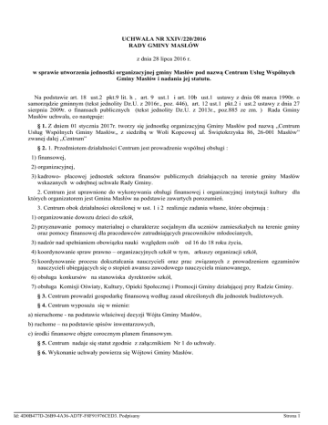 UCHWAŁA NR XXIV/220/2016 RADY GMINY MASŁÓW z dnia 28 lipca 2016 r. w sprawie utworzenia jednostki organizacyjnej gminy Masłów pod nazwą Centrum Usług Wspólnych Gminy Masłów i nadania jej statutu. Na podstawie art. 18 ust.2 pkt.9 lit. h , art. 9 ust.1 i art. 10b ust.1 ustawy z dnia 08 marca 1990r. o samorządzie gminnym (tekst jednolity Dz.U. z 2016r., poz. 446), art. 12 ust.1 pkt.2 i ust.2 ustawy z dnia 27 sierpnia 2009r. o finansach publicznych (tekst jednolity Dz.U. z 2013r., poz.885 ze zm. ) Rada Gminy Masłów uchwala, co następuje: § 1. Z dniem 01 stycznia 2017r. tworzy się jednostkę organizacyjną Gminy Masłów pod nazwą „Centrum Usług Wspólnych Gminy Masłów„ z siedzibą w Woli Kopcowej ul. Świętokrzyska 86, 26-001 Masłów” zwanej dalej „Centrum” § 2. 1. Przedmiotem działalności Centrum jest prowadzenie wspólnej obsługi : 1) finansowej, 2) organizacyjnej, 3) kadrowo- płacowej jednostek sektora finansów publicznych działających na terenie gminy Masłów wskazanych w odrębnej uchwale Rady Gminy. 2. Centrum jest uprawnione do wykonywania obsługi finansowej i organizacyjnej instytucji kultury dla których organizatorem jest Gmina Masłów na podstawie zawartych porozumień. 3. Centrum obok działalności określonej w ust. 1 i 2 realizuje zadania własne, które obejmują : 1) organizowanie dowozu dzieci do szkół, 2) przyznawanie pomocy materialnej o charakterze socjalnym dla uczniów zamieszkałych na terenie gminy oraz pomocy finansowej dla pracodawców zatrudniających pracowników młodocianych, 3) nadzór nad spełnianiem obowiązku nauki względem osób od 16 do 18 roku życia, 4) koordynowanie spraw prawno – organizacyjnych szkół w tym, arkuszy organizacji szkół, 5) koordynowanie procesu dokształcania nauczycieli oraz prac związanych z prowadzeniem egzaminów nauczycieli ubiegających się o stopień awansu zawodowego nauczyciela mianowanego, 6) obsługa konkursów na stanowiska dyrektorów szkół, 7) obsługa Komisji Oświaty, Kultury, Opieki Społecznej i Promocji Gminy działającej przy Radzie Gminy. § 3. Centrum prowadzi gospodarkę finansową według zasad określonych dla jednostek budżetowych. § 4. Centrum wyposaża się w mienie: a) nieruchome - na podstawie właściwej decyzji Wójta Gminy Masłów, b) ruchome – na podstawie spisów inwentarzowych, c) środki finansowe objęte corocznym planem finansowym. § 5. Centrum nadaje się statut zgodnie z załącznikiem Nr 1 do uchwały. § 6. Wykonanie uchwały powierza się Wójtowi Gminy Masłów. Id: 4D0B477D-26B9-4A36-AD7F-F8F91976CED3. Podpisany Strona 1 § 7. Uchwała wchodzi w życie po upływie 14 dni od dnia ogłoszenia w Dzienniku Urzędowym Województwa Świętokrzyskiego. Przewodniczący Rady Gminy Masłów mgr. inż. Sylwester Wojtyna Id: 4D0B477D-26B9-4A36-AD7F-F8F91976CED3. Podpisany Strona 2 Załącznik do Uchwały Nr XXIV/220/2016 Rady Gminy Masłów z dnia 28 lipca 2016 r. STATUT Centrum Usług Wspólnych Gminy Masłów POSTANOWIENIA OGÓLNE § 1. 1. Centrum Usług Wspólnych Gminy Masłów jest jednostką organizacyjną Gminy Masłów działającą na podstawie: 1) ustawy z dnia 8 marca 1990 roku o samorządzie gminnym (tekst jednolity Dz. U. z 2016r. poz.446), 2) ustawy z dnia 27 sierpnia 2009 roku o finansach publicznych (tekst jednolity Dz.U. z 2013r., poz.885 ze zm.), 3) ustawy z dnia 29 września 1994 roku o rachunkowości (tekst jednolity Dz.U. z 2013r., poz.330 ze zm.), 4) niniejszego statutu, 5) innych aktów prawnych. § 2. 1. Siedzibą Centrum jest Wola Kopcowa ul. Świętokrzyska 86, 26-001 Masłów. 2. Centrum prowadzi działalność na terenie Gminy Masłów. § 3. Centrum jest samorządową jednostką budżetową. § 4. Celem działania centrum jest zapewnienie obsługi finansowej, organizacyjnej, kadrowo -płacowej innym jednostkom organizacyjnym zaliczonym do sektora finansów publicznych oraz realizacja zadań własnych jednostki . § 5. Nadzór nad działalnością Centrum sprawuje Wójt Gminy Masłów. § 6. 1. Kierowanie i zarządzanie Centrum powierza się Kierownikowi, który działa na podstawie pełnomocnictwa udzielonego przez Wójta Gminy Masłów oraz obowiązujących przepisów. 2. Nabór na stanowisko Kierownika Centrum przeprowadza Wójt Gminy Masłów. § 7. 1. Centrum jest pracodawcą samorządowym w rozumieniu przepisów prawa pracy. 2. Czynności w sprawach z zakresu prawa pracy wobec pracowników Centrum dokonuje Kierownik. 3. Czynności z zakresu prawa pracy wobec Kierownika wykonuje Wójt Gminy Masłów. PRZEDMIOT DZIAŁALNOŚCI § 8. 1. Centrum zapewnia obsługę finansową, organizacyjną i kadrowo - płacową innym jednostkom organizacyjnym należącym do sektora finansów publicznych, które zostały wskazane przez Radę Gminy w odrębnej uchwale. 2. Centrum jest uprawnione do wykonywania obsługi finansowej i organizacyjnej instytucji kultury dla których organizatorem jest Gmina Masłów na podstawie zawartych porozumień. 3. Centrum zapewnia realizację zadań głównego księgowego jednostkom obsługiwanym. § 9. 1. Centrum obok działalności określonej w §8 realizuje zadania własne jednostki, które obejmują: 1) organizowanie dowozu dzieci do szkół, 2) przyznawanie pomocy materialnej o charakterze socjalnym dla uczniów zamieszkałych na terenie gminy oraz pomocy finansowej dla pracodawców zatrudniających pracowników młodocianych, 3) nadzór nad spełnianiem obowiązku nauki względem osób od 16 do 18 roku życia, Id: 4D0B477D-26B9-4A36-AD7F-F8F91976CED3. Podpisany Strona 1 4) koordynowanie spraw prawno – organizacyjnych szkół w tym, arkuszy organizacji szkół, 5) koordynowanie procesu dokształcania nauczycieli oraz prac związanych z prowadzeniem egzaminów nauczycieli ubiegających się o stopień awansu zawodowego nauczyciela mianowanego, 6) obsługę konkursów na stanowiska dyrektorów szkół. 2. Centrum w ramach zadań własnych zapewnia obsługę Komisji Oświaty, Kultury, Opie