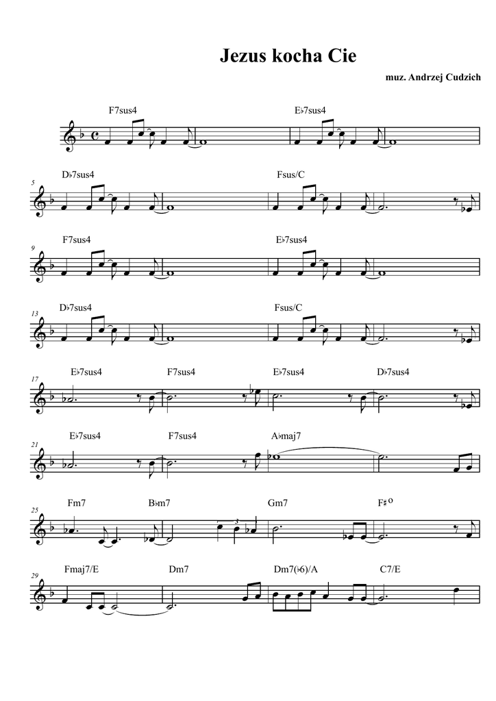 Jezus kocha Cie muz. Andrzej Cudzich E b7sus4 F7sus4 j & b c œ œ œ œJ œ œ w D b7sus4 &b œ 5 œ œ œJ œ j œ w D b7sus4 &b œ 13 j œ w F7sus4 &b œ 9 œ œ Jœ œ œ œ œ Jœ E b7sus4 & b b˙. 17 E b7sus4 & b b˙. 21 Fm7 & b bœ. 25 Fmaj7/E &b œ 29 j œ œ. œ œ ˙ j œ w F7sus4 ‰ œ ˙. J F7sus4 ‰ œ ˙. J B bm7 j bœ ˙ Dm7 ˙. j œ œ œ œJ œ œ w Fsus/C œ œ œ Jœ j œ ˙. œ œ œJ œ j œ w œ E b7sus4 œ Fsus/C œ œ œ œ Jœ E b7sus4 ‰ b œJ ˙ . A bmaj7 œ ‰ J bw Gm7 œ œ3 b œ ˙ . Dm7( b6)/A œ œ œ œ œ œ œ j œ ˙. D b7sus4 ‰ œ ˙. J ˙. F# o bœ œ ˙. C7/E œ œ ˙. ‰ j bœ ‰ b œj ‰ j bœ œ œ ‰ œj œ 2 F/A &b œ 33 j œ œ œ œ Bmaj7 C/E & b ˙. 37 &b 41 œ D b7sus4 œ œ œ Jœ œ œ Jœ F7sus4 œ œ œ Jœ D b7sus4 &b œ 56 Am7 œ œ ˙. œ œ ˙. œ œ œ œ ˙. F7sus4 &b œ 52 Gm7 œ Fmaj7/A œ œ œ Jœ j œ w j œ w j œ w j œ w œ œ ˙. Bmaj7 œ œ ˙. E b7sus4 œ œ œ Jœ j œ w œ œ Jœ j œ w œ œ œ Jœ j œ w œ Fsus/C œ œ E b7sus4 œ Fsus/C œ œ œ œ Dm7 ˙. Am7 ˙. &b œ 48 œ œ œ Gm7 &b œ 44 j œ ˙. Dm7 œ œ Jœ j œ w œ œ œ œ