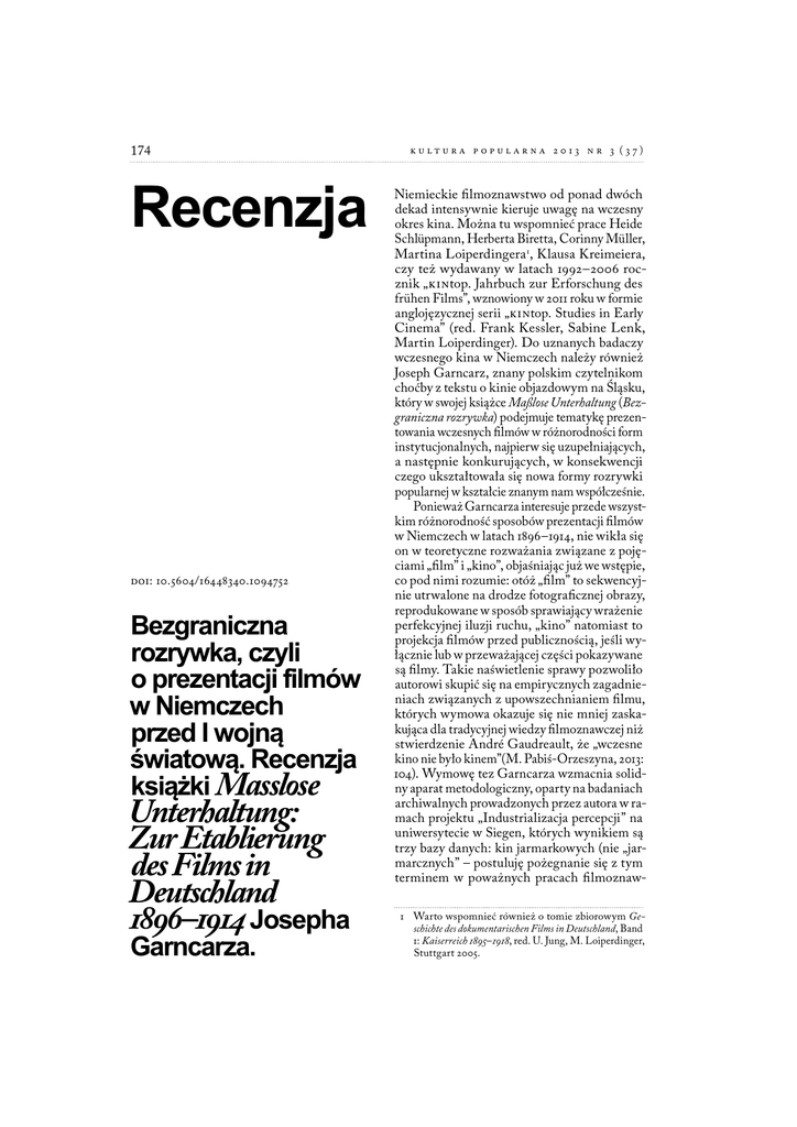 174 kultura popularna 2013 nr 3 (37) !"!#$%& DOI: 10.5604/16448340.1094752 '!$()&#*"$#&+ ),$)-./&0+"$-1*+ ,+2)!$!#3&"%*+4*156.+ .+7*!5"$!"8+ 2)$!9+ !.,%#:+ ;.*&3,.:<+ !"!#$%&+ /=*:>/*+Masslose Unterhaltung: Zur Etablierung des Films in Deutschland 1896–1914 ?,=!28&+ @&)#"&)$&< Niemieckie filmoznawstwo od ponad dwóch dekad intensywnie kieruje uwagę na wczesny okres kina. Można tu wspomnieć prace Heide Schlüpmann, Herberta Biretta, Corinny Müller, Martina Loiperdingera 1, Klausa Kreimeiera, czy też wydawany w latach 1992 – 2006 rocznik „KINtop. Jahrbuch zur Erforschung des frühen Films”, wznowiony w 2011 roku w formie anglojęzycznej serii „KINtop. Studies in Early Cinema” (red. Frank Kessler, Sabine Lenk, Martin Loiperdinger). Do uznanych badaczy wczesnego kina w Niemczech należy również Joseph Garncarz, znany polskim czytelnikom choćby z tekstu o kinie objazdowym na Śląsku, który w swojej książce Maßlose Unterhaltung (Bezgraniczna rozrywka) podejmuje tematykę prezentowania wczesnych filmów w różnorodności form instytucjonalnych, najpierw się uzupełniających, a następnie konkurujących, w konsekwencji czego ukształtowała się nowa formy rozrywki popularnej w kształcie znanym nam współcześnie. Ponieważ Garncarza interesuje przede wszystkim różnorodność sposobów prezentacji filmów w Niemczech w latach 1896 – 1914, nie wikła się on w teoretyczne rozważania związane z pojęciami „film” i „kino”, objaśniając już we wstępie, co pod nimi rozumie: otóż „film” to sekwencyjnie utrwalone na drodze fotograficznej obrazy, reprodukowane w sposób sprawiający wrażenie perfekcyjnej iluzji ruchu, „kino” natomiast to projekcja filmów przed publicznością, jeśli wyłącznie lub w przeważającej części pokazywane są filmy. Takie naświetlenie sprawy pozwoliło autorowi skupić się na empirycznych zagadnieniach związanych z upowszechnianiem filmu, których wymowa okazuje się nie mniej zaskakująca dla tradycyjnej wiedzy filmoznawczej niż stwierdzenie André Gaudreault, że „wczesne kino nie było kinem”(M. Pabiś-Orzeszyna, 2013: 104). Wymowę tez Garncarza wzmacnia solidny aparat metodologiczny, oparty na badaniach archiwalnych prowadzonych przez autora w ramach projektu „Industrializacja percepcji” na uniwersytecie w Siegen, których wynikiem są trzy bazy danych: kin jarmarkowych (nie „jarmarcznych” – postuluję pożegnanie się z tym terminem w poważnych pracach filmoznaw1 Warto wspomnieć również o tomie zbiorowym Geschichte des dokumentarischen Films in Deutschland, Band 1: Kaiserreich 1895 – 1918, red. U. Jung, M. Loiperdinger, Stuttgart 2005. recenzja czych 2) działających w Niemczech i częściowo w państwach ościennych, filmów wyświetlanych w Niemczech (w większości będących wynikiem archeologii czasopiśmienniczej Biretta) oraz programów kinowych z wybranych miejscowości 3. Zebranie tak obfitego materiału źródłowego i jego ocena możliwe były dzięki pomocy blisko dwudziestu magistrantek i magistrantów, co pokazuje też, z jak inspirującymi i poważnymi zadaniami konfrontowani są niemieccy studenci i jak wielkim darzy się ich zaufaniem (z pozytywnym skutkiem). Książka Garncarza, obok wstępu i zakończenia, składa się z ośmiu rozdziałów, które można sprowadzić do trzech głównych części: projekcje filmowe w ramach składankowych programów w teatrach variétés (międzynarodowych oraz lokalnych), projekcje kin objazdowych (jarmarkowych oraz salowych – te drugie nie przewoziły wyposażenia niezbędnego do postawienia budynku kinowego), jak też kin stacjonarnych (sklepowych, kinoteatrów oraz pałaców kinowych). Dla każdego z typów autor określa brzegowe (bogate w kulturowe i ekonomiczne odniesienia) warunki działania, sposoby organizacji seansów z analizą przykładowych programów, jak też dystynkcje publiczności. Ostatni z rozdziałów koncentruje się na zaniku projekcji filmowych w teatrach variétés oraz stopniowym wypieraniu z rynku kin objazdowych pod wpływem konkurencji kin stacjonarnych, co nastąpiło (dopiero!) po 1910 roku, gdy te ostatnie zaczęły powstawać w mniejszych miejscowościach. Z racji określonej dostępności źródeł (czasopism branżowych, lokalnej prasy i archiwów komunalnych) najobszerniejsze i najbardziej wymowne poznawczo (także z uwagi na skwantyfikowanie zagadnień) są rozdziały poświęcone międzynarodowym teatrom variétés, kinom jarmarkowym oraz kinoteatrom. I tak, dla przykładu, autor dochodzi do konkluzji, że 2 Stosowane w polskiej literaturze przedmiotu określenie „kino jarmarczne“ jest niezbyt szczęśliwą kalką niemieckiego „Jahrmarktkino”. O ile niemiecki termin odnosi się do jarmarku i ma charakter opisowy, to polskie wyrażenie ma charakter wartościujący – oznacza także „pozbawiony dobrego smaku, tandetny” (Słownik Języka Polskiego http://sjp.pl/, dostęp: 17.12.2013). Wobec powyższego postuluję stosowanie terminu „kino jarmarkowe”, które nie jest nacechowane wartościująco, a przez to nie zniekształca (wypacza) obrazu tej formy kina. 3 Zob. http://www.earlycinema.uni-koeln.de/, dostęp: 17.12.2013. 175 już „relacje optyczne” w teatrach variétés około 1900 roku opowiadały kompleksowe historie, jeśli tylko odniesiemy je do całych programów, a nie pojedynczych filmów; że najlepsze kina jarmarkowe kojarzyły się ówczesnym widzom z okazałymi teatrami miejskimi, a ich właściciele zarabiali pieniądze porównywalne z pensjami ministerialnymi; że rozwój systemu dystrybucji filmowej warunkowany był przez boom kin stacjonarnych, a nie odwrotnie; że widownię kin jarmarkowych około 1905 roku można szacować nawet na 67 milionów widzów (przy 60 milionach mieszkańców Niemiec), a publiczność kin stacjonarnych przed wybuchem wojny aż na 250 milionów. Już tylko wspomniane liczby świadczą o olbrzymim sukcesie kina, które przez wiele lat