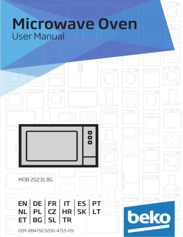 Microwave Oven User Manual MOB 20231 BG EN DE FR IT ES PT NL PL CZ HR SK LT ET BG SL TR 01M-8847923200-4715-09 Proszę najpierw przeczytać tę instrukcję obsługi! Drodzy Klienci, Dziękujemy za wybór wyrobu marki Beko. Mamy nadzieję, że wyrób ten, wyprodukowany przy użyciu wysokiej jakości najnowszej technologii, okaże się w najwyższym stopniu zadowalający. Dlatego proszę przed jego użyciem uważnie przeczytać całą tę instrukcję obsługi i towarzyszące jej dokumenty i zachować ją do wglądu na przyszłość. Przy przekazaniu tego wyrobu komuś innemu, proszę oddać mu także tę instrukcję. Proszę przestrzegać wszystkich ostrzeżeń i informacji z tej instrukcji obsługi. Znaczenie symboli W różnych rozdziałach niniejszej instrukcji stosuje się następujące symbole: C A Ważne informacje i przydatne wskazówki dotyczące użytkowania. Ostrzeżenia dotyczące sytuacji zagrażających bezpieczeństwu, życiu i mieniu. Ostrzeżenie przed gorącymi powierzchniami. Urządzenie zostało wyprodukowane w nowoczesnych, bezpiecznych dla środowiska zakładach bez wpływu na przyrodę. Urządzenie jest zgodne z dyrektywą WEEE. Nie zawiera bifenyli polichlorowanych (PCB). SPIS TREŚCI 1 Ważne instrukcje dotyczące bezpieczeństwa i ochrony środowiska naturalnego 149 4.9 Funkcja zapytania............................................... 164 4.10 Blokada zabezpieczająca przed dziećmi ............................................................... 164 1.1 Bezpieczeństwo: Zasady ogólne .................. 149 1.1.1 Bezpieczeństwo: Elektryczność................. 151 1.1.2 Bezpieczeństwo: Wyrób ................................ 152 1.2 Przeznaczenie ...................................................... 153 1.3 Bezpieczeństwo: Dzieci .................................... 153 1.4 Zgodność z dyrektywą WEEE i pozbywanie się zużytych wyrobów ................... 154 1.5 Informacje o opakowaniu ................................ 154 5 Czyszczenie i konserwacja 2 Twoja kuchenka mikrofalowa 165 5.1 Czyszczenie............................................................ 165 5.2 Przechowywanie................................................. 165 6 Rozwiązywanie problemów 166 155 2.1 Opis ogólny ............................................................ 155 2.1.1 Elementy sterujące i części ......................... 155 2.1.2 Dane techniczne .............................................. 155 2.1.3 Zakładanie talerza obrotowego ................ 156 3 Montaż i podłączenie 157 3.1 Montaż i podłączenie ......................................... 157 3.2 Zakłócenia radiowe ............................................ 158 3.3 Zasady gotowania w kuchence mikrofalowej ................................................................. 158 3.4 Instrukcje uziemiania ........................................ 158 3.5 Test przyborów .................................................... 159 4 Obsługa 160 4.1 Panel sterowania................................................. 160 4.2 Instrukcje obsługi ............................................... 160 4.2.1 Ustawianie czasu ............................................ 160 4.2.2 Gotowanie w kuchence mikrofalowej .... 160 4.2.3 Instrukcje korzystania z klawiatury kuchenki mikrofalowej ............................................. 161 4.3 Szybki start ........................................................... 161 4.4 Rozmrażanie według wagi.............................. 162 4.5 Rozmrażanie według czasu ............................ 162 4.6 Czasomierz kuchenny (licznik) ...................... 162 4.7 Menu automatyczne ......................................... 162 4.7.1 Menu gotowania automatycznego.......... 163 4.8 Gotowanie wieloetapowe............................... 164 148 330 PL Kuchenka mikrofalowa / Instrukcja obsługi Ważne instrukcje dotyczące bezpieczeń1 stwa i ochrony środowiska naturalnego Rozdział ten zawiera instrukcje zachowania bezpieczeństwa, które pomogą chronić się przed ryzykiem pożaru, porażenia prądem elektrycznym, wycieku mikrofal, obrażeniami ciała lub szkodami w mieniu. Nieprzestrzeganie tych instrukcji unieważnia udzielone gwarancje. t t 1.1 Bezpieczeństwo: Zasady ogólne t t t Nie próbuj uruchamiać kuchenki, kiedy jej drzwiczki są otwarte; w ten sposób możesz narazić się na działanie szkodliwego promieniowania mikrofalowego. Nie należy wyłączać blokad ani przy nich manipulować. Nie wkładaj żadnych przedmiotów między przód na drzwiczki kuchenki. Nie dopuść do gromadzenia się zabrudzeń lub pozostałości środków czystości na powierzchniach zamykających. Wszystkie prace serwisowe wymagające zdjęcia pokrywy chroniącej przed ekspozycją na promieniowanie mikrofalowe muszą być wykonywane przez autoryzowane osoby/serwis. Każdy inny sposób postępowania jest niebezpieczny. Kuchenka mikrofalowa / Instrukcja obsługi t t t t Produkt jest przeznaczony do gotowania, podgrzewania i rozmrażania żywności w warunkach domowych. Nie należy go używać do celów komercyjnych. Producent nie ponosi żadnej odpowiedzialności za szkody wynikłe z nieprawidłowego użytkowania. Nie używaj tego urządzenia na zewnątrz, w łazience, wilgotnym środowisku lub w miejscach, gdzie może ono ulec zamoczeniu. Producent nie ponosi odpowiedzialności ani nie udziela żadnej gwarancji w przypadku szkód poniesionych z powodu nieprawidłowego użytkowania urządzenia lub nieprawidłowego obchodzenia się z nim. Nigdy nie należy próbować rozkładać tego urządzenia na części. Gwarancja na urządzenie nie obejmuje uszkodzeń spowodowanych nieprawidłowym obchodzeniem się z nim. Należy stosować wyłącznie oryginalne lub zalecane przez producenta części zamienne. Nie wolno zostawiać tego urządzenia bez dozoru, gdy jest używane. 149 / 330 PL Ważne instrukcje dotyczące bezpieczeń1 stwa i ochrony środowiska naturalnego t t t t t t t Zawsze używaj tego urządzenie 